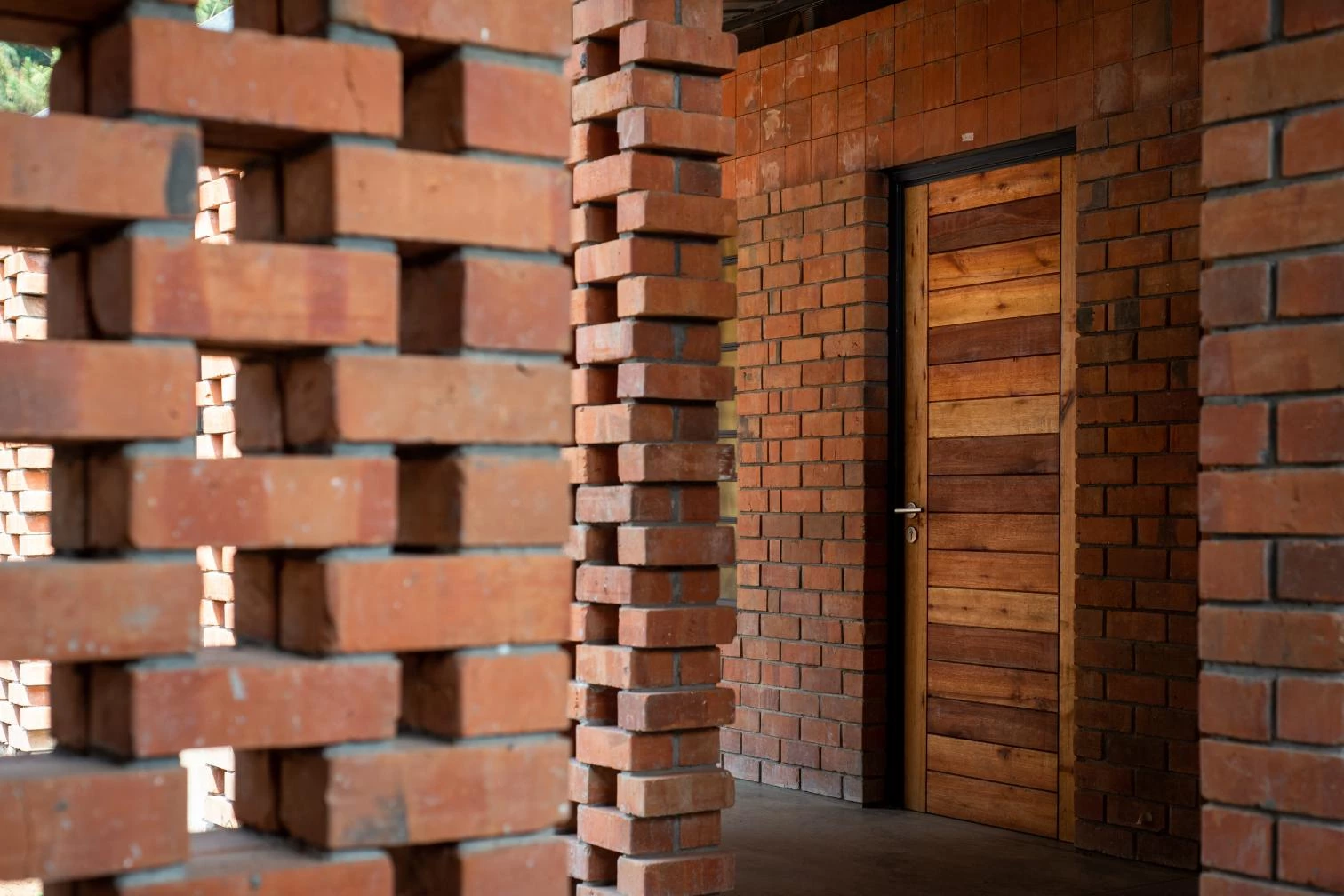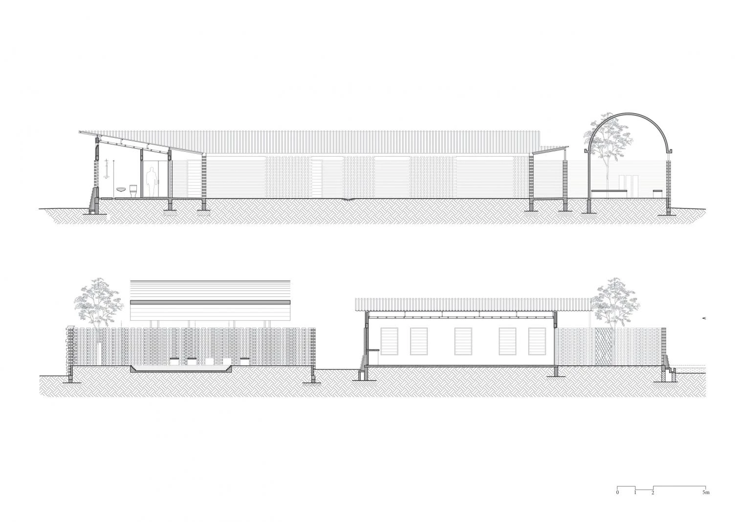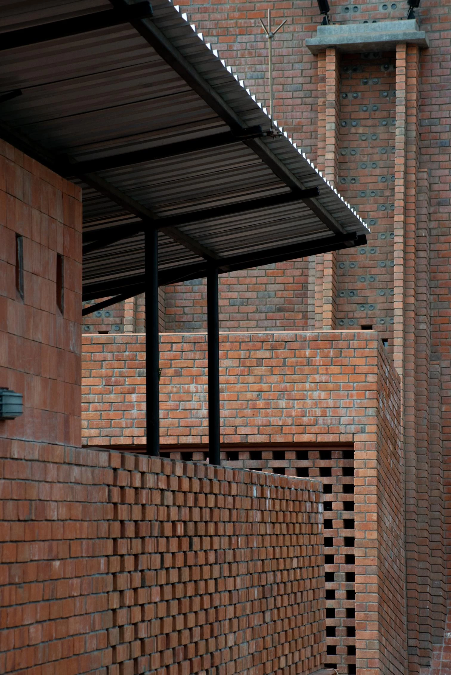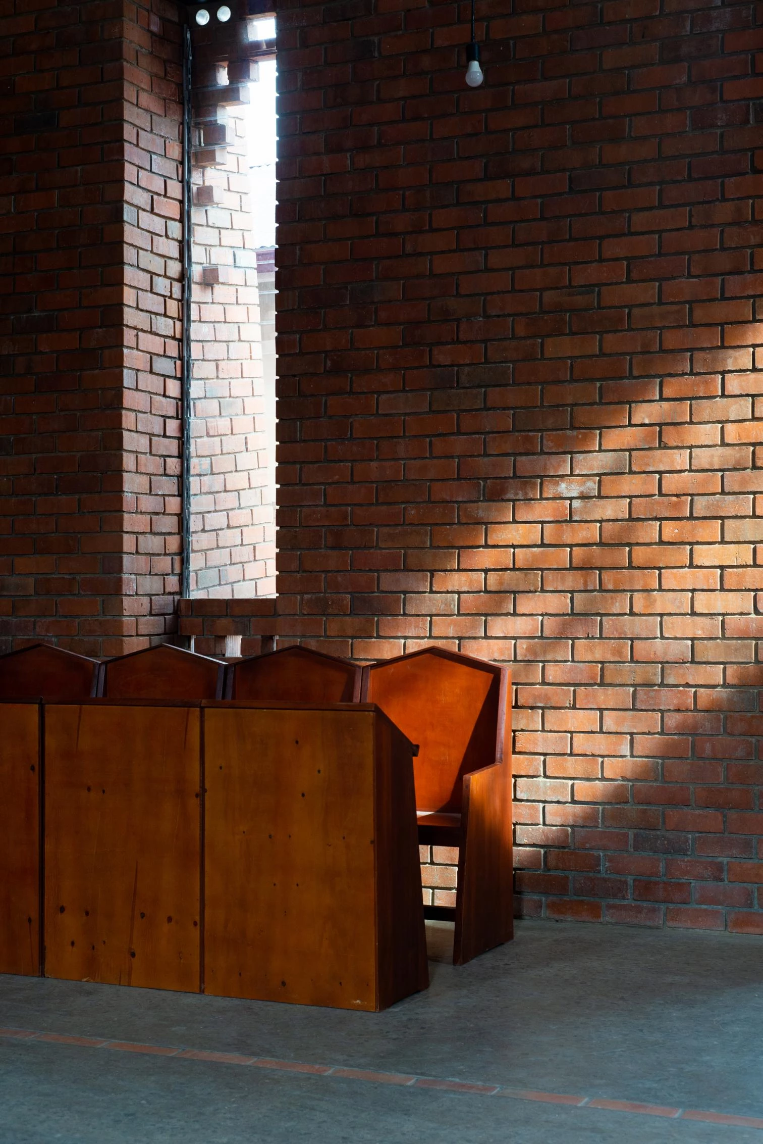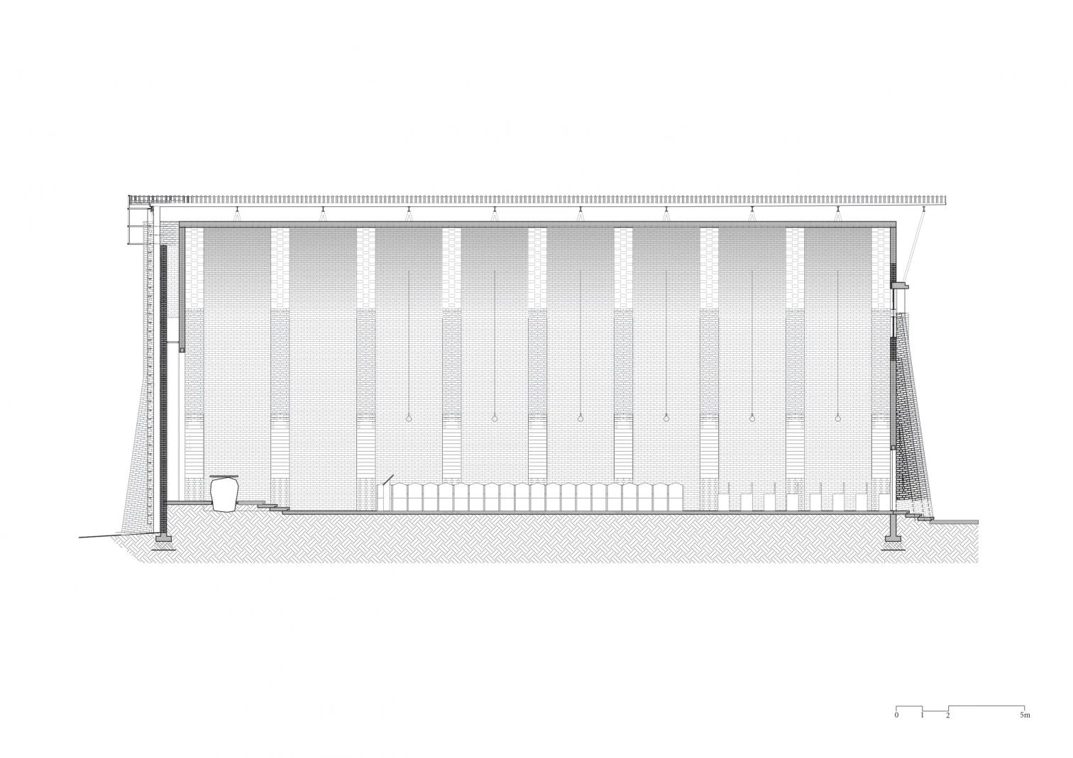 Parapetada bajo una amplia cubierta ventilada, la iglesia es un volumen longitudinal definido por una bóveda de cañón que intercala franjas de ladrillos cocidos con cáscaras de café y piezas de vidrio incrustadas que permiten la entrada de luz.