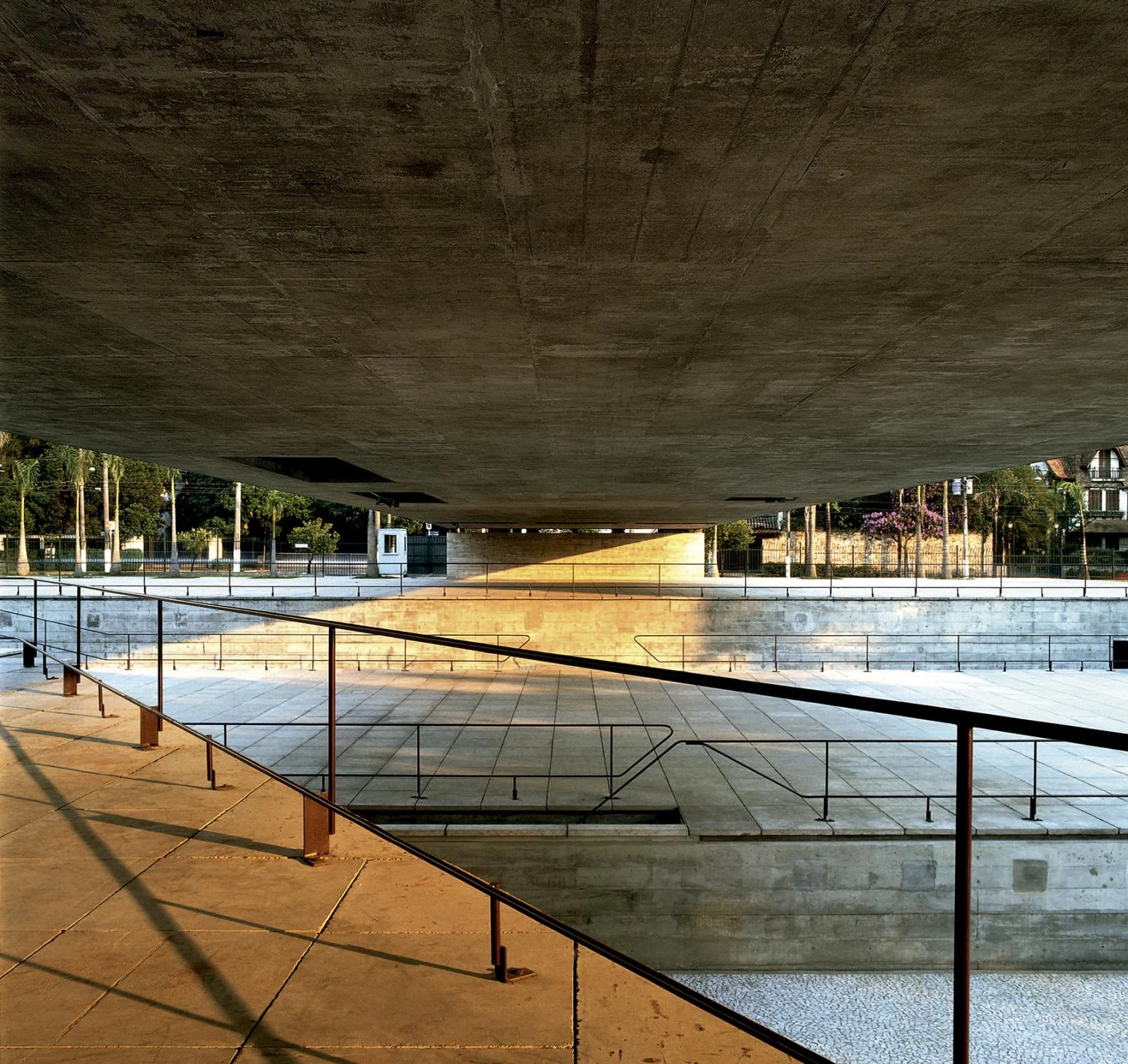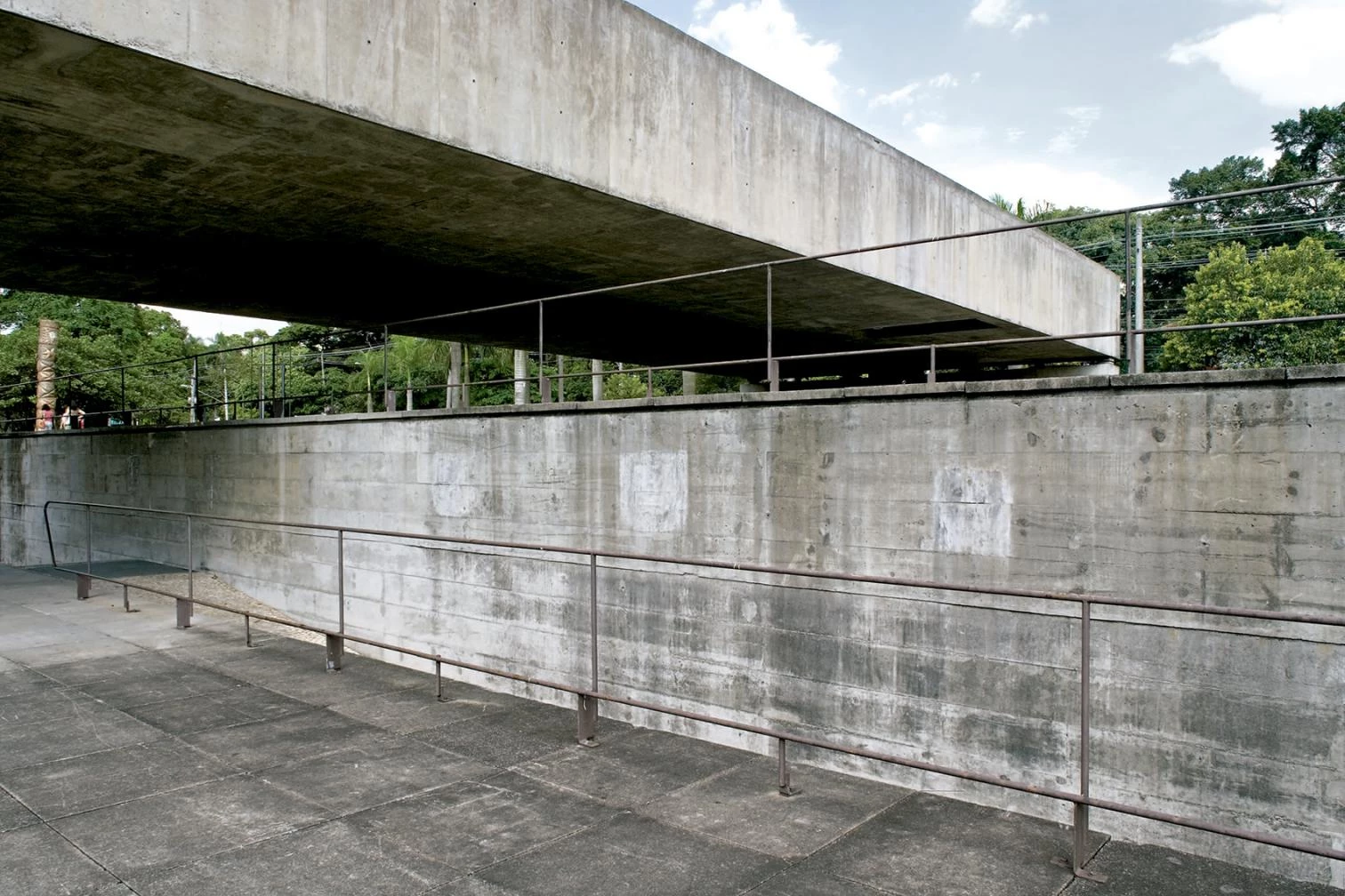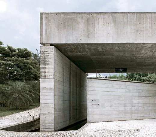 Bajo una gran losa de hormigón que arroja sombra, el Museo Brasileño de Escultura se desarrolla a lo largo de una serie de plataformas semisubterráneas que dirigen al visitante desde el exterior al interior de forma continua. Situado en un barrio residencial cuya normativa urbanística deriva de algunos principios de la ciudad-jardín, el proyecto se basa en la construcción de un paisaje artificial y se inserta en una área verde diseñada por el paisajista Burle Marx. Aprovechando el desnivel de la parcela, el museo queda oculto desde la avenida Europa y tan sólo se percibe el perfil del pórtico que se eleva hasta la altura de las casas vecinas.