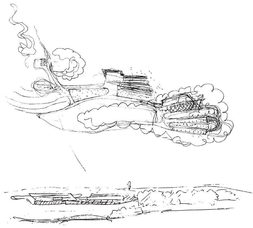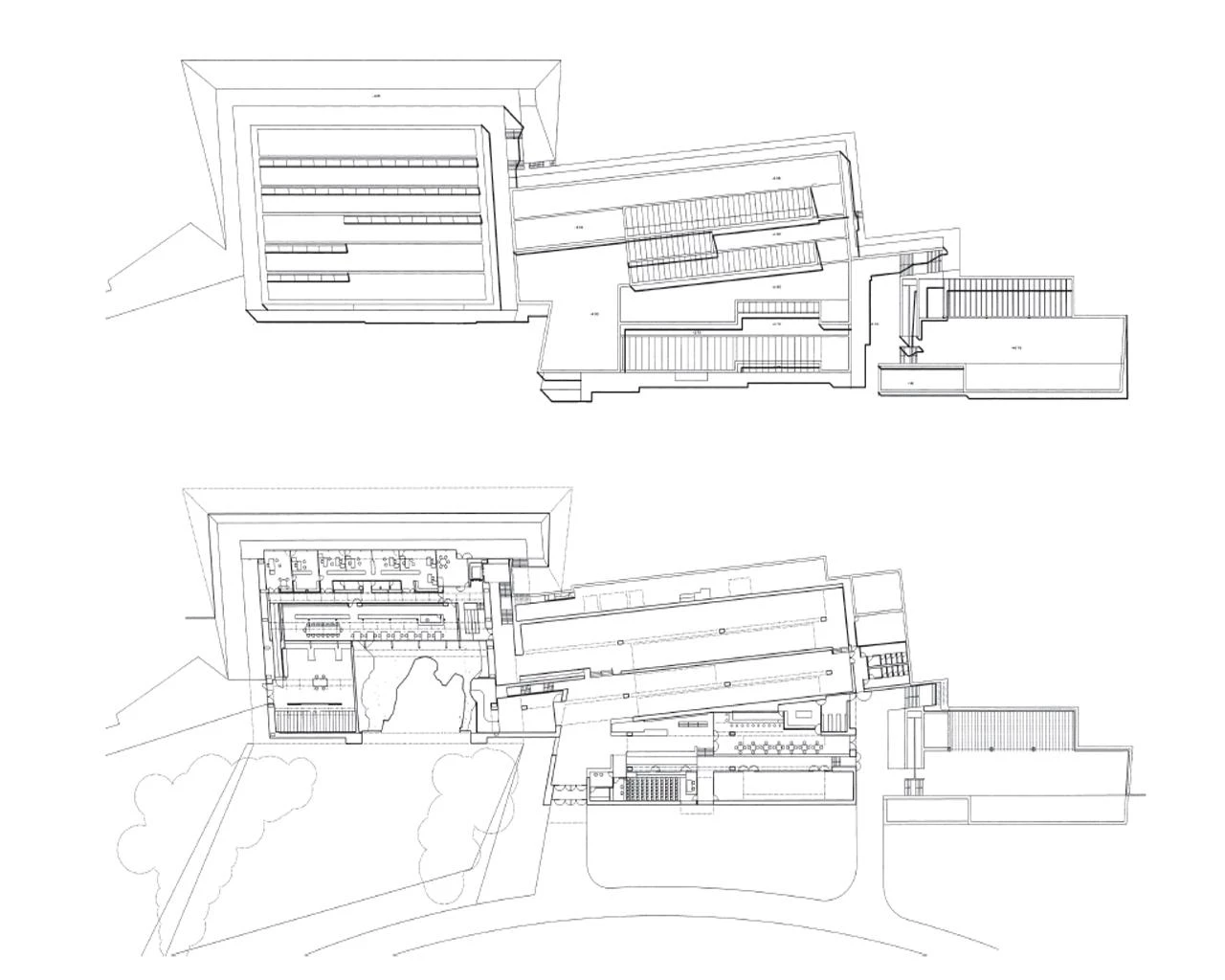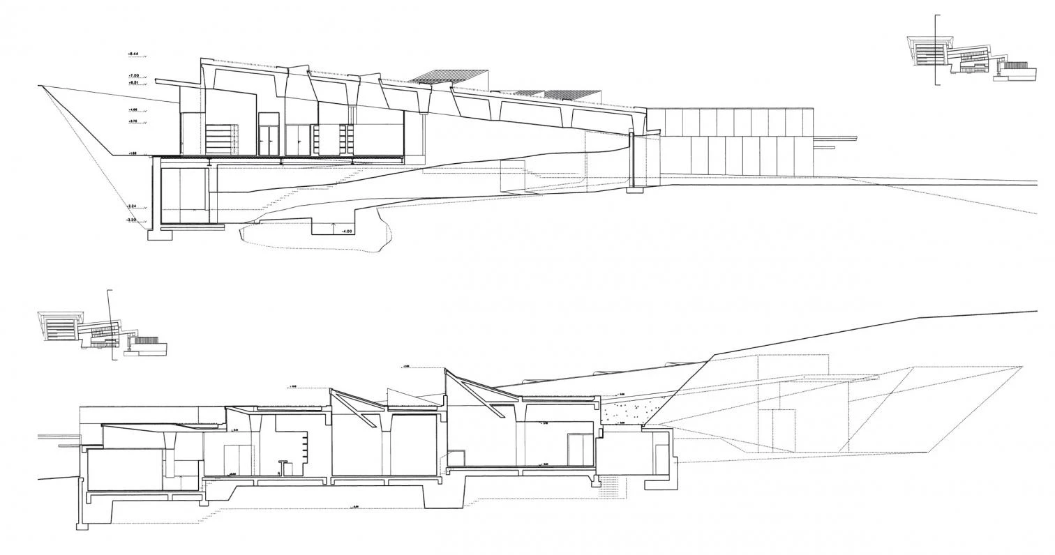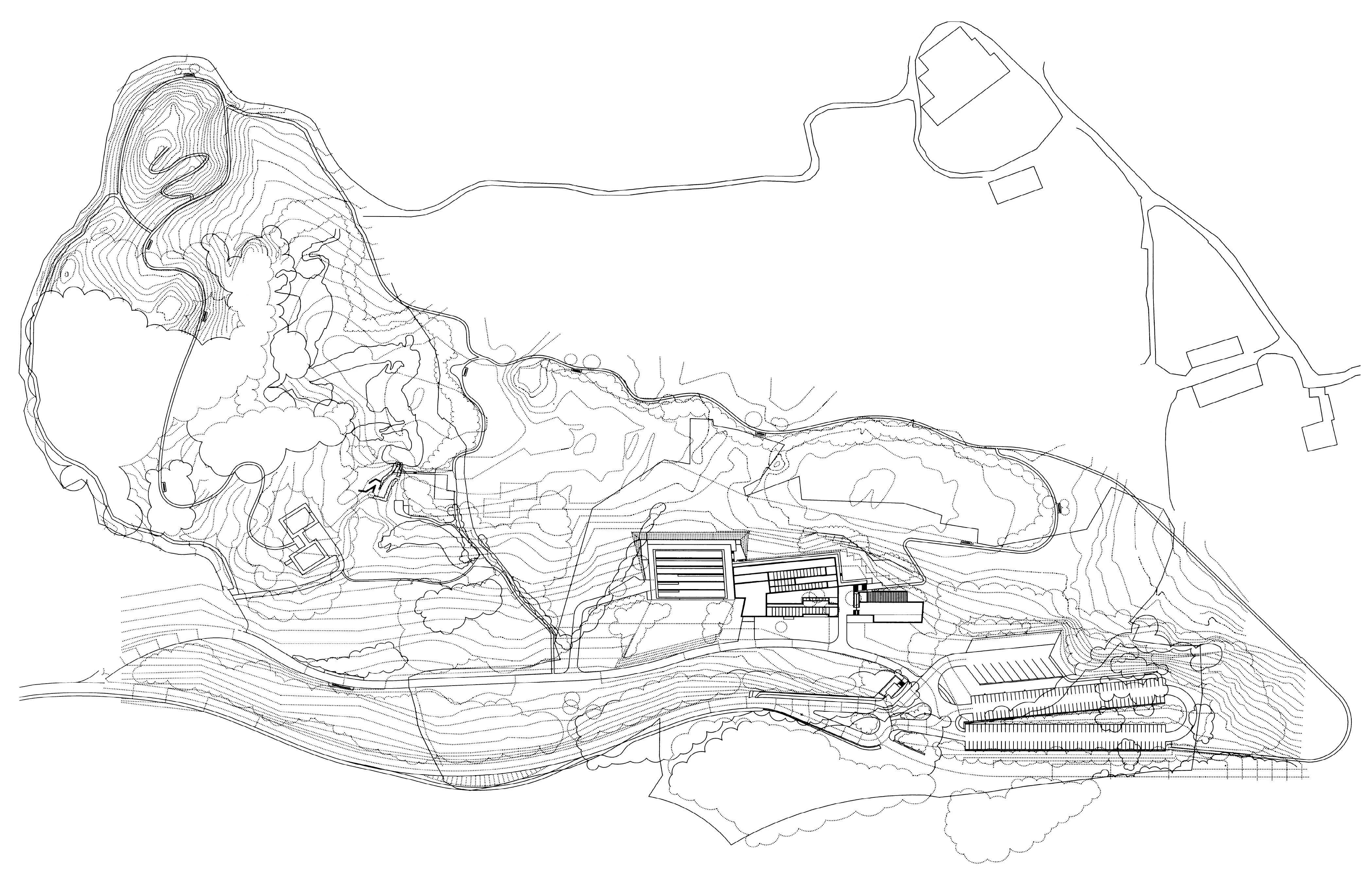 Para no perturbar la panorámica de la loma, la construcción nace y se hace desde el suelo, manipulando y restituyendo el trozo de colina en la que se asienta. Para minimizar su impacto visual, el extenso programa se divide así en dos cuerpos —correspondientes a la zona de exposición y al centro de investigación— que repiten con sus cubiertas ajardinadas el perfil de la ladera. El centro de investigación se ubica sobre la réplica de las pinturas en un cuerpo de proporciones casi cuadradas que converge con tres galerías desplegadas a distinto nivel donde se ubican los fondos expositivos, la cafetería, la tienda y un pequeño salón de actos. Una serie de lucernarios lineales emergen paralelos a las curvas de nivel, como si la corteza vegetal hubiese sido cuidadosamente levantada para introducir la luz del norte en las salas excavadas en la roca. En el punto de unión entre ambos volúmenes se ubica la entrada, conectando con el camino que recorre la cota inferior de la parcela y termina en un aparcamiento oculto entre el arbolado.