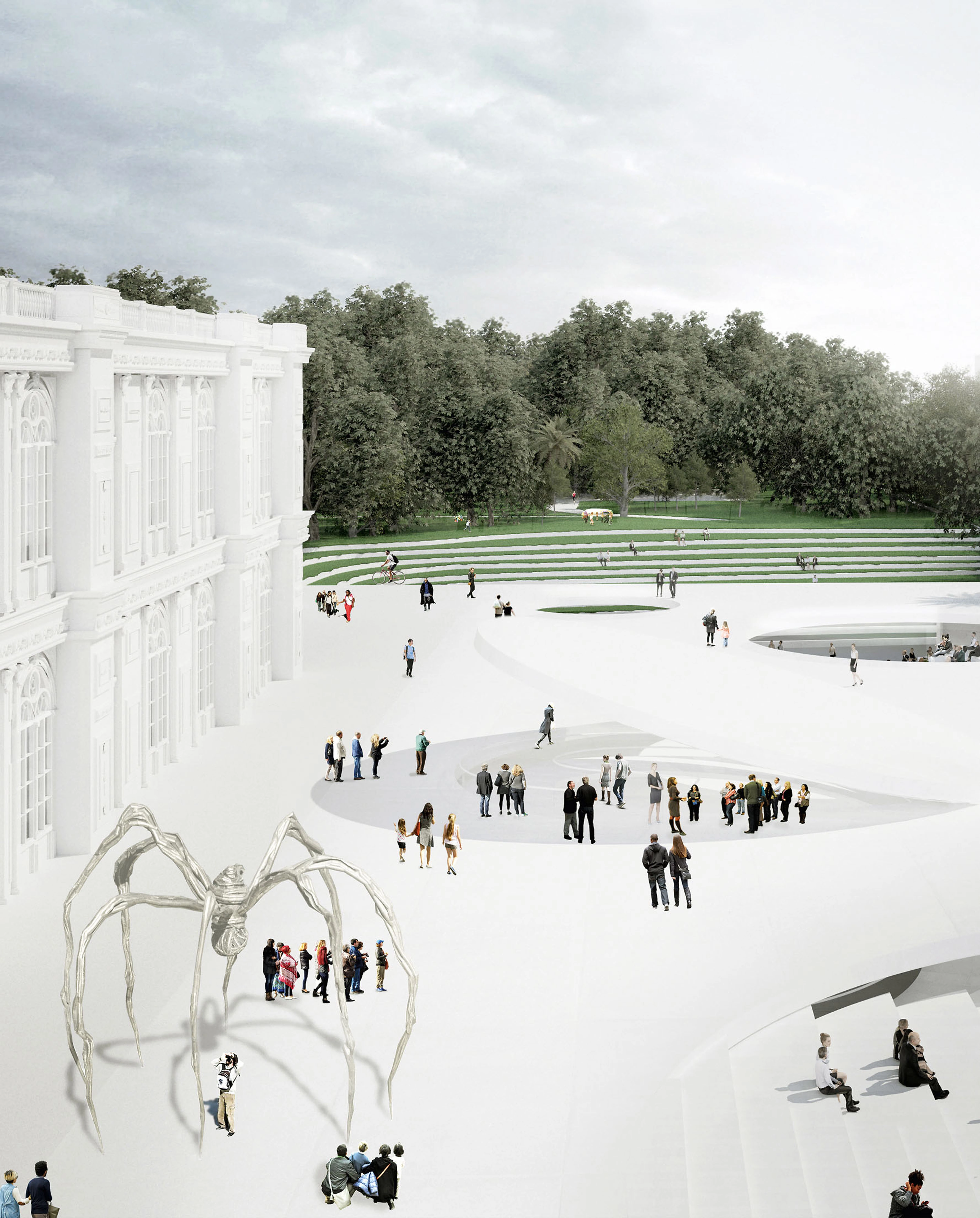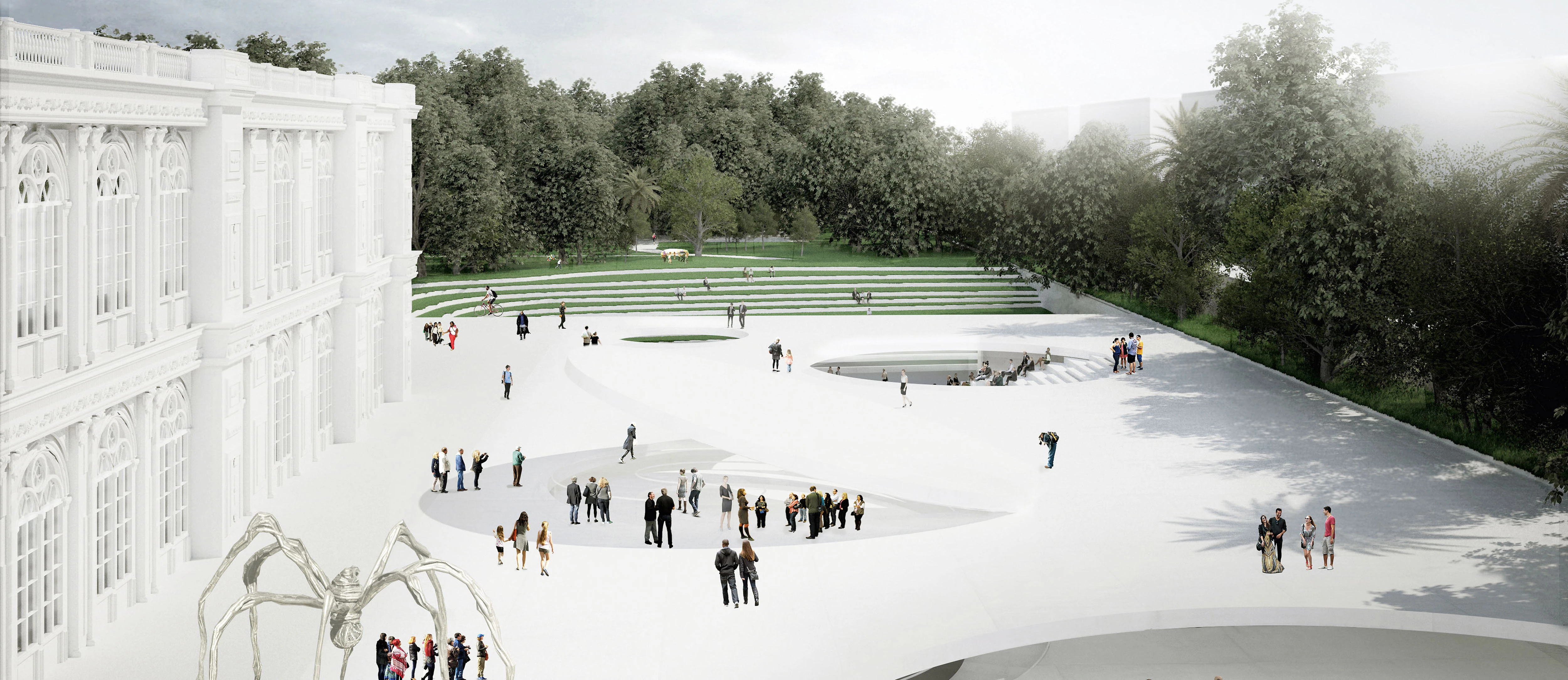 La ampliación se entiende como una continuación del parque y como una intervención topográfica que sirve de podio para el edificio original; en la superficie, tres plazas circulares definen tres espacios públicos abiertos a la apropiación ciudadana... [+]