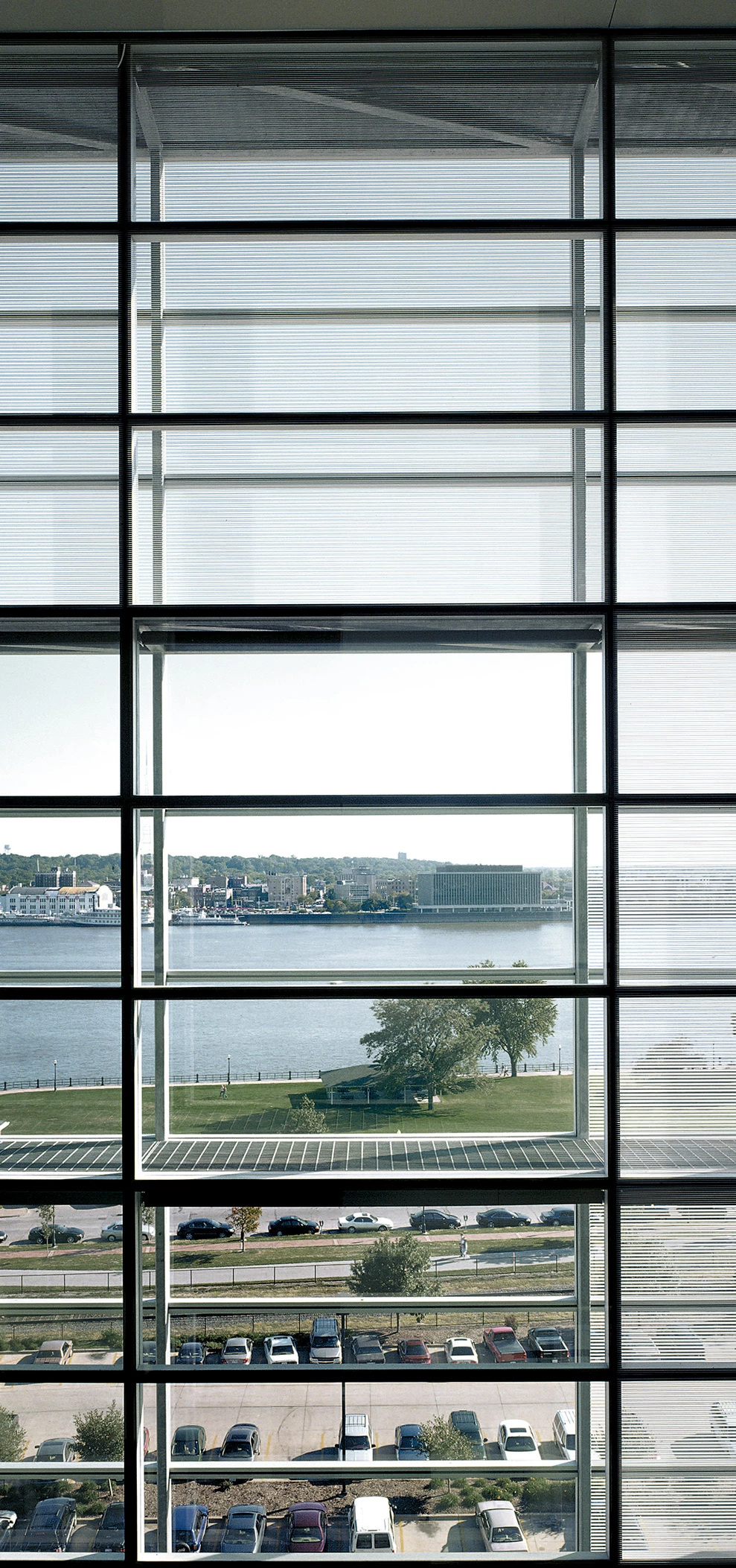 La necesidad de crear un edificio emblemático cristalizó en el diseño de una estructura monolítica de vidrio, capaz de encarnar, de un modo simple pero potente, el proceso de regeneración del frente fluvial. Su arquitectura se basa en la idea de un volumen puro envuelto por una doble capa de vidrio opaco, transparente y translúcido; la primera capa asegura el control térmico, mientras que la segunda, con un marcado despiece horizontal, actúa como una pantalla frente a la lluvia y el viento.