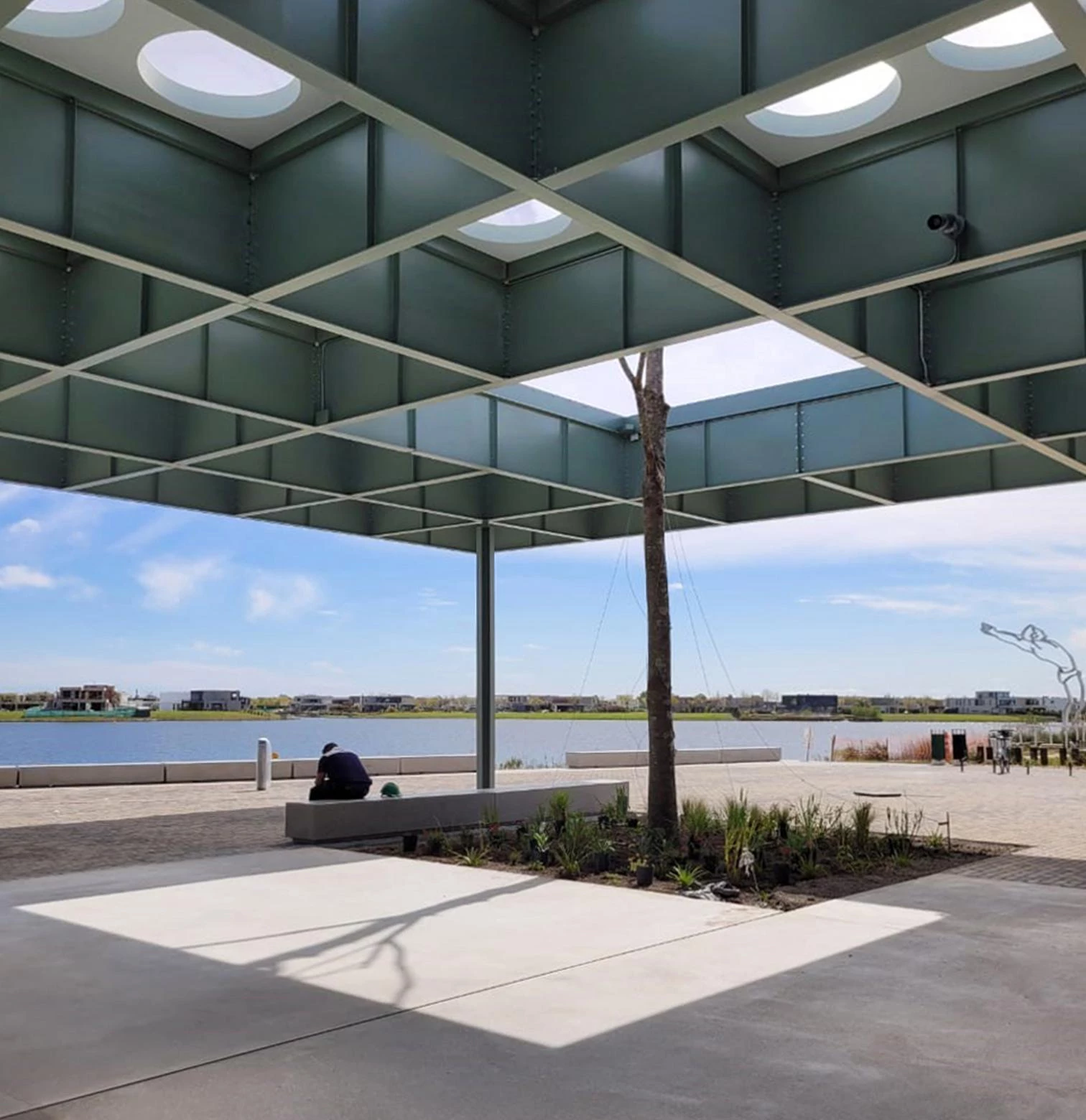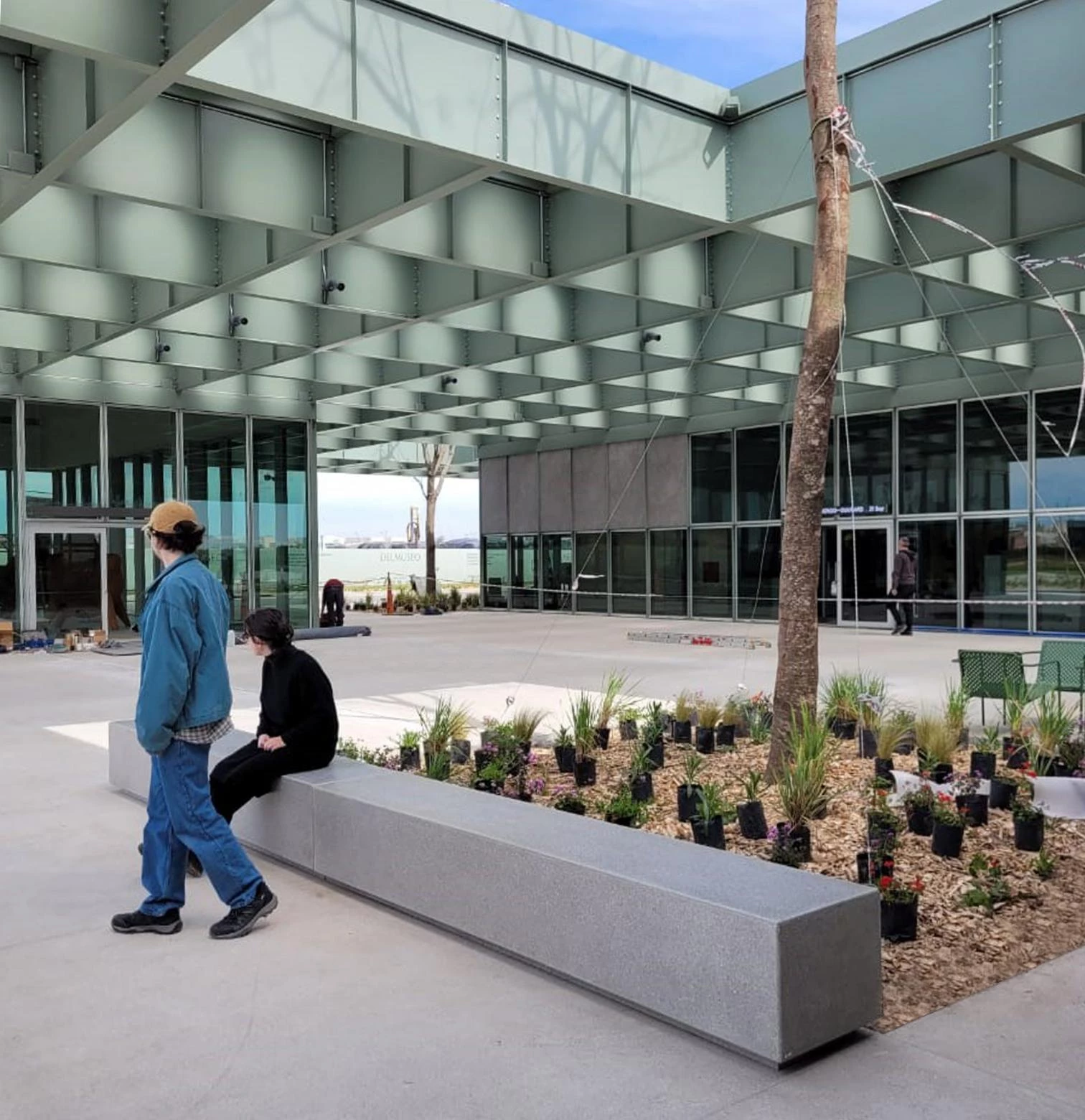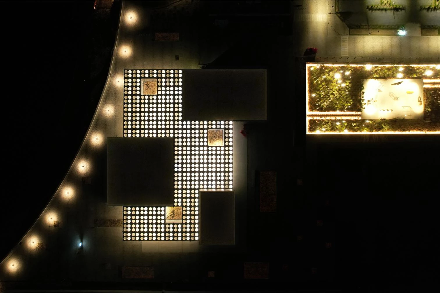 Atravesada por tres árboles de gran tamaño, esta misma cubierta perforada y formada por una retícula de vigas de acero permite el acceso de luz a tres plazas que, a modo de museo abierto, da cobijo a diferentes eventos, actividades educativas y exposiciones.