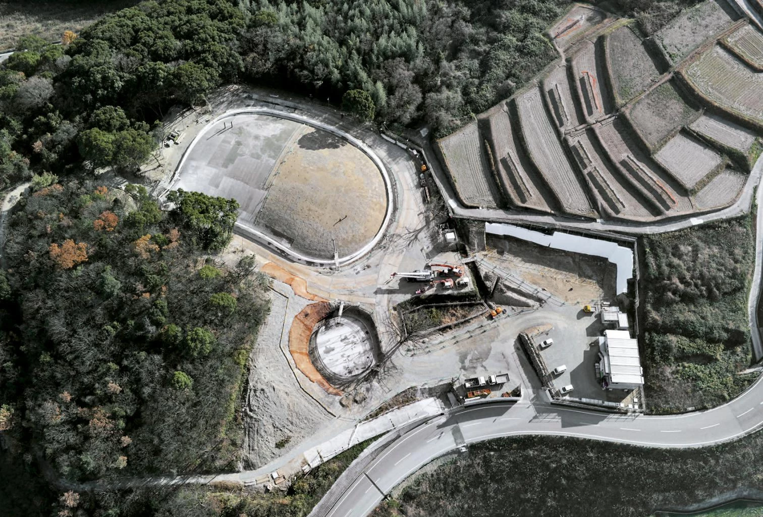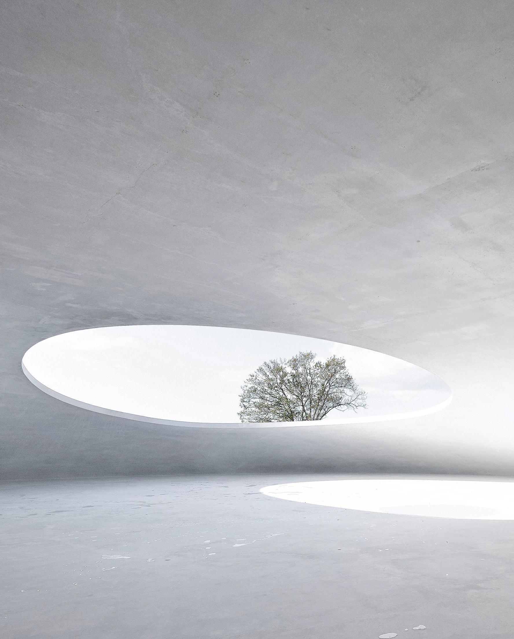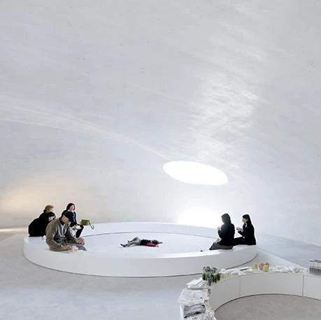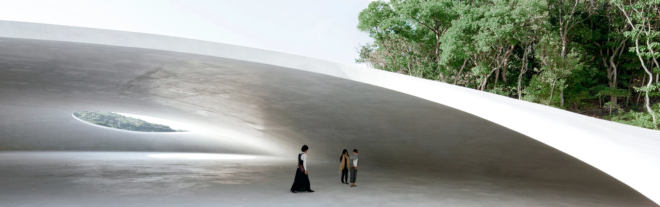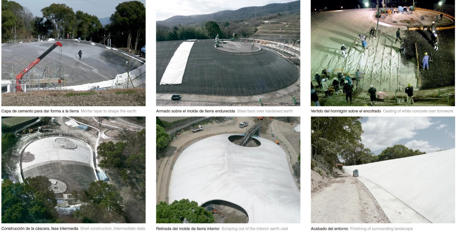 Dócilmente posado sobre una topografía de líneas suaves, este museo emula con su forma la caída de una gota de agua sobre los cultivos de arroz que caracterizan el paisaje de la isla japonesa de Teshima, situada en el mar interior de Setouchi. Dos ligeras cáscaras de hormigón blanco de 25 cm de grosor con orgánicas formas, además de una pequeña sala de recepción enterrada, albergan las instalaciones del museo, que se relacionan por un recorrido que muestra el entorno natural y permite observar la intervención desde diversos puntos de vista. La mayor de las ‘gotas’ alberga la única sala de exposición, un espacio diáfano y sobrecogedor de 40x60 metros sobre el cual se recortan dos orificios elípticos en la cubierta cupulada. Estos grandes agujeros descubiertos permiten asomarse al exterior e introducir elementos naturales cambiantes en el interior como luz, brisa, lluvia o fauna. El museo se diseñó para constituir por sí mismo una obra de arte que interactúa con el ambiente de su entorno, fusionando el paisaje, el arte y la arquitectura en una entidad espacial. Para la construcción de las cúpulas se realizó primero un molde de tierra endurecida y mortero con el volumen de los espacios a cubrir, que fue usado como encofrado, y que se retiró tras el fraguado del hormigón armado.