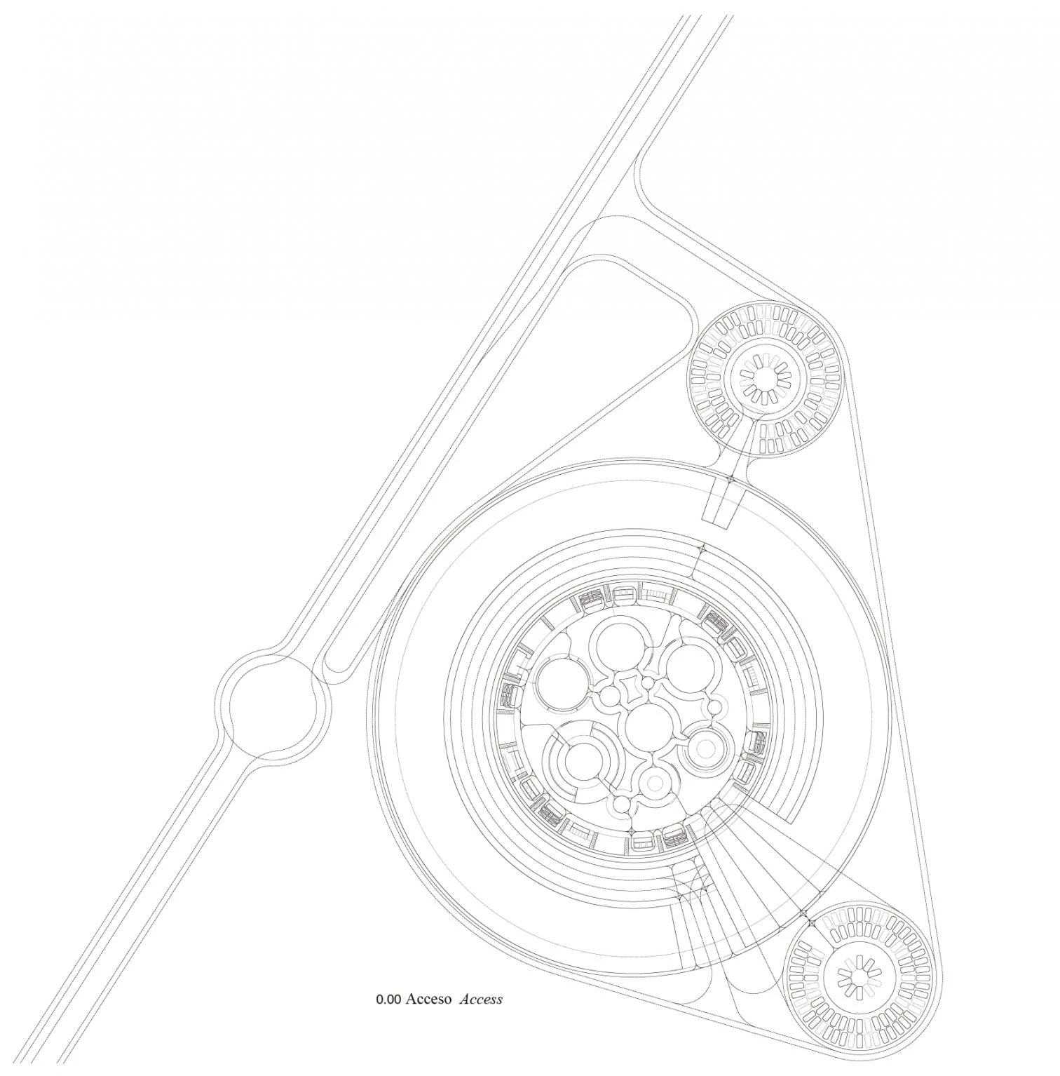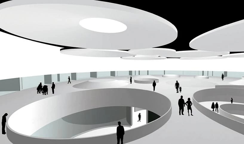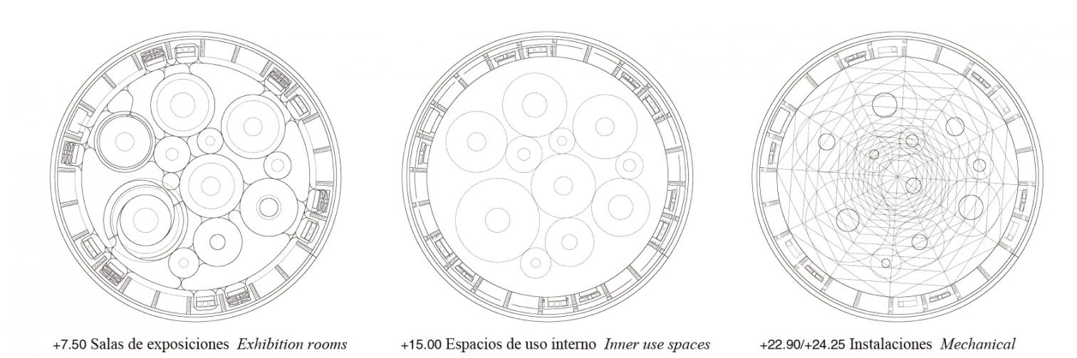 Los retranqueos obligatorios a la autovía y a la carretera modelaron un contorno de forma triangular en el que se decidió insertar un volumen cilíndrico: una circunferencia tangente a los trazados delimitadores, que establece una relación óptima entre masa edificada y espacio libre vinculándose así al lugar. Su forma, junto a su gran tamaño, tratan de establecer relaciones con tipos tradicionales, haciendo una reinterpretación del circo y su antecesor, el coliseo romano. Su presencia en el paisaje evoca, igualmente, las grandes fortificaciones castellanas medievales: el castillo y la torre. El carácter fortificado del edificio surge también de su relación con el entorno; así, el proyecto se envuelve en una fábrica metálica y masiva, un muro de introspección que permite que los visitantes vuelquen su interés en el contenido del museo, y que hace reconocible el edificio desde las infraestructuras de transporte que lo acordonan. En la fortificación se han proyectado lucernarios circulares, cuya disposición en planta construirá un espacio maquinista en torno a los automóviles de la colección Barreiros. De este modo, el espacio expositivo surge de la perforación volumétrica que se origina a partir de un sencillo sistema de repetición y homotecia del cilindro generando, debido a la gran escala del contenedor, un único espacio continuo, una concatenación de ámbitos diversos conectados a través de los espacios intersticiales entre patios de luz cilíndricos. Gracias a estos patios se establece una conexión visual cruzada entre los diversos estratos del edificio.