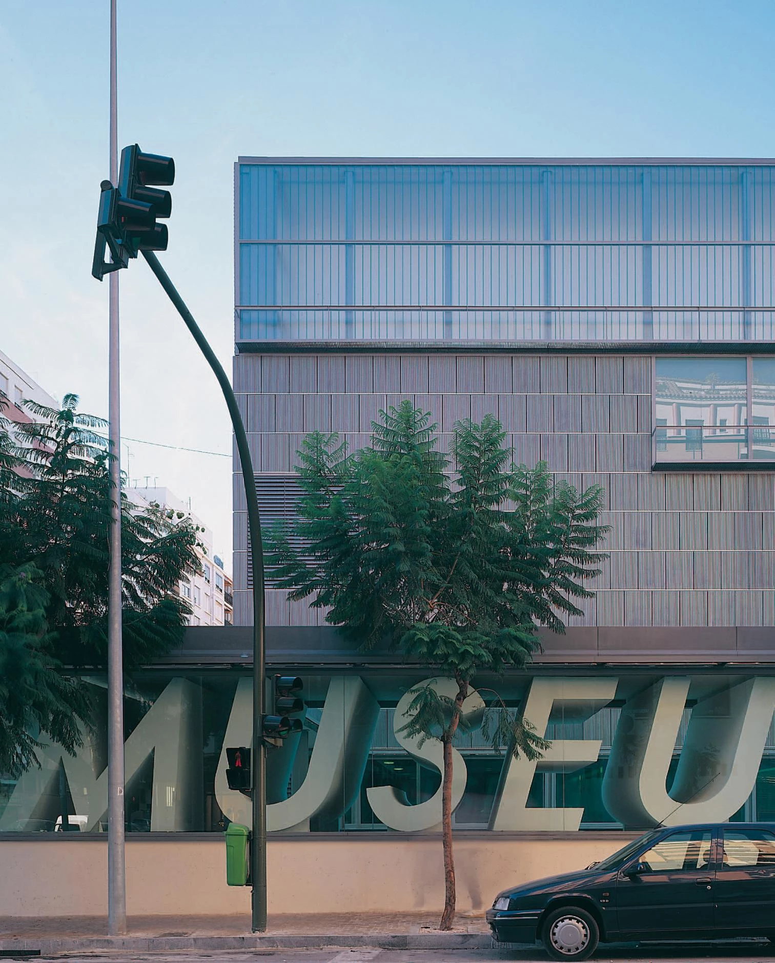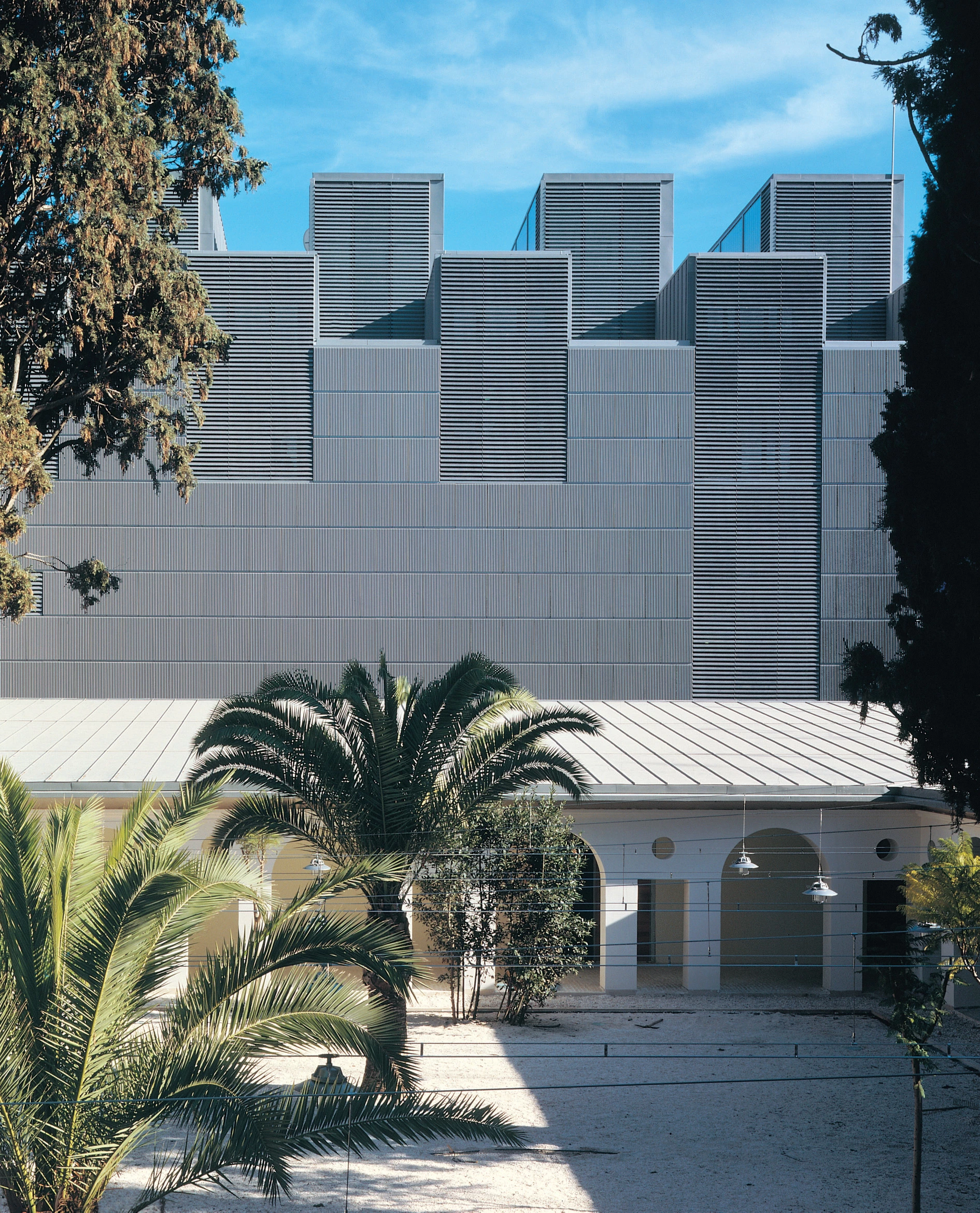 El museo anuncia su presencia mediante la silueta dentada de los lucernarios que rematan la cubierta del cuerpo de exposiciones y las grandes letras extruidas que definen uno de los flancos del patio de acceso.