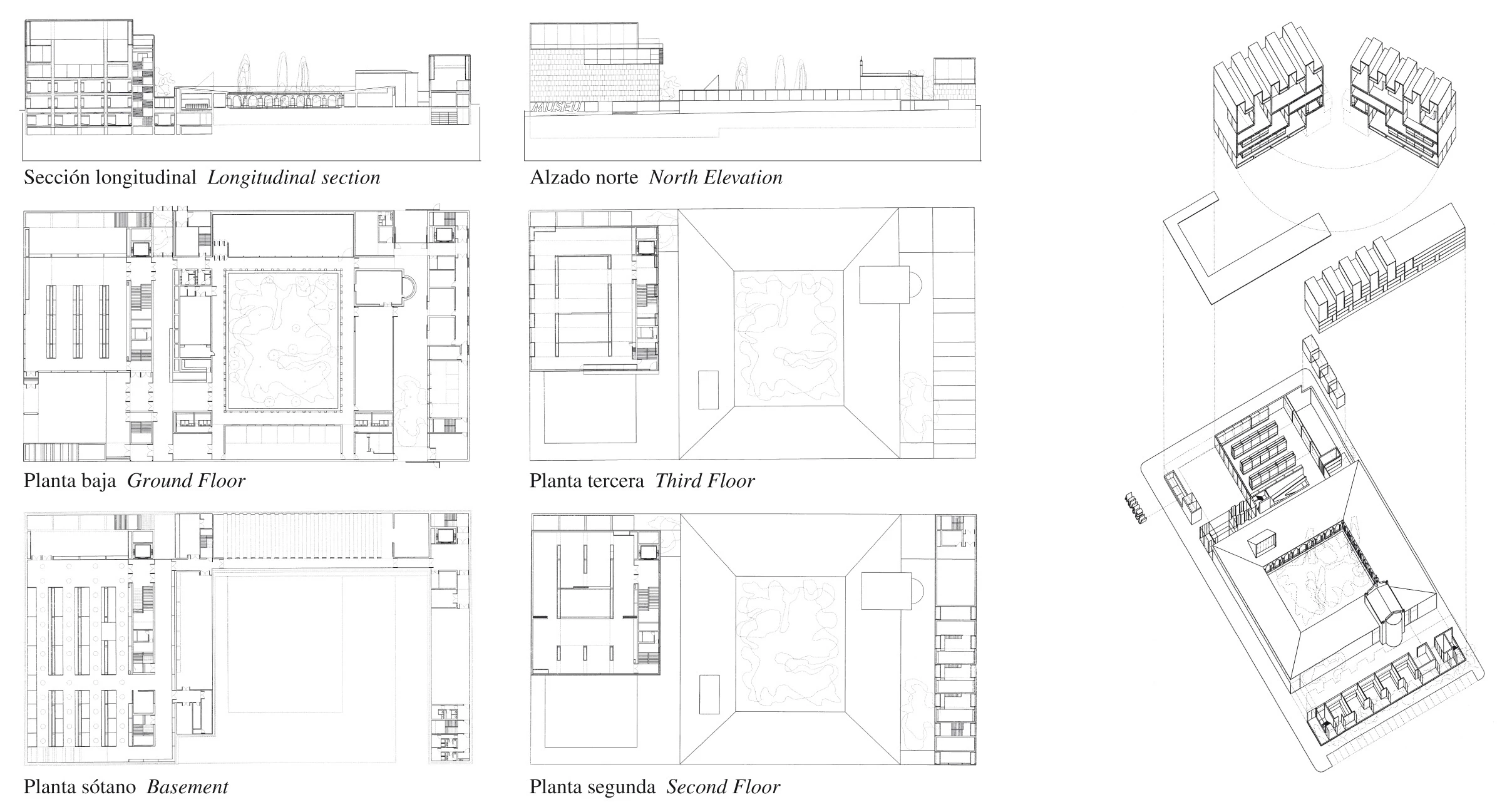 Inscrito en la trama regular del casco urbano de Castellón, el nuevo museo de Bellas Artes se levanta sobre los restos del antiguo colegio Serra Espadá, ocupando casi por entero el solar. La división canónica en cuatro bloques de usos —exposición, administración, talleres y almacenes— llevó a distribuir el programa en tres cuerpos vinculados por un zócalo enterrado para establecer un gradiente de privacidad entre la zona pública situada al este y el área de acceso restringido, dedicada a los talleres de restauración que configuran el límite oeste. Un claustro ajardinado —levantado en 1936— ocupa el centro de la actuación, articulando a su alrededor las exposiciones temporales, el auditorio, la cafetería, la biblioteca y las oficinas, como una suerte de bisagra entre las áreas de exposición y restauración. Un semisótano de almacenes y cuartos de instalaciones vincula bajo rasante los cuerpos que hacen explícito este orden funcional.