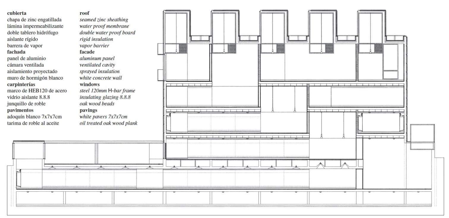 Como un cofre que custodia los tesoros de la ciudad, una coraza hermética y cúbica se erige en el flanco este de la parcela junto al patio que acoge la entrada de visitantes, reuniendo en su interior las cuatro áreas temáticas del museo: cerámica, bellas artes, artesanía popular y fondos de arqueología. Distribuidas a lo largo de cinco plantas, las salas se conectan entre sí mediante una cascada de vacíos de doble altura que cose en diagonal la sección de este cuerpo. Al recorrer cada nivel, el visitante se ve confrontado de forma casi simultánea con tres escalas distintas: la de las salas entre forjados, de 3,30 metros de altura libre, la del vacío de dos plantas, de 6,90 metros, y la que ofrece la visión diagonal de la totalidad del edificio. Como coronación de esta secuencia espacial, una sucesión de lucernarios paralelos cubre la última planta, confiriendo a este cuerpo el perfil recortado que lo identifica como mascarón de proa del proyecto. Como coronación de esta secuencia espacial, una sucesión de lucernarios paralelos cubre la última planta, confiriendo a este cuerpo el perfil recortado que lo identifica como mascarón de proa del proyecto. La misma silueta dentada remata el cuerpo esbeltode talleres que configura el límite opuesto de la parcela.