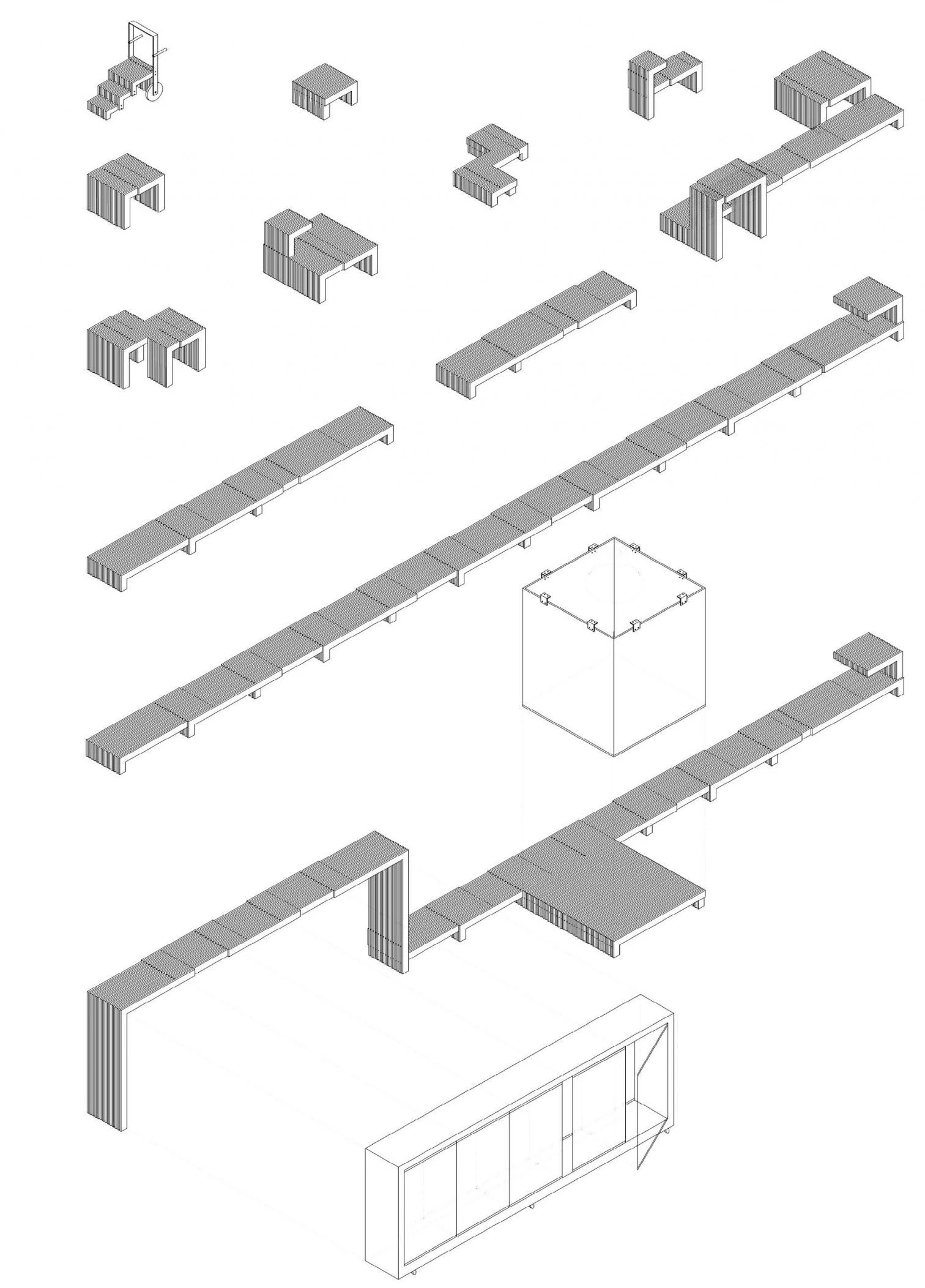 Con el mismo principio con el que se entrelazan los lucernarios de cubierta se ensamblan también los listones de madera de iroko con los que se construyen las peanas, los bancos y las vitrinas de exposición.