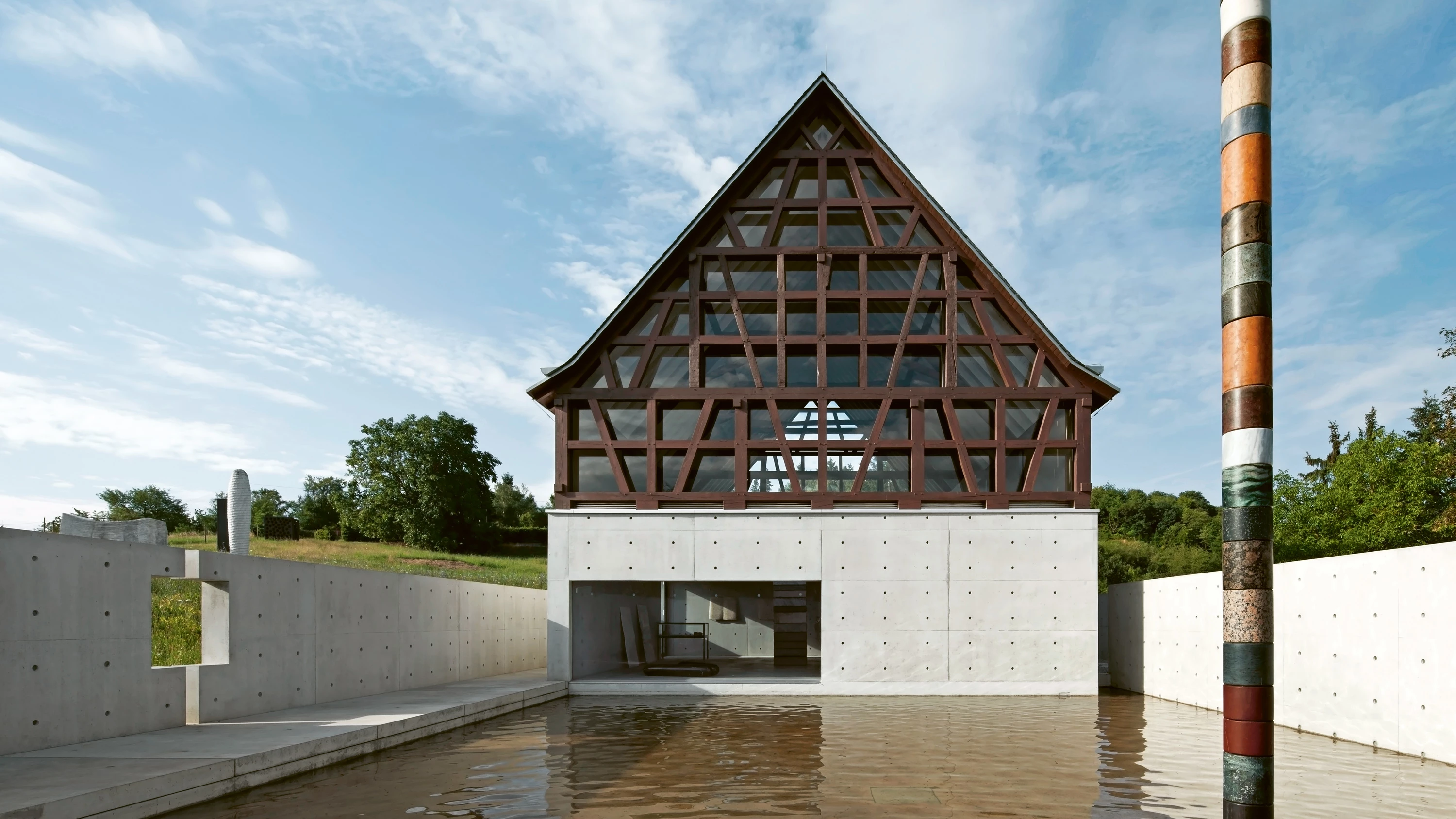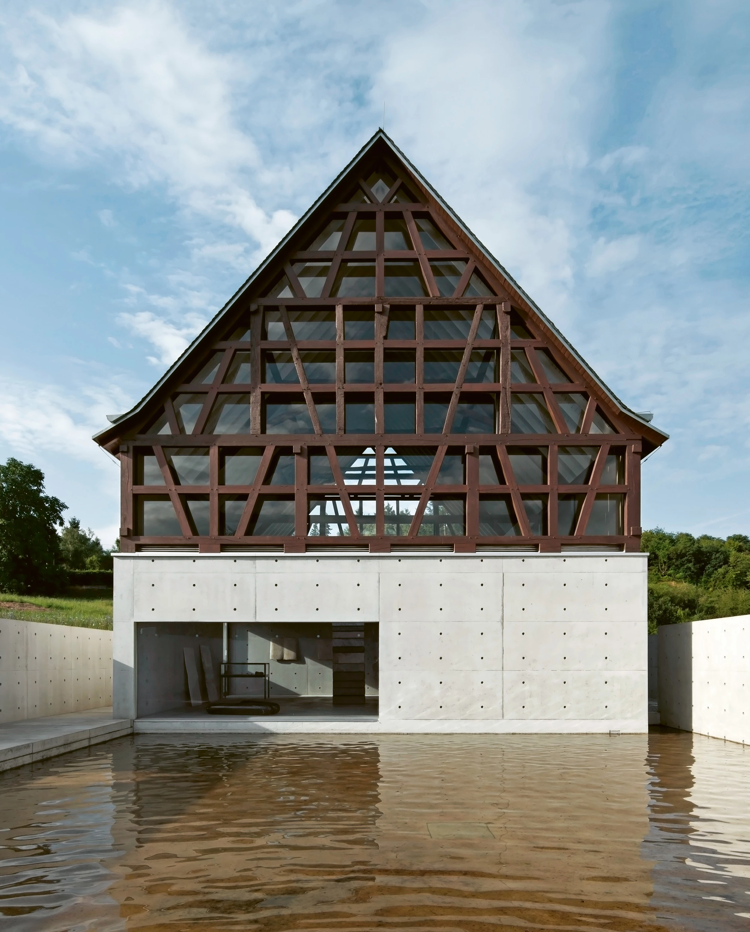 La primera decisión implicó el desmantelamiento de un antiguo granero del siglo XVIII para después reconstruirlo en el centro de la parcela, restaurarlo y transformarlo en un espacio expositivo. Esta operación de reconversión de la estructura agrícola tenía como objetivo la creación de un espacio adecuado para la exposición de escultura moderna, pero mediante una arquitectura que enlaza con la tradición y el imaginario colectivo locales. El proceso de rehabilitación incluyó la demolición de las divisiones interiores, permaneciendo en pie tan solo los hastiales superiores que filtran la luz que ilumina el espacio central a doble altura y entran en contraste con los muros de hormigón de la planta baja. En el exterior, un conjunto de tapias de hormigón armado construidas siguiendo la topografía natural delimitan una serie de patios rectangulares. En ellos se exponen esculturas al aire libre, bien sobre capas de grava blanca o bien sobre láminas de agua en las que se refleja la imagen del antiguo granero fusionando, de esta manera, lo antiguo y lo nuevo...[+]
