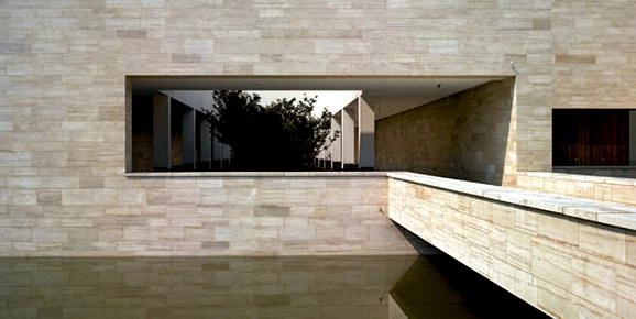 El mármol travertino iraní y el enfoscado blanco son, junto con los controlados paños de vidrio, los protagonistas en la construcción del edificio. La suave textura del mármol, de color crema, evoca el brillo pétreo de las piezas de jade que acoge el museo, al tiempo que dota al conjunto de una marcada impresión de solidez y hermetismo, matizada por la presencia del agua y en contraste con la sensación de apertura de los patios interiores.
