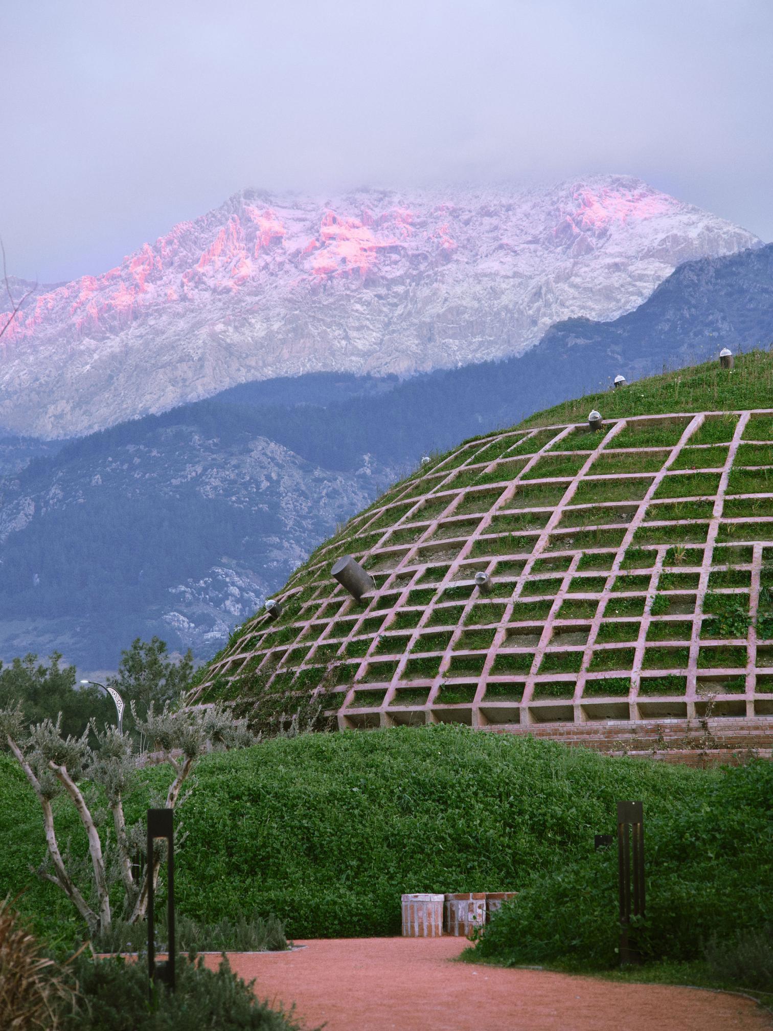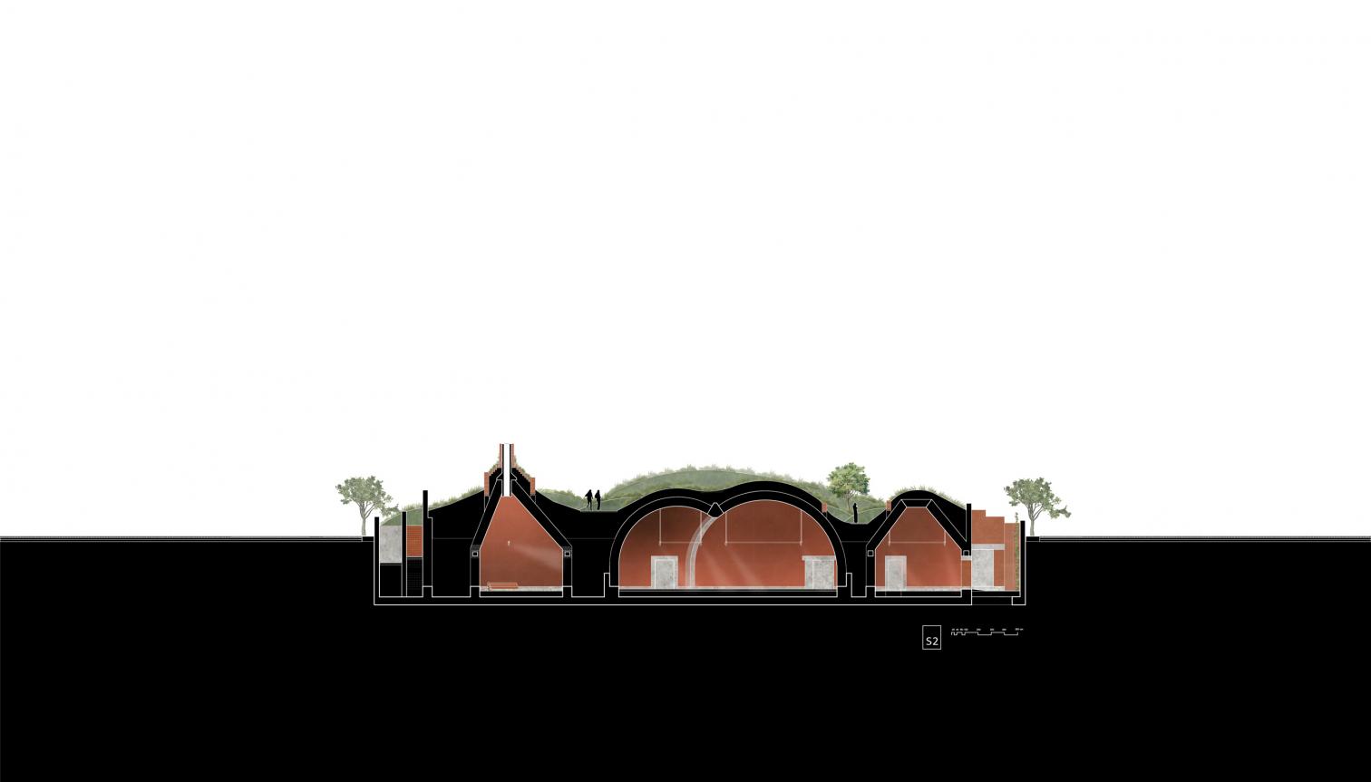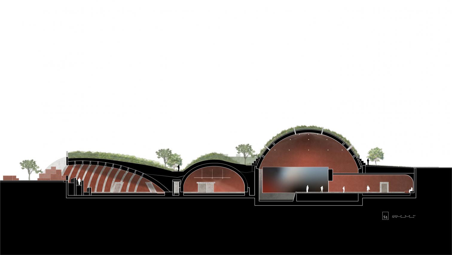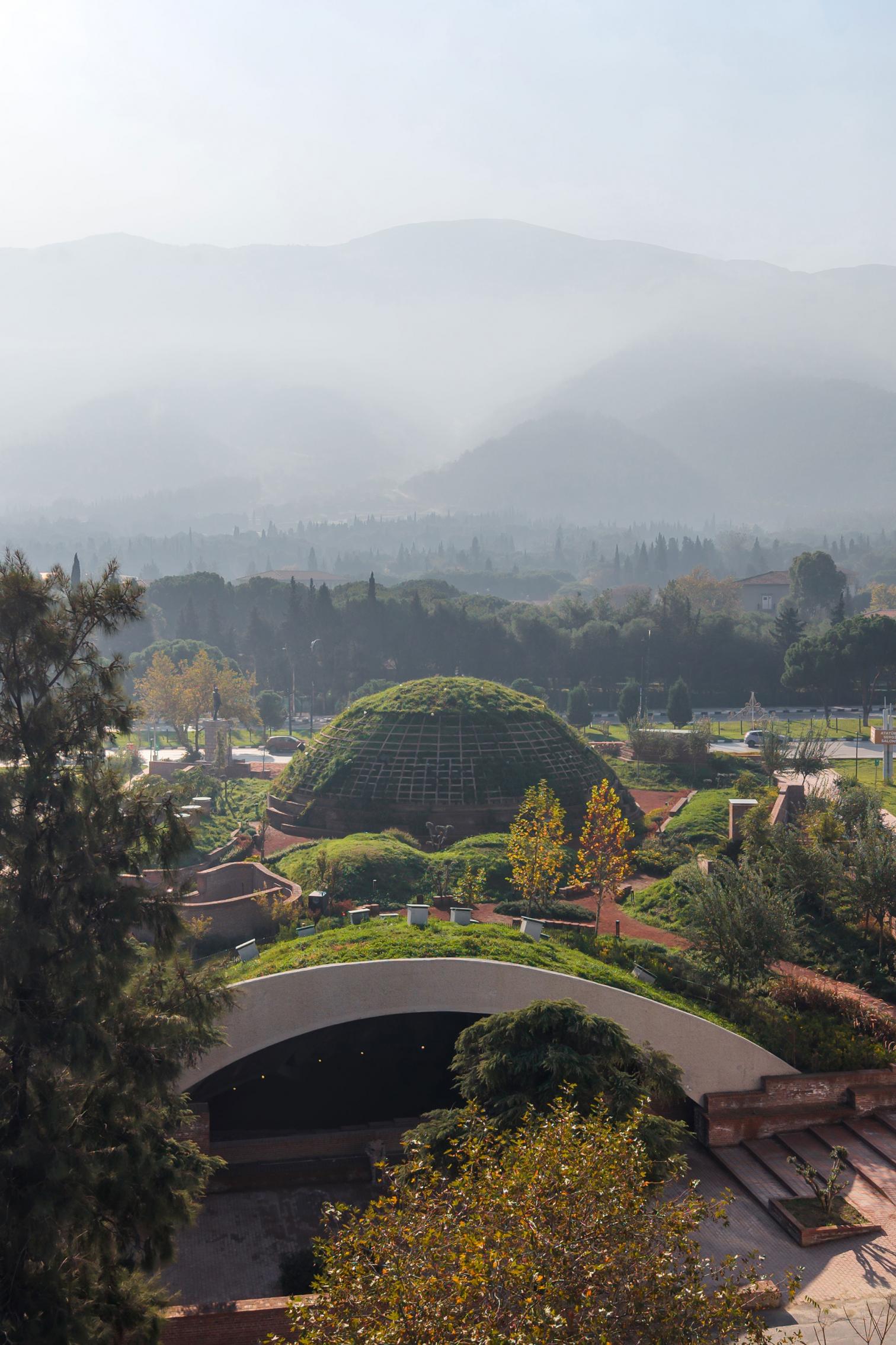El acceso al museo se realiza mediante una rampa de tres brazos. El vestíbulo principal adopta una forma semielíptica, definida por losas de hormigón abovedadas y arcos de ladrillo, desde donde se cuenta la historia de Manisa. En contraste, la cubierta funciona como un parque público que se eleva sobre el contenido histórico. El edificio emerge mediante una topografía de montículos y vacíos, que fragmentan el espacio ajardinado, permitiendo que la vida cotidiana y la memoria coexistan en estratos.