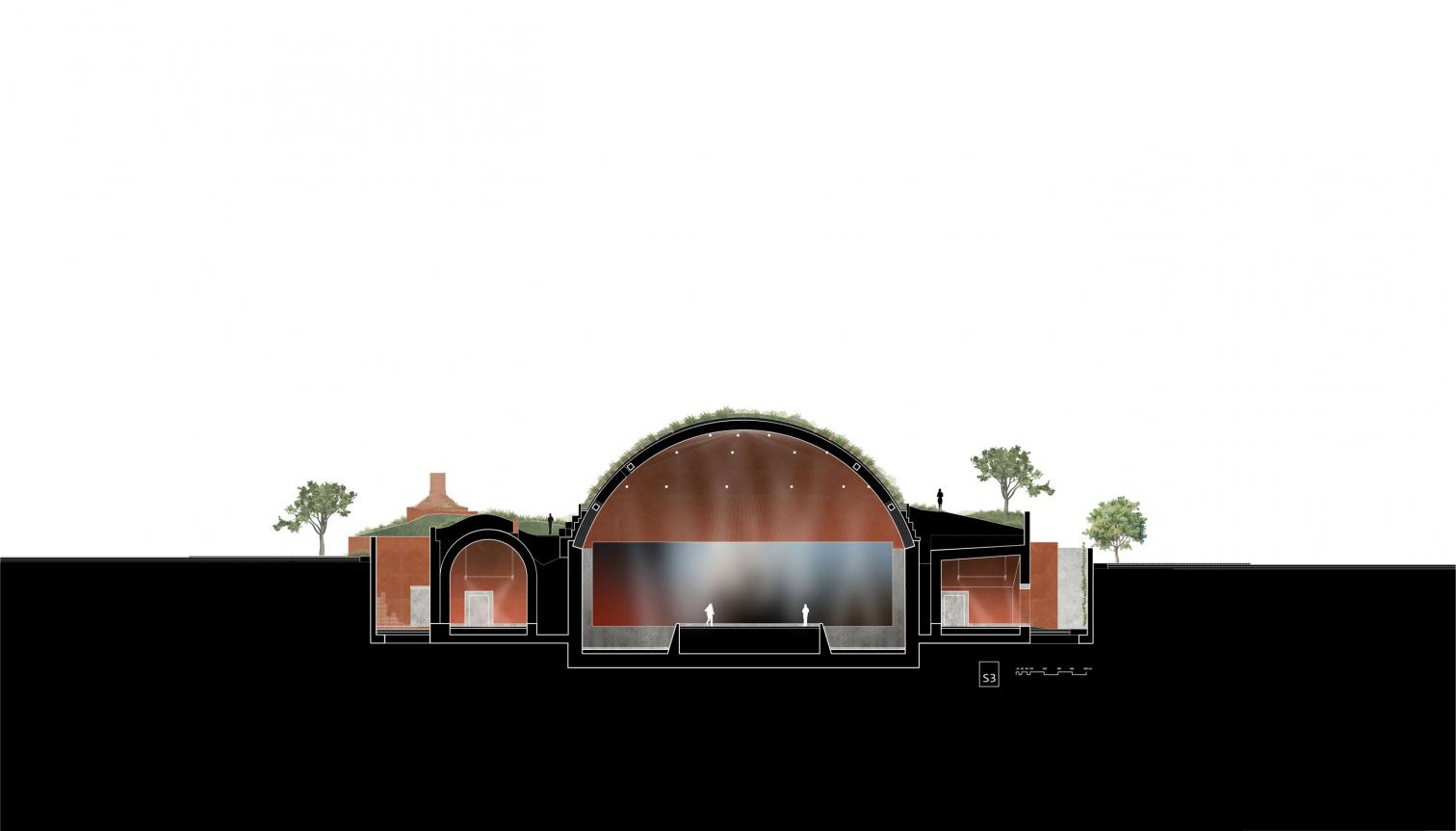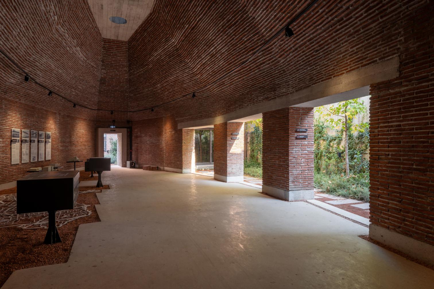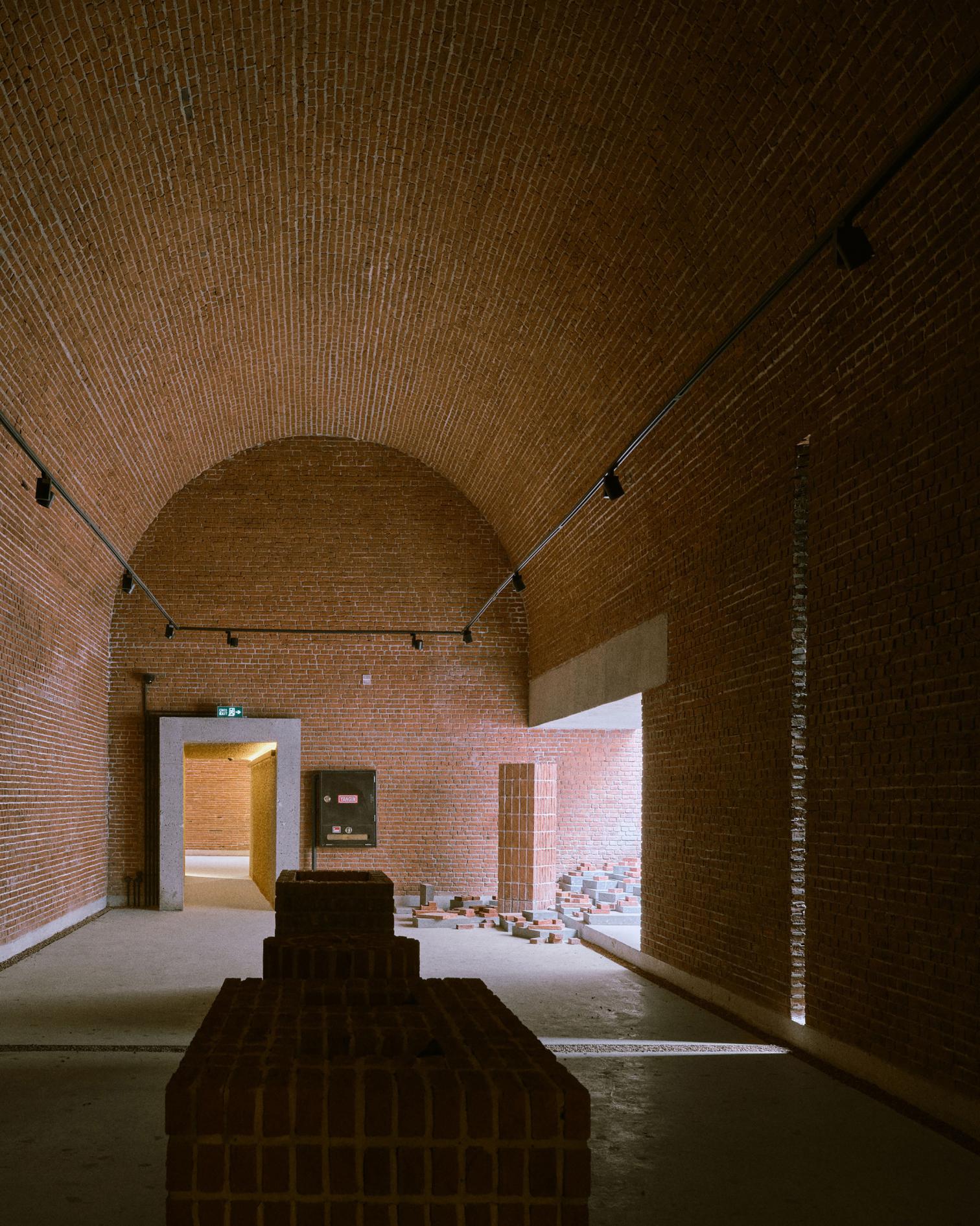 El ladrillo es el material predominante en todo el proyecto. Se emplea en muros gruesos, gradas escalonadas, techos abovedados y largos pasillos. Pasajes estrechos conducen a espacios más amplios, mientras la luz natural se filtra de forma controlada a través de aberturas estratégicas. Estas transiciones generan contrastes deliberados —oscuridad y luz, estrechez y amplitud, altura y compresión— que reflejan cambios emocionales, desde la incertidumbre inicial hasta una esperanza contenida.