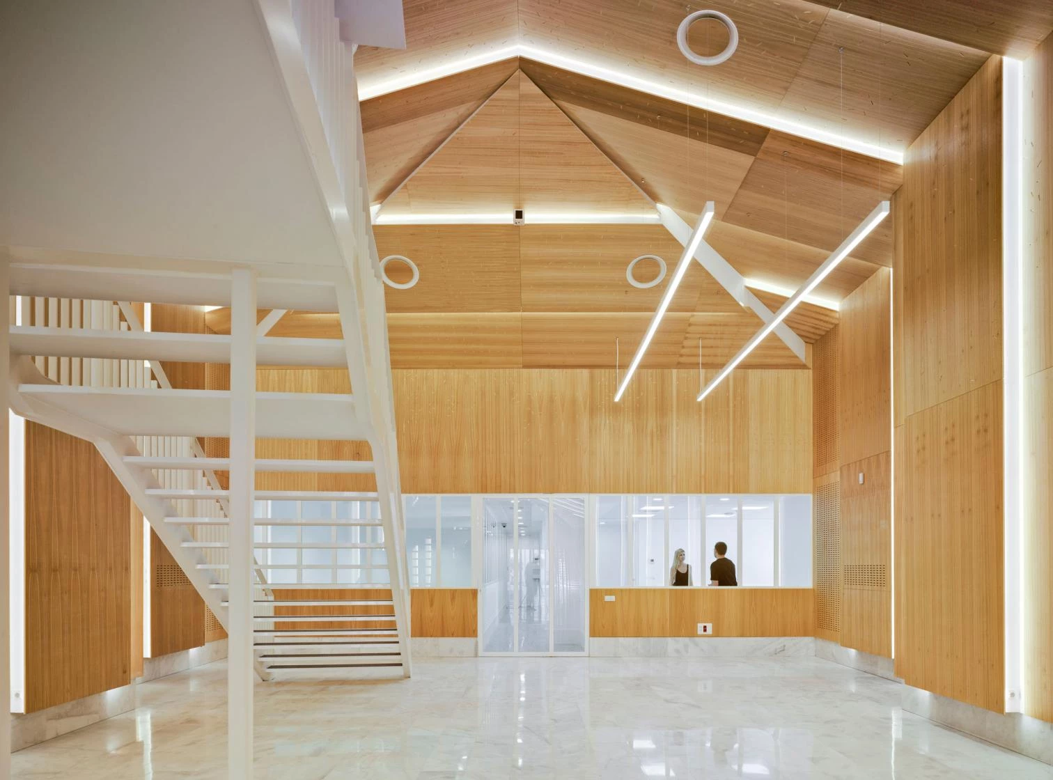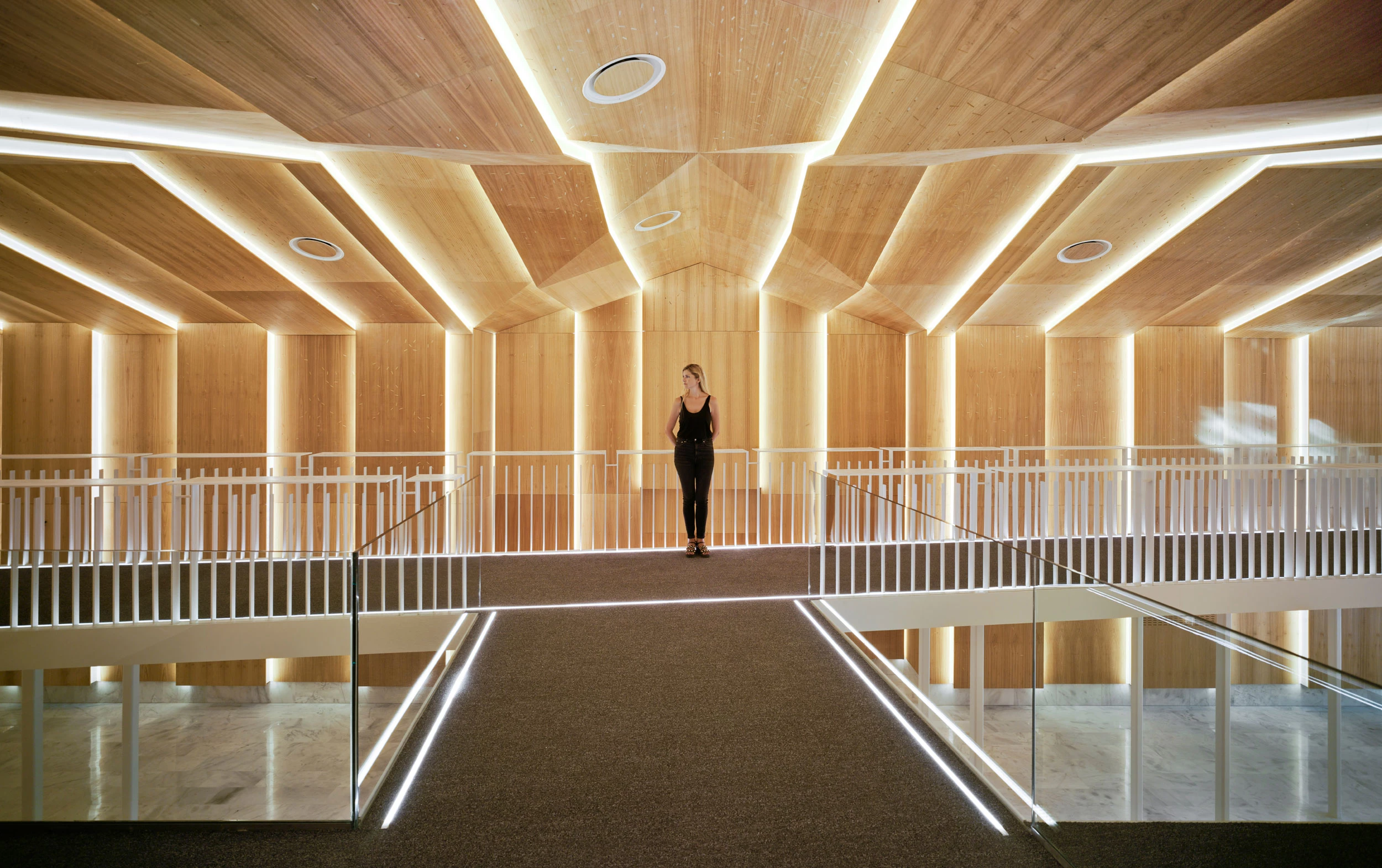 La antigua nave, cuyo interior está envuelto en paneles de eucalipto y atravesado diagonalmente por una pasarela, alberga el museo; el volumen anexo, cubierto con la celosía cerámica, está destinado a laboratorios.