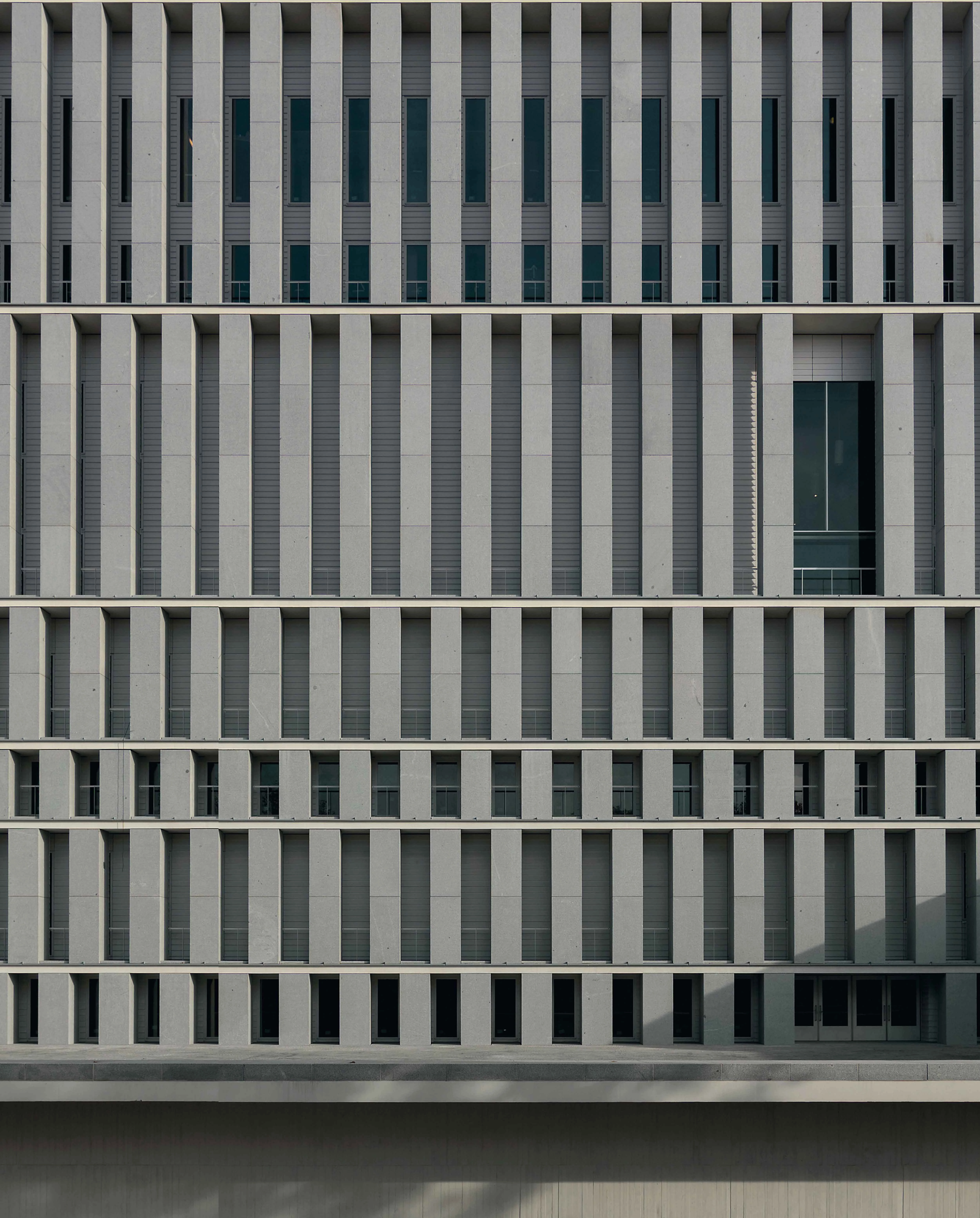 La secuencia estructural de la fachada está formada por pilares de hormigón armado recubiertos por placas de granito en la cara exterior, y por placas de fundición de aluminio con franjas horizontales en los lados restantes.