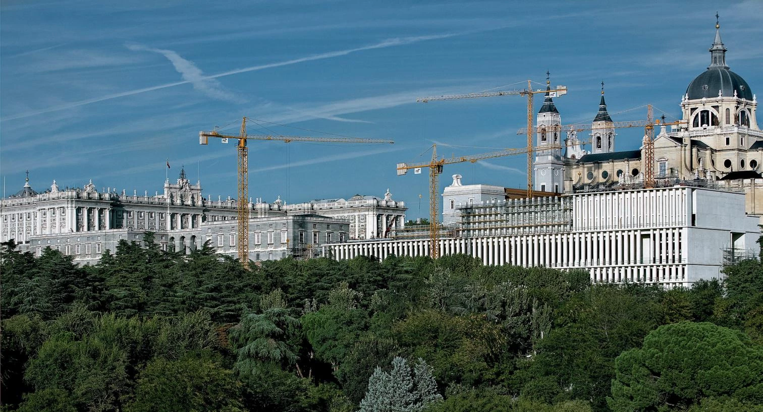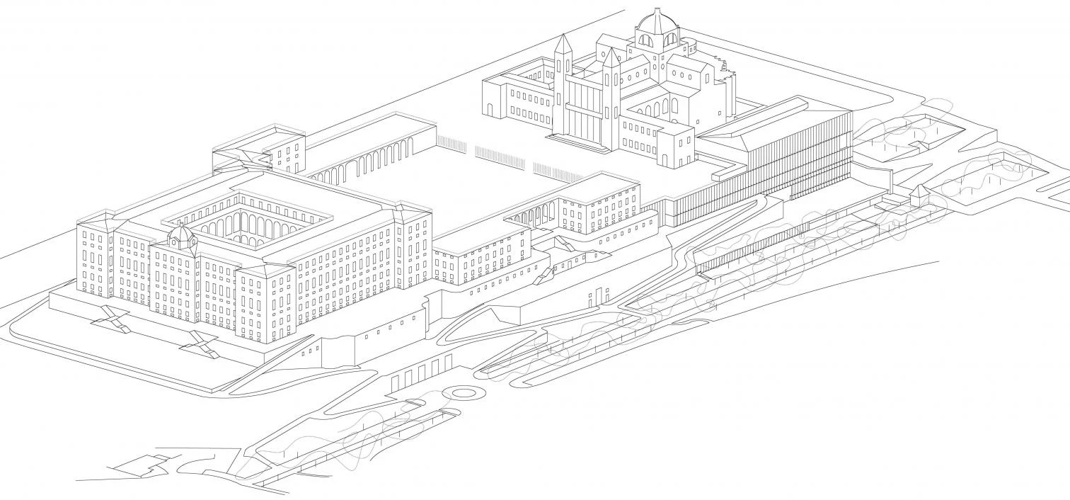 En una posición privilegiada dentro del paisaje urbano madrileño, en el complejo del Palacio Real, rematando la cornisa que se abre al Campo del Moro desde la plaza de la Almudena, el nuevo museo está rodeado por un patrimonio arquitectónico tan complejo como heterogéneo. El proyecto parte de dos premisas fundamentales a nivel urbano: por un lado, el edificio debe formar parte del paisaje, entre natural y artificial, de la cornisa a poniente del casco histórico de Madrid; y por otro, debe preservar el carácter público y abierto de la plaza de la Almudena, manteniendo la visión de los parques y jardines existentes bajo la cornisa. Concebido como un muro de contención habitado, el museo intenta reducir su impacto ambiental objetivo (en el medio físico) y subjetivo (en el inconsciente colectivo) continuando el basamento monumental del palacio.