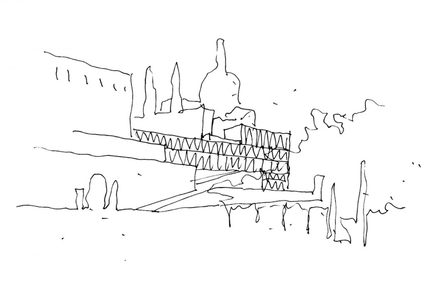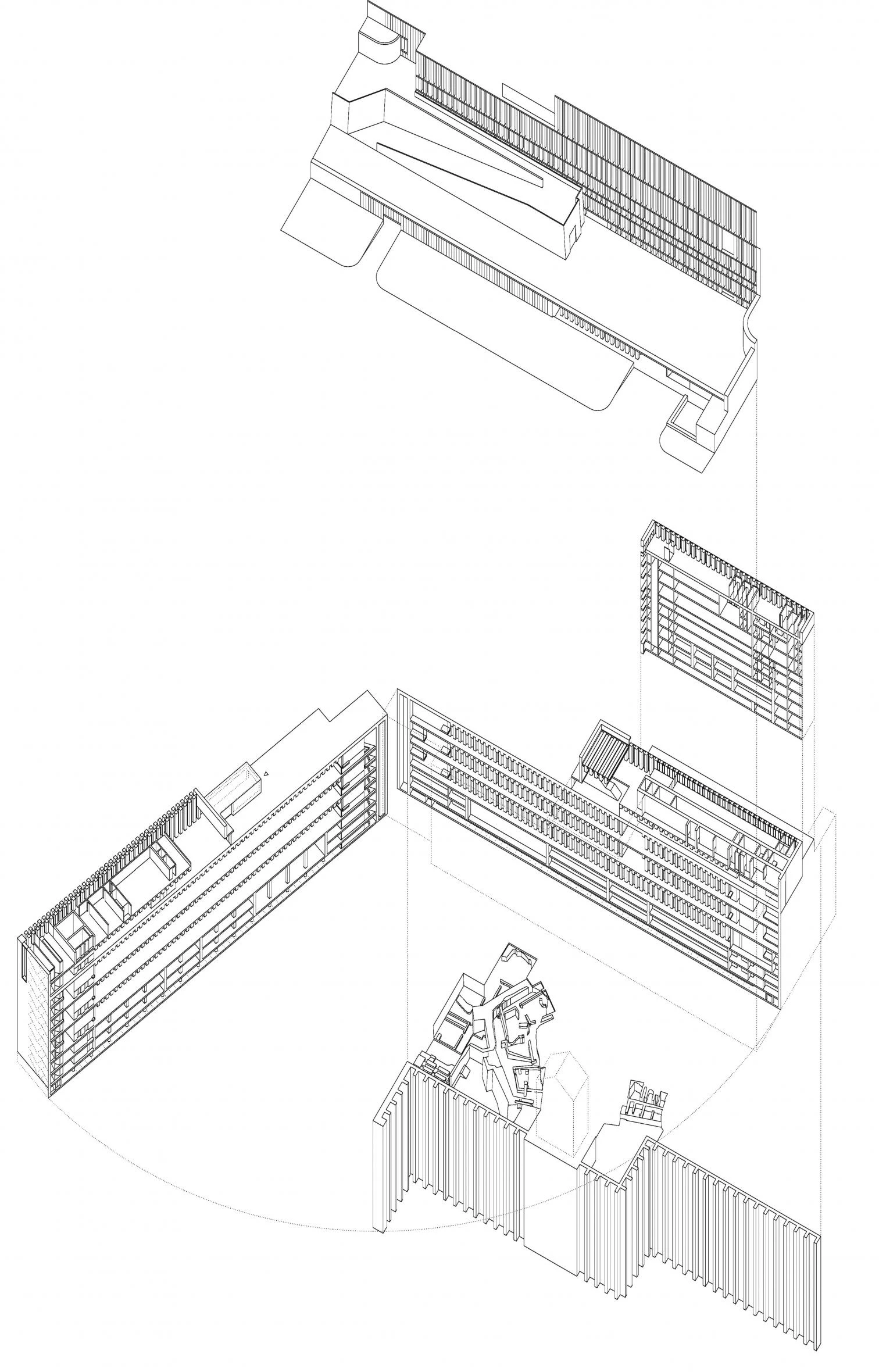 Apenas visible desde la plaza entre el palacio y la catedral, el museo se adosa a la cornisa como un gran muro de contención habitado, al tiempo sólido y permeable. Al nivel de la plaza se alza sólo un cuerpo de acceso, de dos plantas; el resto del programa se desarrolla en sentido descendente.