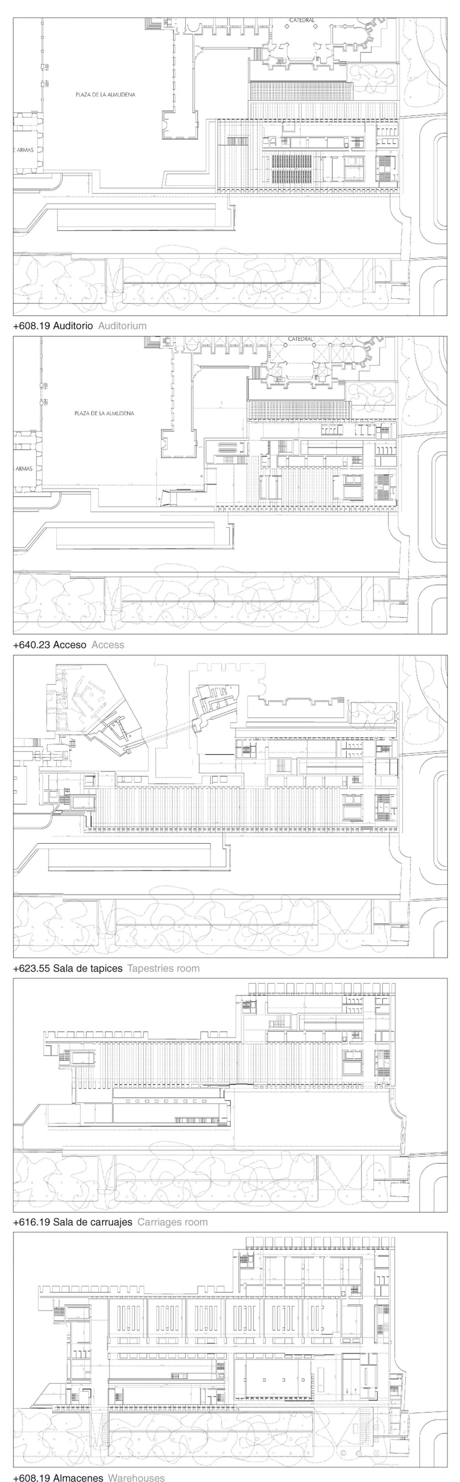 El acceso, discretamente situado en un costado de la catedral, se prolonga en un cuerpo bajo y rectangular que, como una extensión del propio edificio, va a buscar al visitante para iniciar un recorrido descendente por tres niveles de exposiciones que albergan colecciones diferenciadas: tapices, pintura y carruajes. Debajo de estas salas se sitúan dos plantas con los almacenes, talleres e instalaciones y, finalmente, un nivel con aparcamientos. Los espacios de exposición se organizan como una nave de ciento cincuenta metros de longitud y veinte metros de ancho, flanqueada por los restos de la muralla árabe en el lado este, y por una celosía monumental, formada por inmensos pilares de hormigón armado forrados de granito y fundición de aluminio en la fachada oeste, sobre los jardines del Campo del Moro.