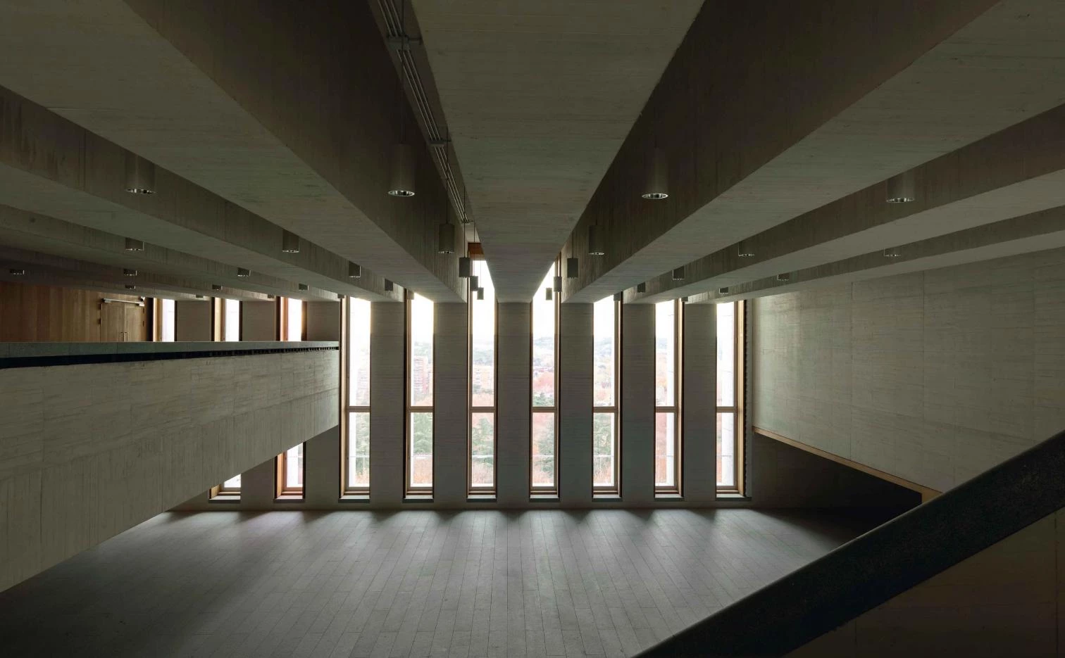 La marcada solidez de los espacios interiores y su carácter de espacio ‘excavado’ no impide la presencia de abundante luz natural y de vistas al exterior, que se producen a través del filtro de la fachada de pilares.