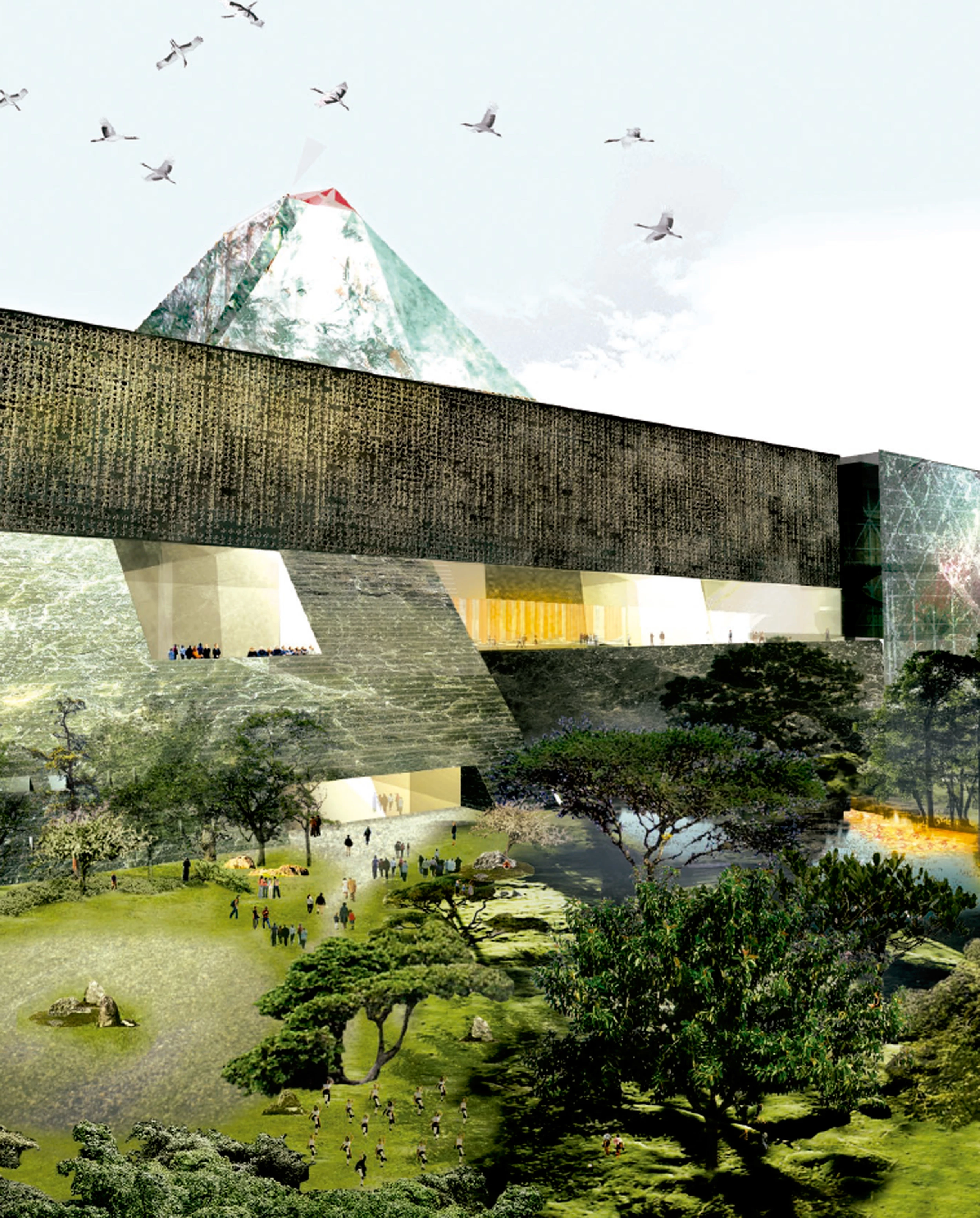Además de los objetos esenciales de la cultura china, el museo palaciego alberga una enorme cantidad de exquisitas piezas asiáticas, entre las que se encuentran obras de jade del Islam, objetos de los budistas tibetanos, piezas lacadas japonesas, pinturas, manuscritos, piezas cerámicas y distintos documentos diplomáticos y geográficos que explican la historia de los pueblos asiáticos. Dichos fondos, que proceden en su mayor parte de la colección imperial traída por el último emperador de la Ciudad Prohibida en 1949, dan forma a una institución de rango mundial, comparable al Museo Británico de Londres. La nueva ampliación de Taibo, que complementa al museo de Taipei, hará hincapié en la naturaleza pan-asiática del museo y de sus fondos y en la relación entre todas las culturas del continente. El museo se organiza como un recorrido fluido, imitando la trayectoria lineal de la tinta, llena de trazos líricos y fuertes puntuaciones. Los visitantes acceden a un patio central desde el que comienza la visita y sobre el que se eleva una montaña artificial que tiene la capacidad de representar el museo y la región. El resultado es un paisaje rodeado de agua, que emerge de un zócalo de mármol y que se compone de una secuencia de galerías revestidas de bronce... [+]