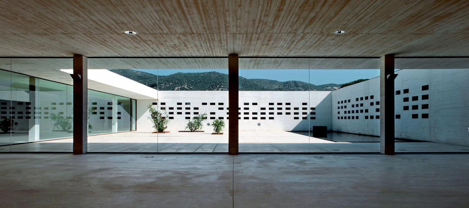 A partir del vestíbulo principal, un amplio patio presidido por un estanque organiza en torno a él, como un claustro, los espacios de uso público: sala de maquetas, librería, cafetería, salón de actos y salas expositivas.