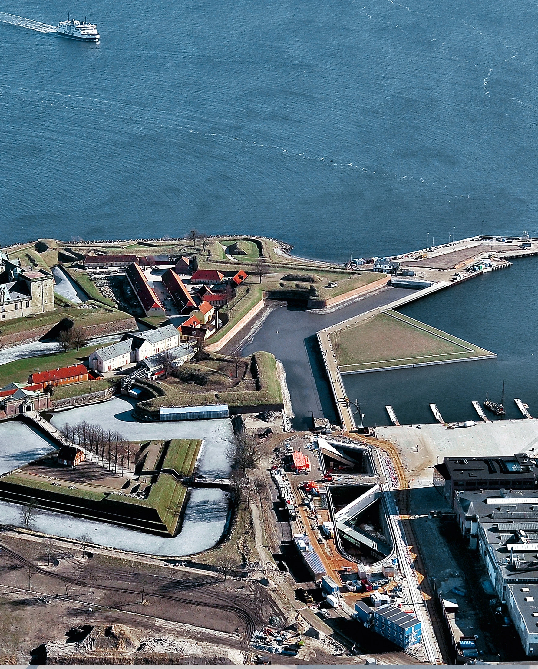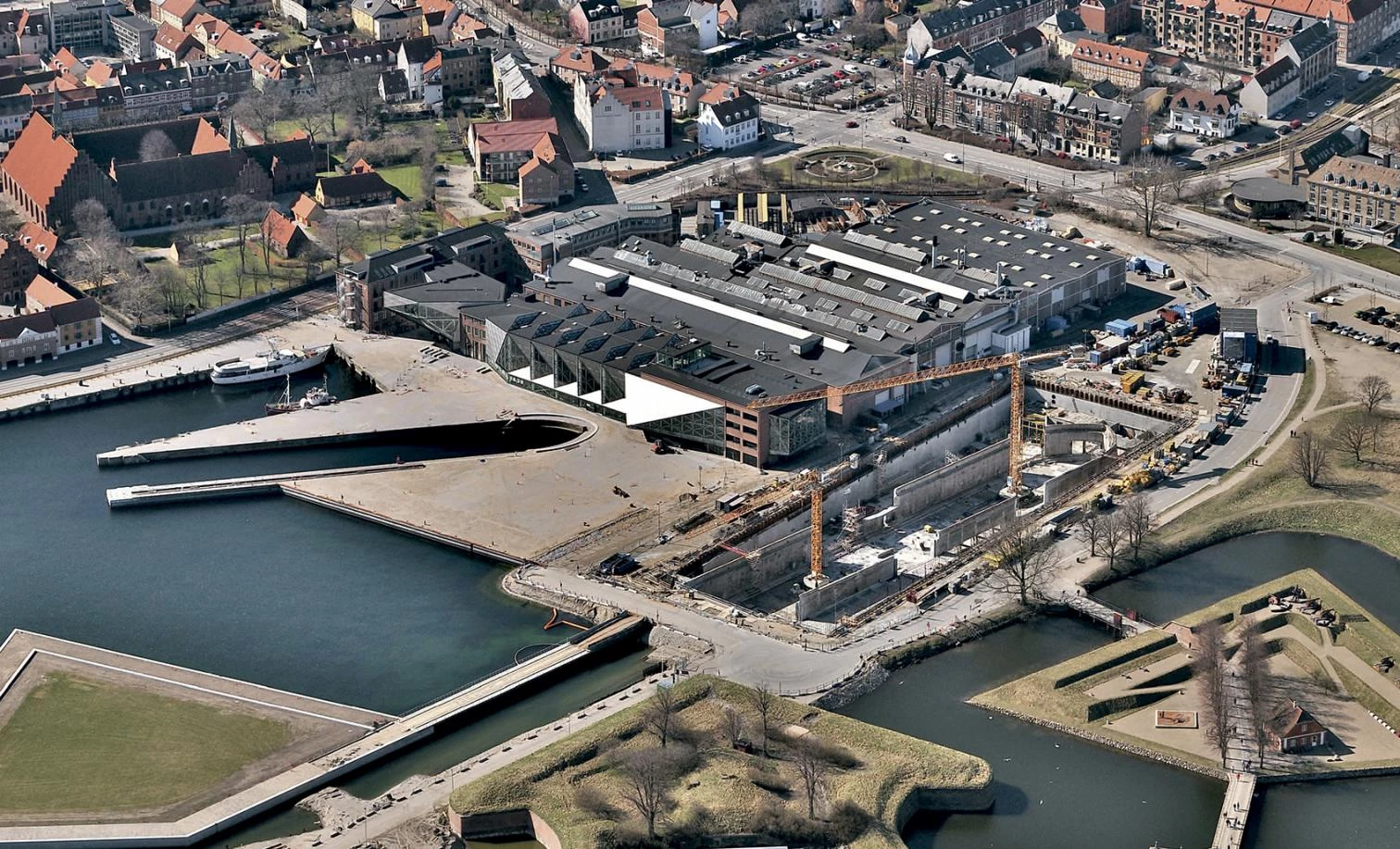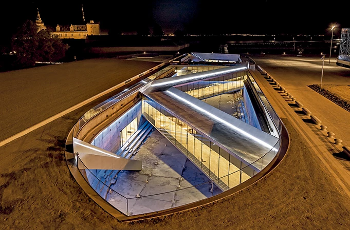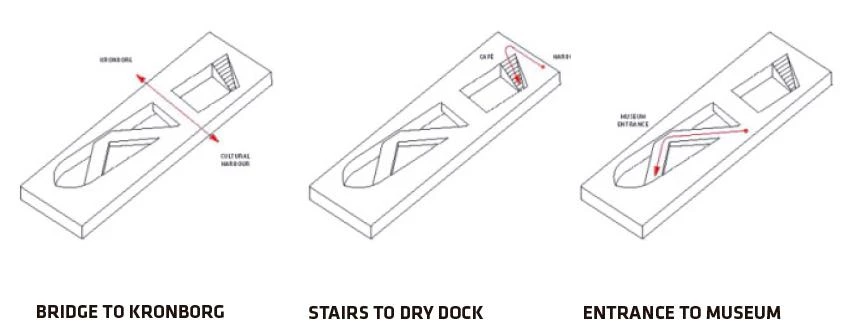Desde su fundación en 1915, el Museo Marítimo de Dinamarca estuvo ubicado en el castillo de Kronborg —una construcción de 1574 situada en una pequeña península y conocida por ser el escenario de Hamlet—, pero tuvo que abandonar este histórico emplazamiento cuando la UNESCO declaró el castillo Patrimonio de la Humanidad y las autoridades decidieron recrear los interiores originales del edificio. La nueva ubicación para el museo se halló muy cerca: un viejo dique seco a pocos metros del castillo. La propuesta ganadora del concurso convocado para cobijar la dotación en el nuevo emplazamiento fue la única en situarla en el perímetro del dique, y no en su interior como indicaban las bases, de manera que se conservase el cuenco vacío de la infraestructura para transformarlo en un espacio urbano hundido a ocho metros del nivel del mar. Se trataba de una operación que permitía mantener prácticamente intacto el entorno del castillo, al menos sobre rasante. La pertinencia de esta decisión se vio confirmada tras las primeros informes técnicos, que dictaminaron que, para mantenerse estables, los muros del dique seco dependían del empuje del agua, de tal modo que si se vaciase aquel, la presión del terreno obligaría a levantar un dique dentro de otro. Colocar el programa en torno al dique hizo posible, de este modo, que la construcción de un nuevo muro de contención no resultase redundante.