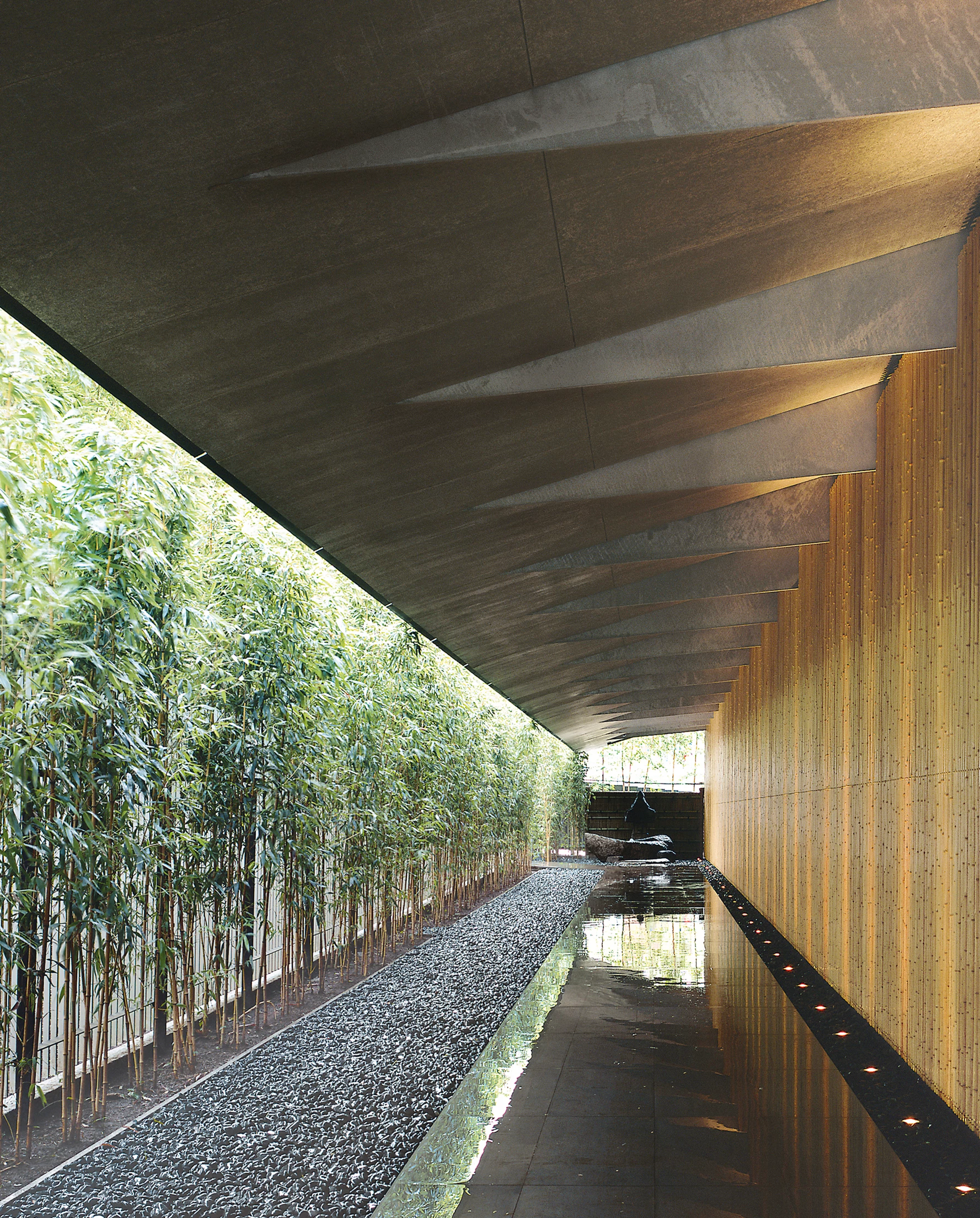Ubicado en la residencia privada de la familia Nezu, el museo que lleva su nombre abrió sus puertas en 1941 para albergar la colección privada de Kaichiro Nezu, industrial y presidente de las líneas de tren Tobu. En la actualidad cuenta con más de 7.000 objetos, desde caligrafías, pinturas y esculturas hasta cerámicas de arte pre-moderno japonés y asiático. El proyecto se centra en dotar de un carácter urbano al conjunto de 20.000 metros cuadrados. Para ello, genera un frente edificado que protege del tumulto de la avenida comercial de Omotesando. Apoyándose en el volumen añadido de una primera ampliación en 1990, la nueva pieza cierra la esquina y sustituye los deteriorados edificios del almacén y de la sala de exposiciones por un edificio que alberga la recepción, una tienda y dos salas de exposiciones. Los grandes aleros de la cubierta de teja negra culminan en unos perfiles de acero tratado con ácido fosfórico para minimizar el canto. Su forma evoca la imagen de las construcciones originales, prolonga visualmente las pendientes del terreno y arroja sombra sobre la fachada revestida con coral gris de la región de Qingdao, una piedra de aspecto parecido al bambú. El acceso al recinto se produce a través de un tamiz de bambú que convierte el paso del exterior al interior en un proceso de sutil inmersión en un oasis de tranquilidad.
