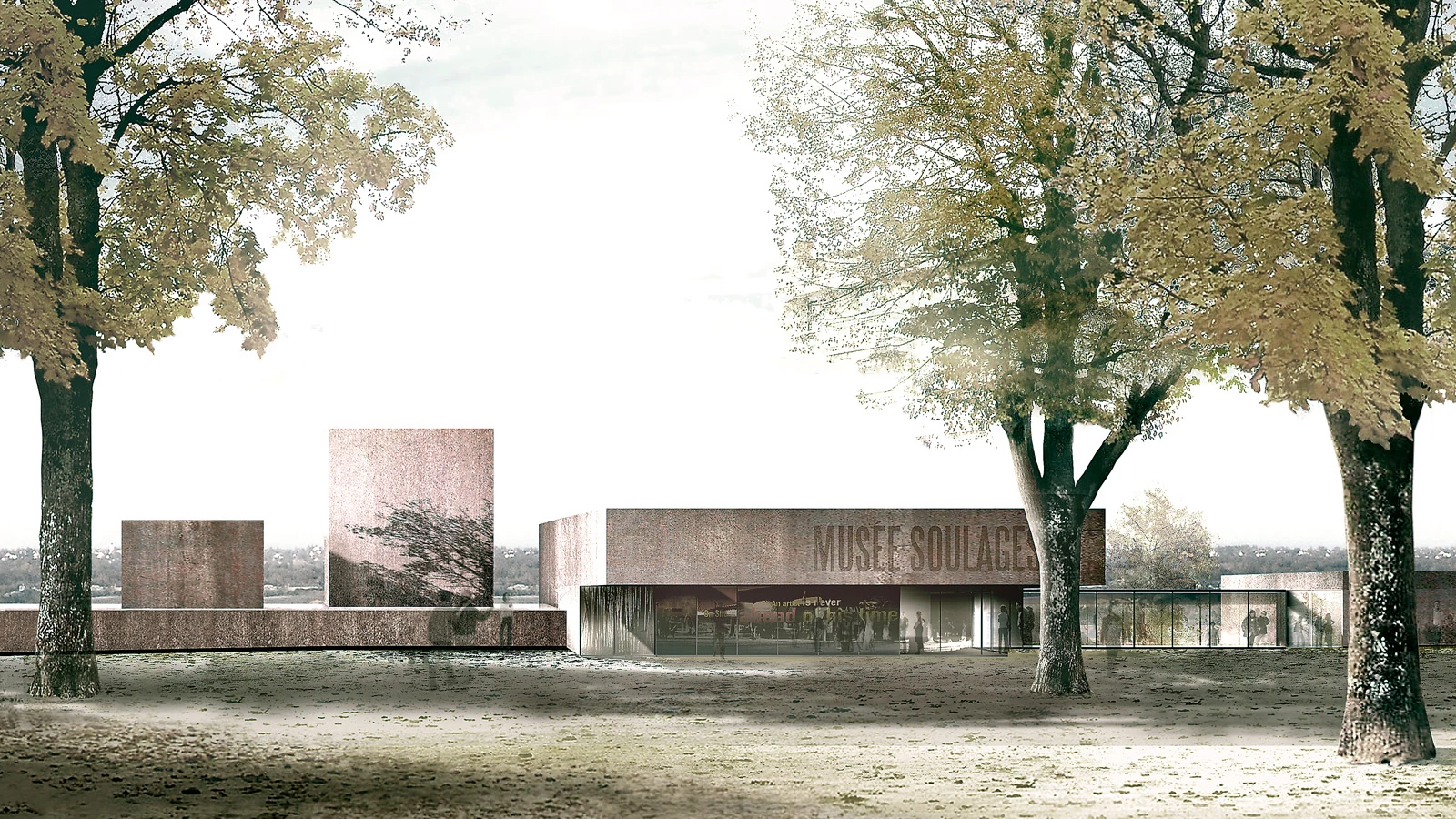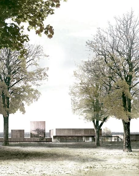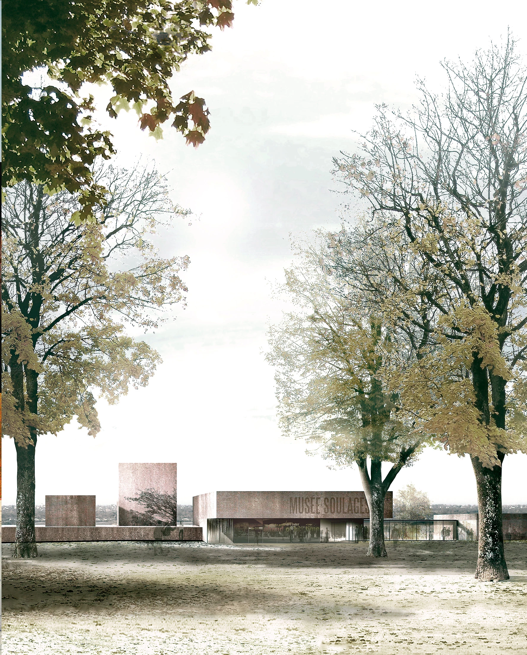 El museo consagrado al artista Pierre Soulages en Rodez, su ciudad natal, se ubica en el céntrico parque Foirail: un espacio público de forma almendrada, a escasos metros de la ciudad antigua y de la plaza de la catedral gótica, el edificio más importante de la ciudad. La posición privilegiada del parque domina el entorno de la localidad, adoptando una acusada pendiente en uno de sus bordes de la que el proyecto saca el máximo partido.