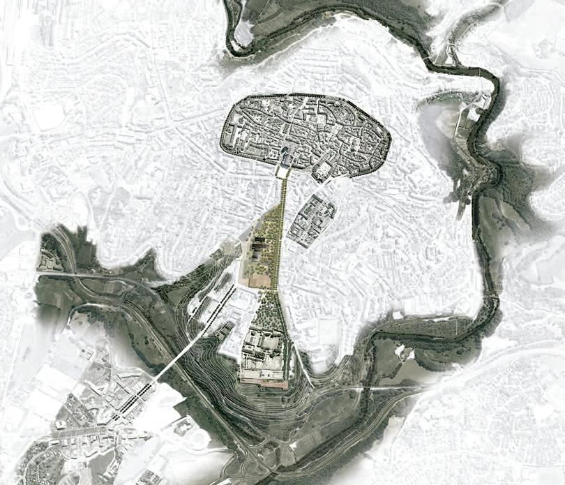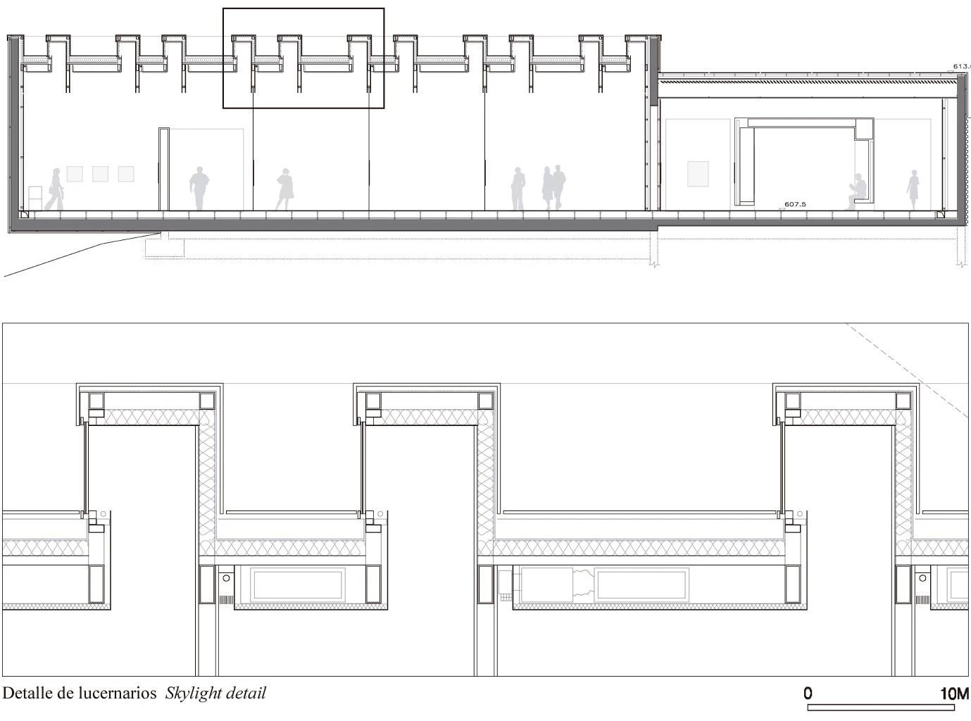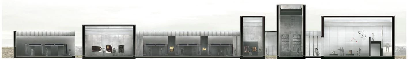 Así, una pieza longitudinal, paralela al bulevar que limita el parque, actuá como espina dorsal del edificio: en él se insertan una serie de volúmenes ciegos de diferentes alturas, creando un interesante ritmo en las fachadas. El desnivel sobre el que se sitúa el edificio permite, por un lado, minimizar su impacto visual en el parque —ya que parte de su volumen permanece semienterrado— y por otro, mostrar una imagen más monumental desde la zona baja de la ciudad. La disposición del cuerpo de administración, separado en planta baja del volumen principal pero conectado en planta superior por una pasarela de vidrio, permite atravesar el complejo gracias a unas escaleras exteriores que salvan la pendiente. El museo se recubre de una piel de vidrio y acero cortén, cuya pátina entrará en diálogo, al envejecer, con los espacios verdes que lo rodean.