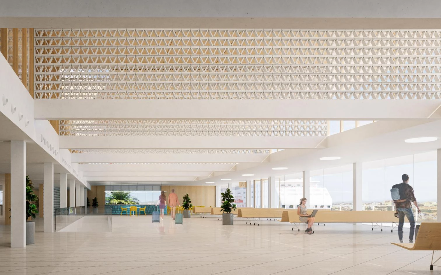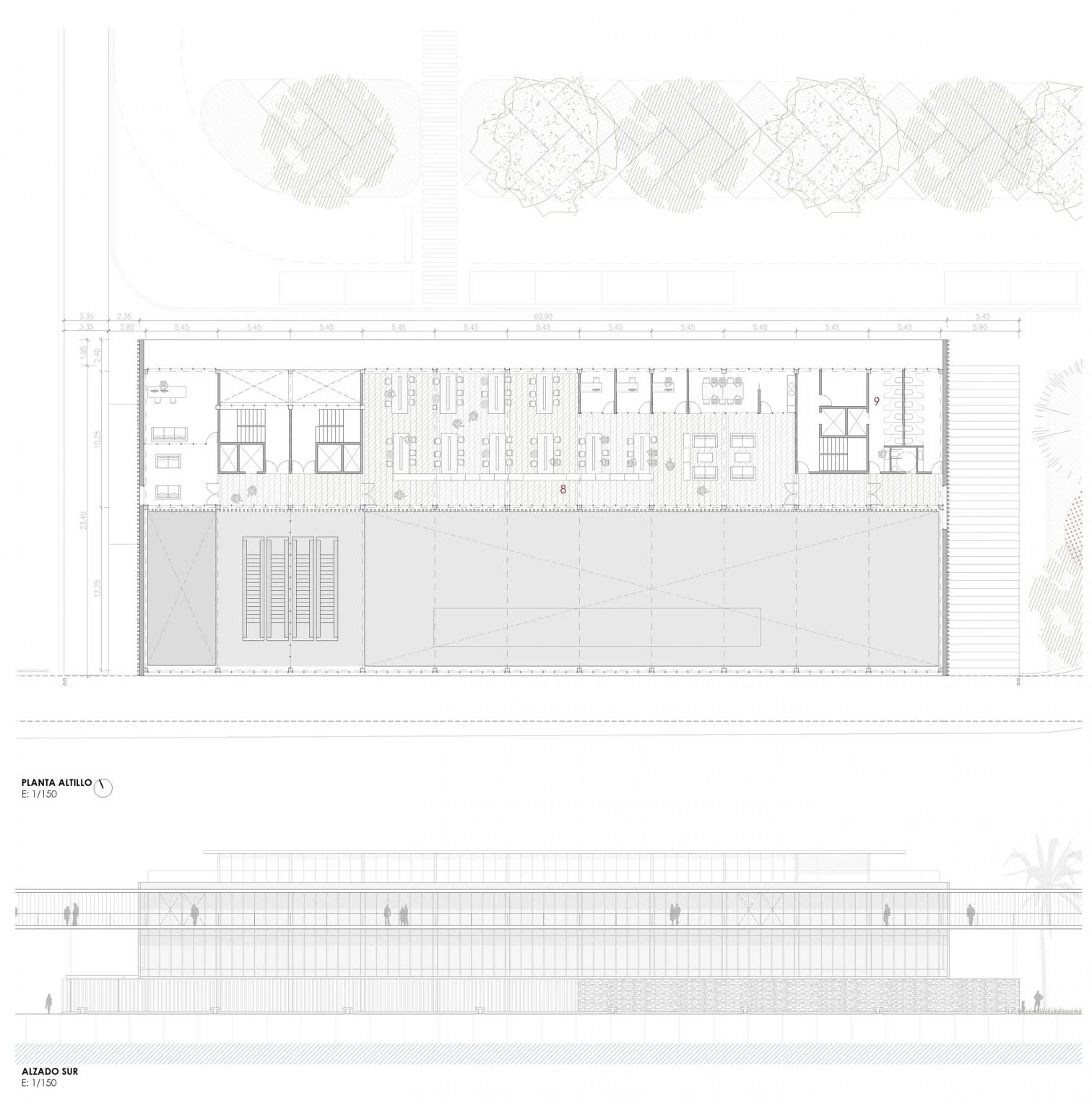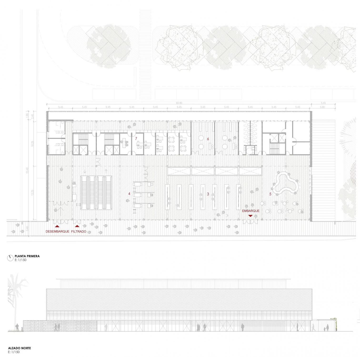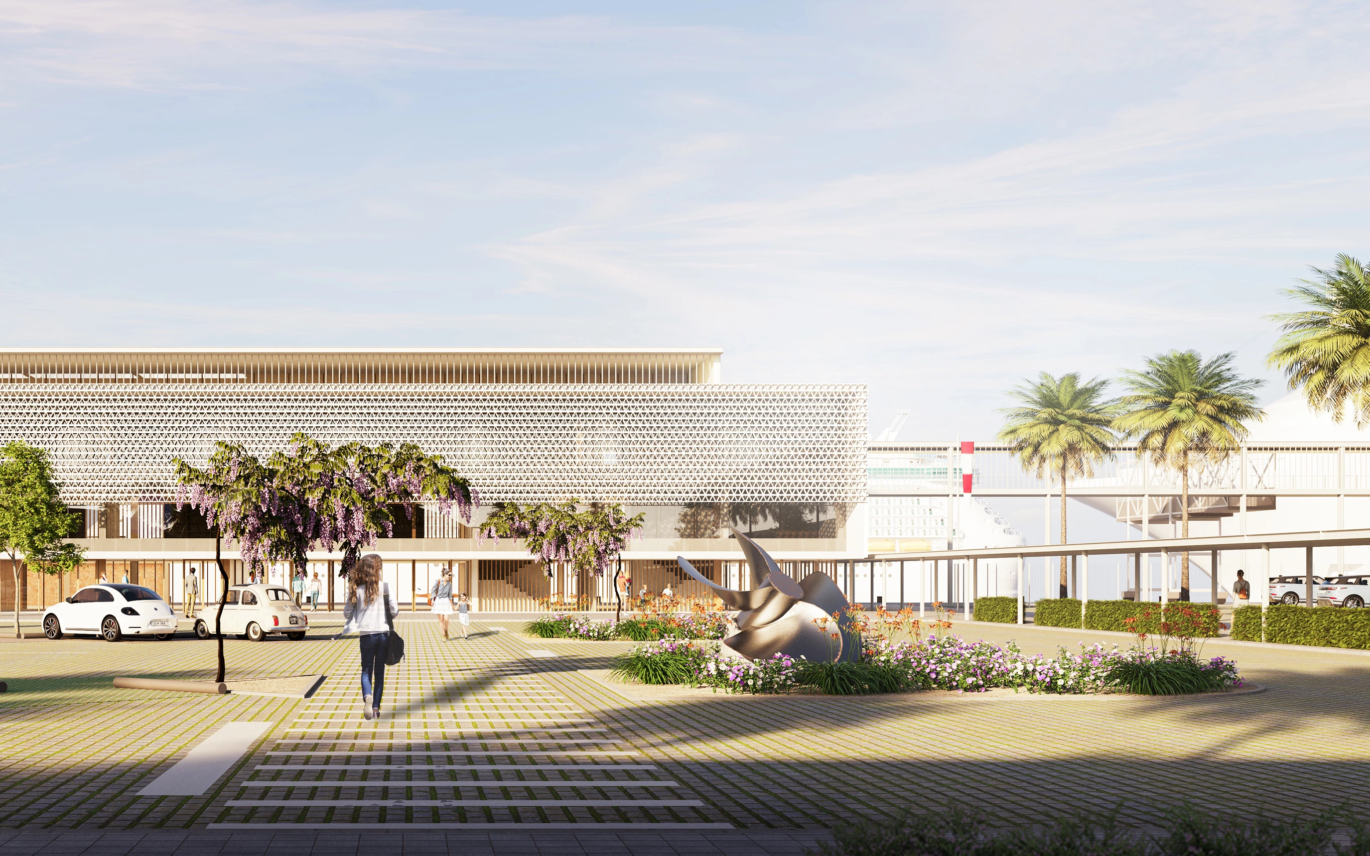 Se propone una intervención paisajística en todo el ámbito del muelle comercial que básicamente trata de renaturalizar el entorno. El edificio de la nueva estación marítima se convierte en límite que separa los usos públicos de los propios del puerto. No se generan zonas residuales y la actividad de circulación de vehículos y pasajeros se realiza desde una gran plataforma de llegada a la terminal.