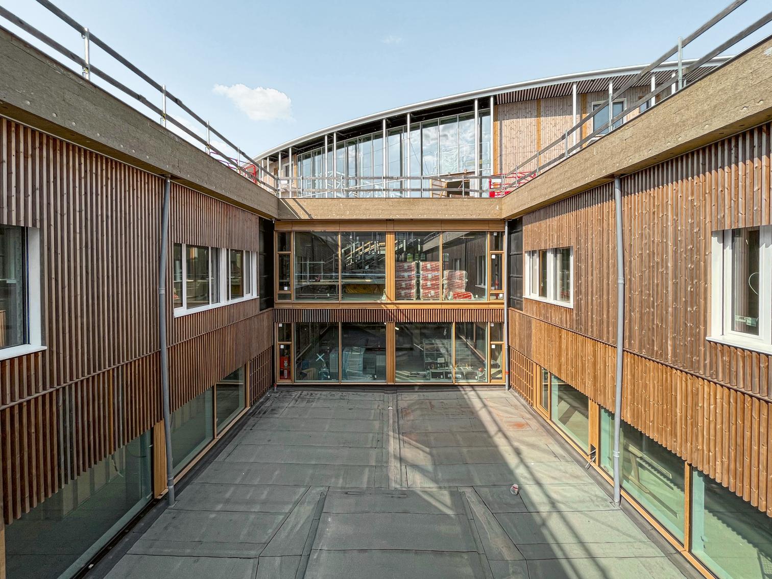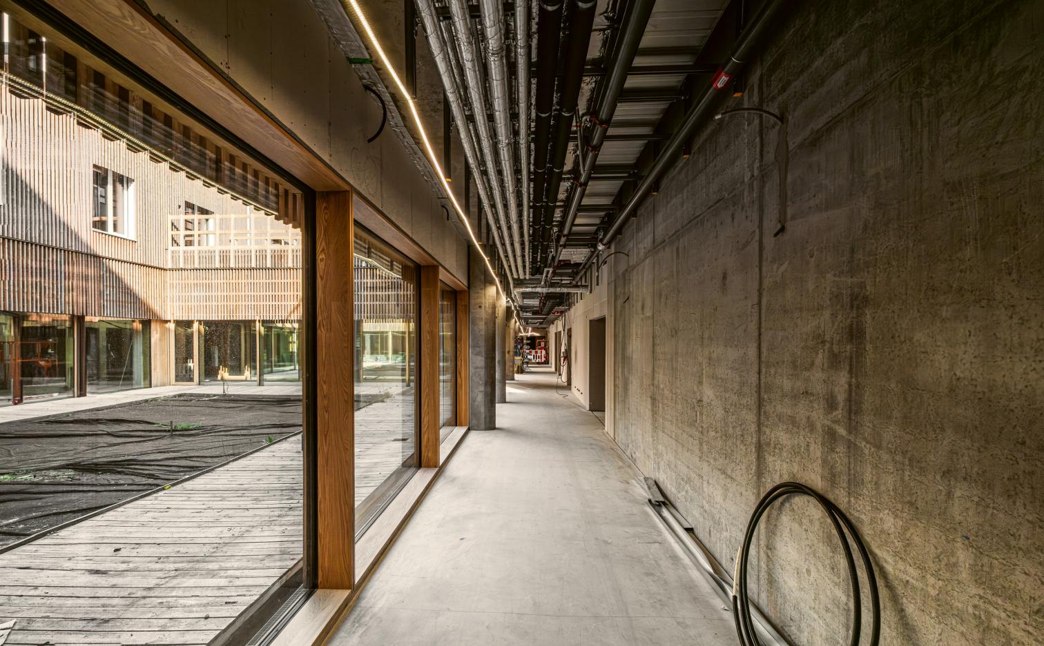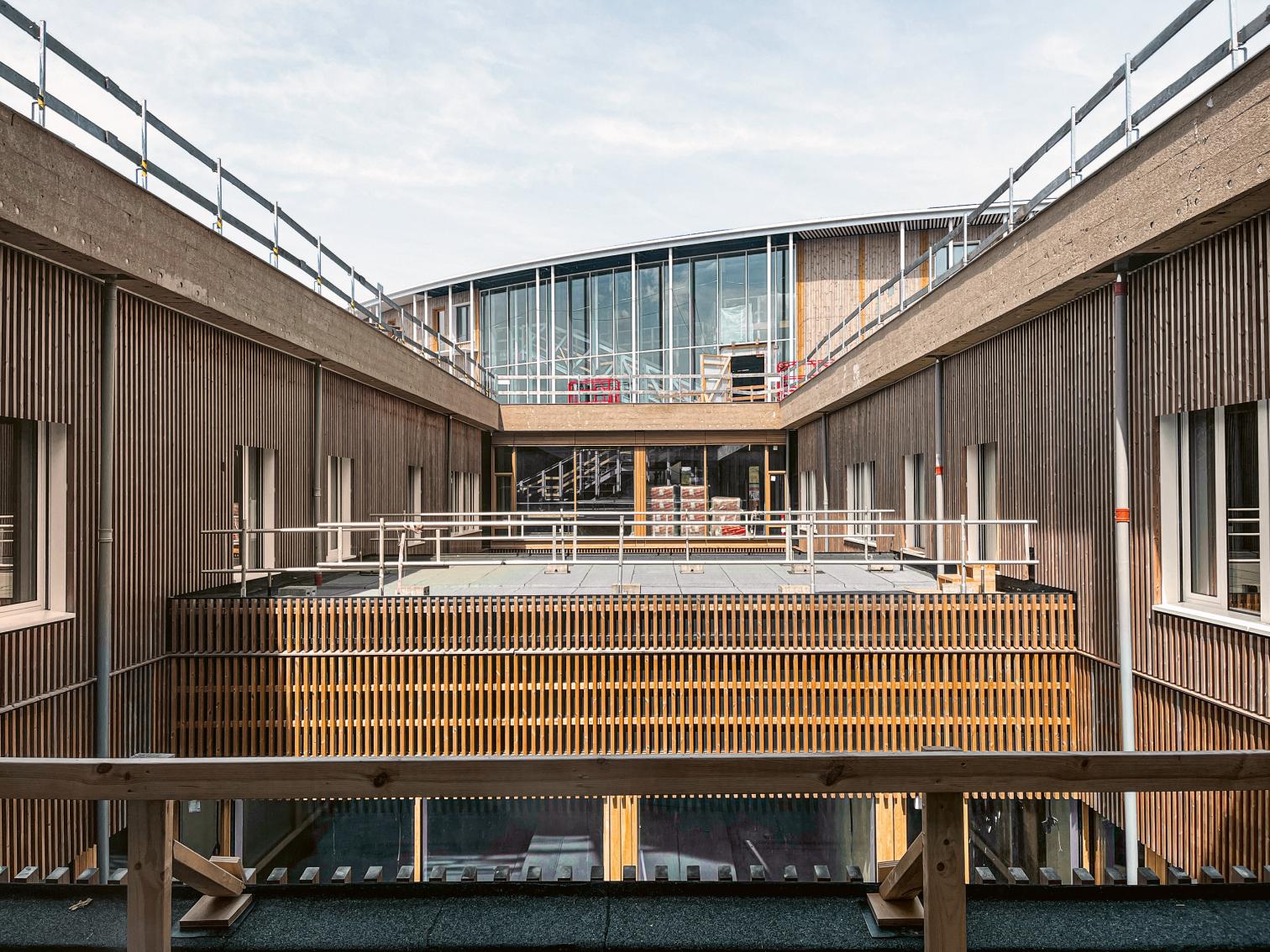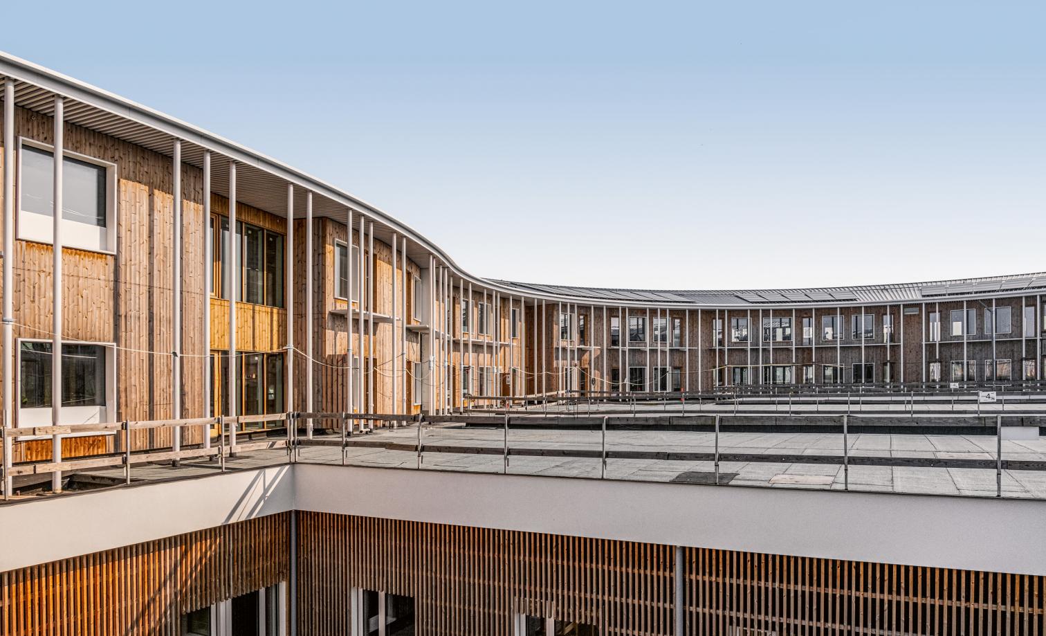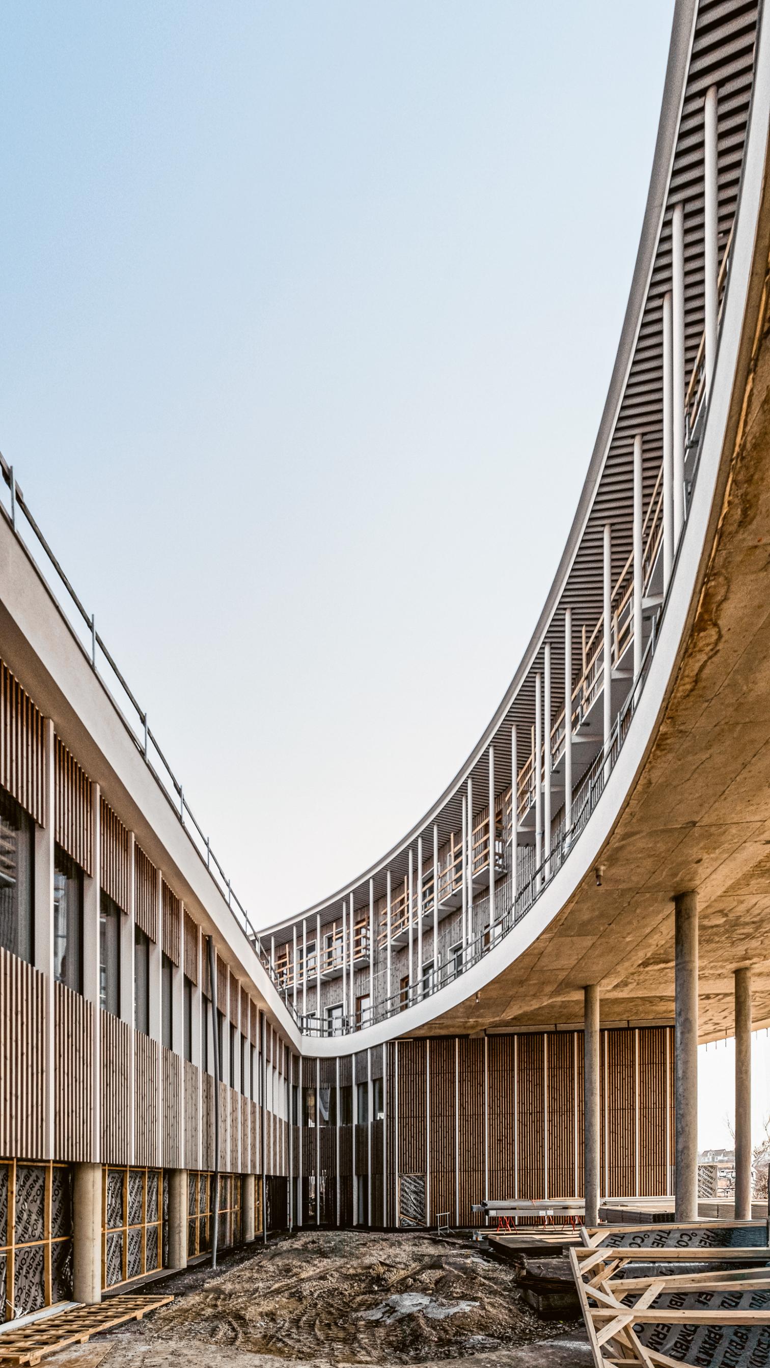 La planta baja se define por una fachada continua que estimula el sentimiento de comunidad, mientras que los pabellones superiores, módulos prefabricados, ofrecen una escala más íntima. La elevación de las habitaciones permite vistas al jardín y a un paisaje que combina dos tipologías danesas: el bosque perimetral, con claros que sirven de aparcamiento, y un núcleo recogido donde arbustos y setos estructuran una red de senderos.