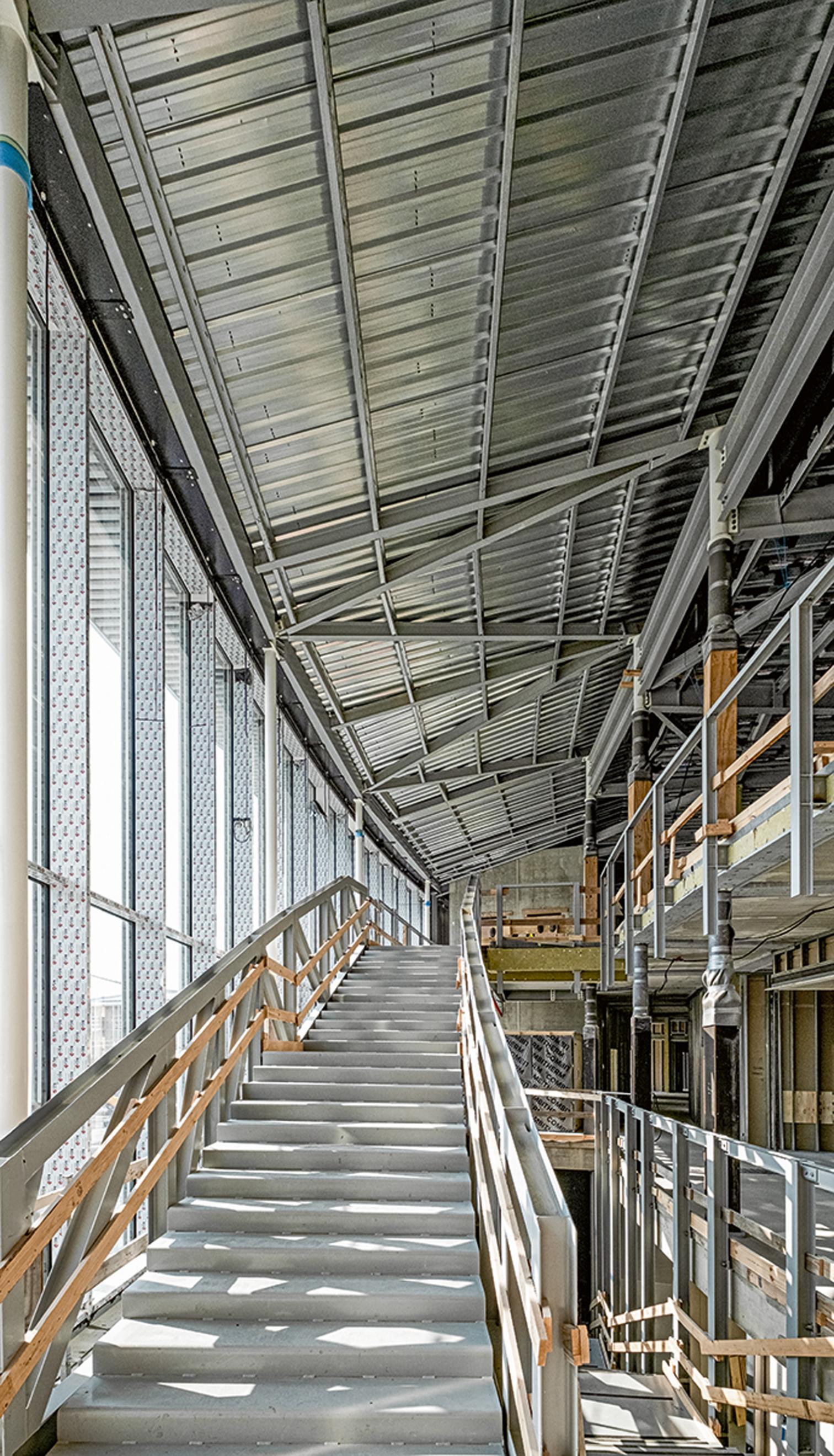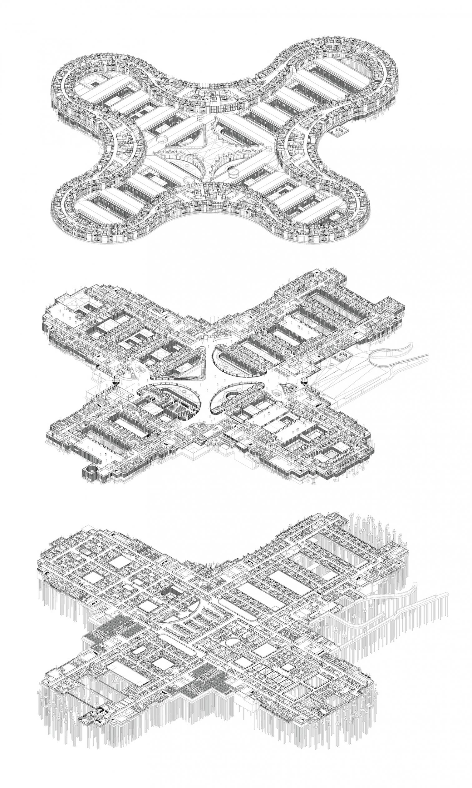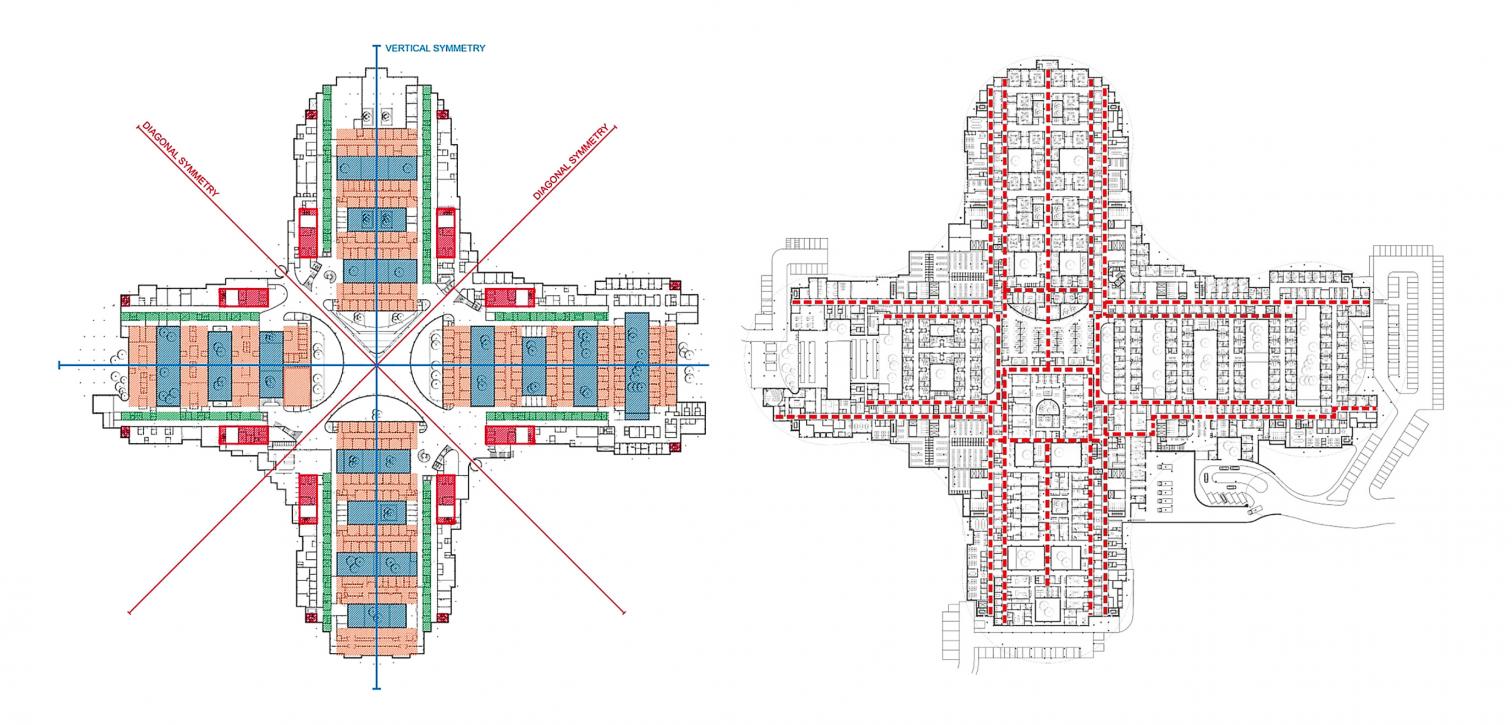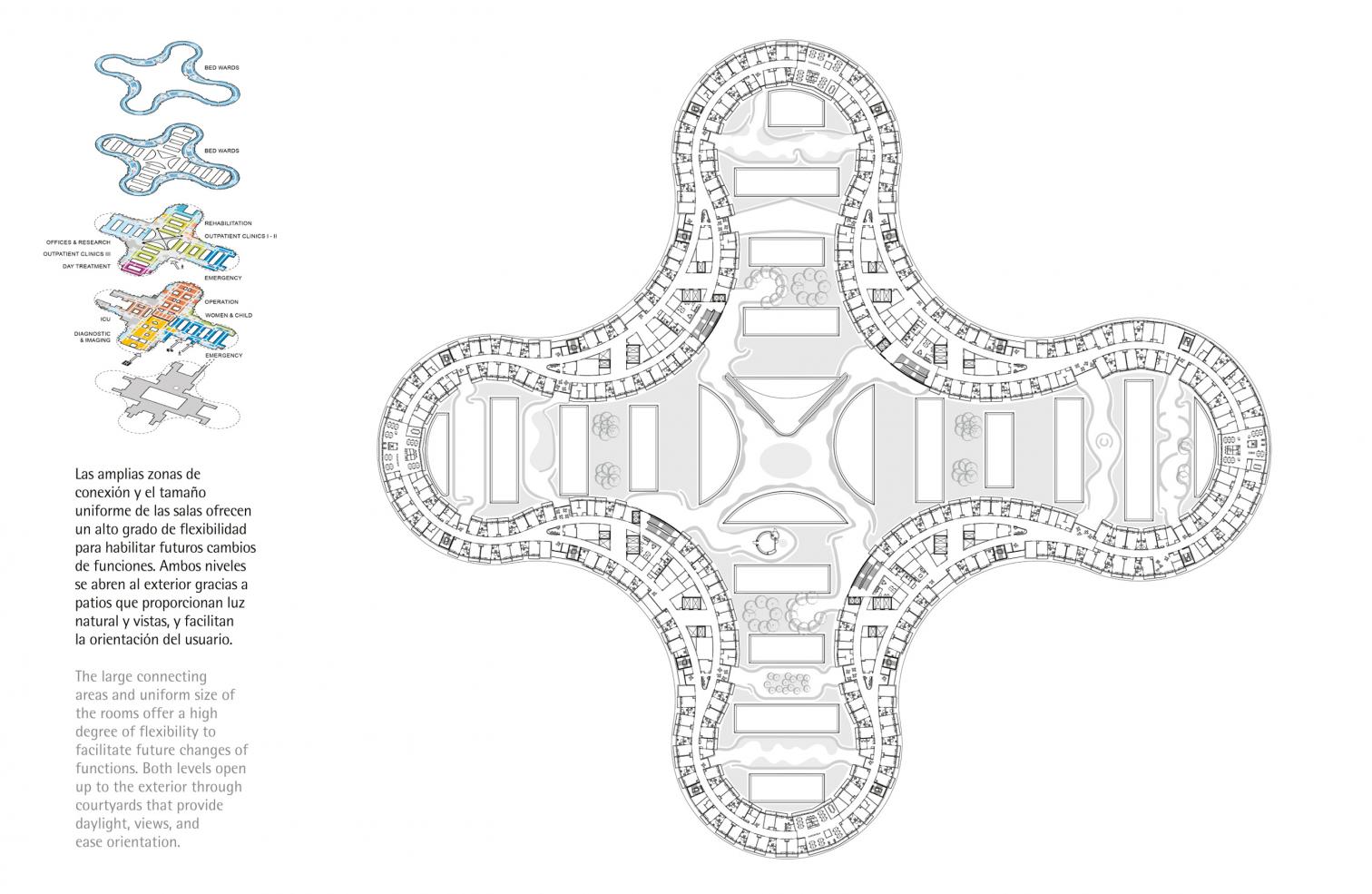 La base del hospital se organiza en dos niveles en los que se suceden las salas de diagnóstico y tratamiento; por otra parte, las habitaciones se colocan en la serpenteante estructura superior, más liviana, que además de definir el paisaje, concentra los servicios de mayor afluencia. De esta manera, los flujos de pacientes ambulatorios y hospitalizados se separan por niveles a distinta cota conectados por amplios espacios de comunicación.