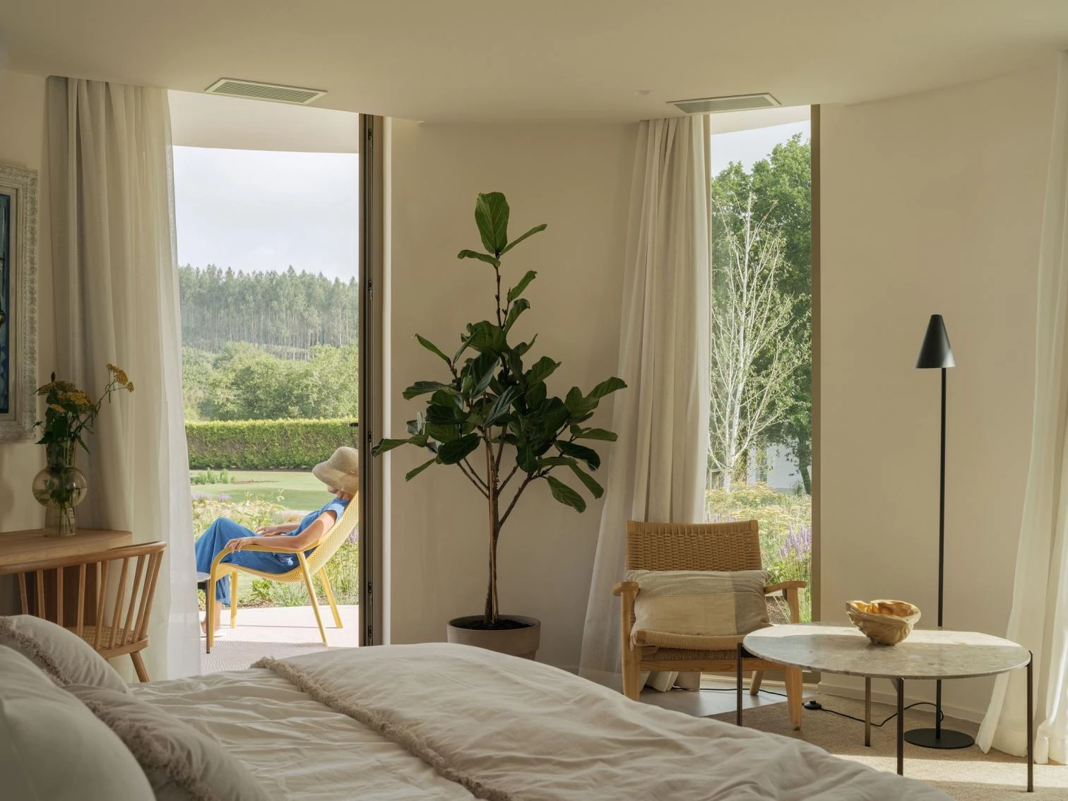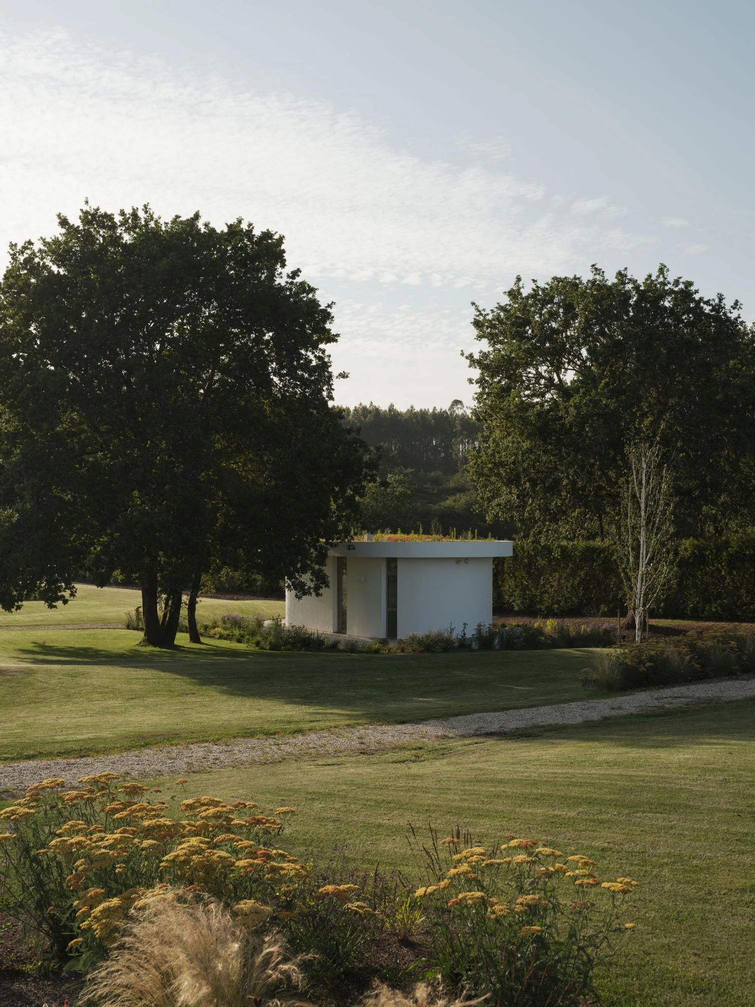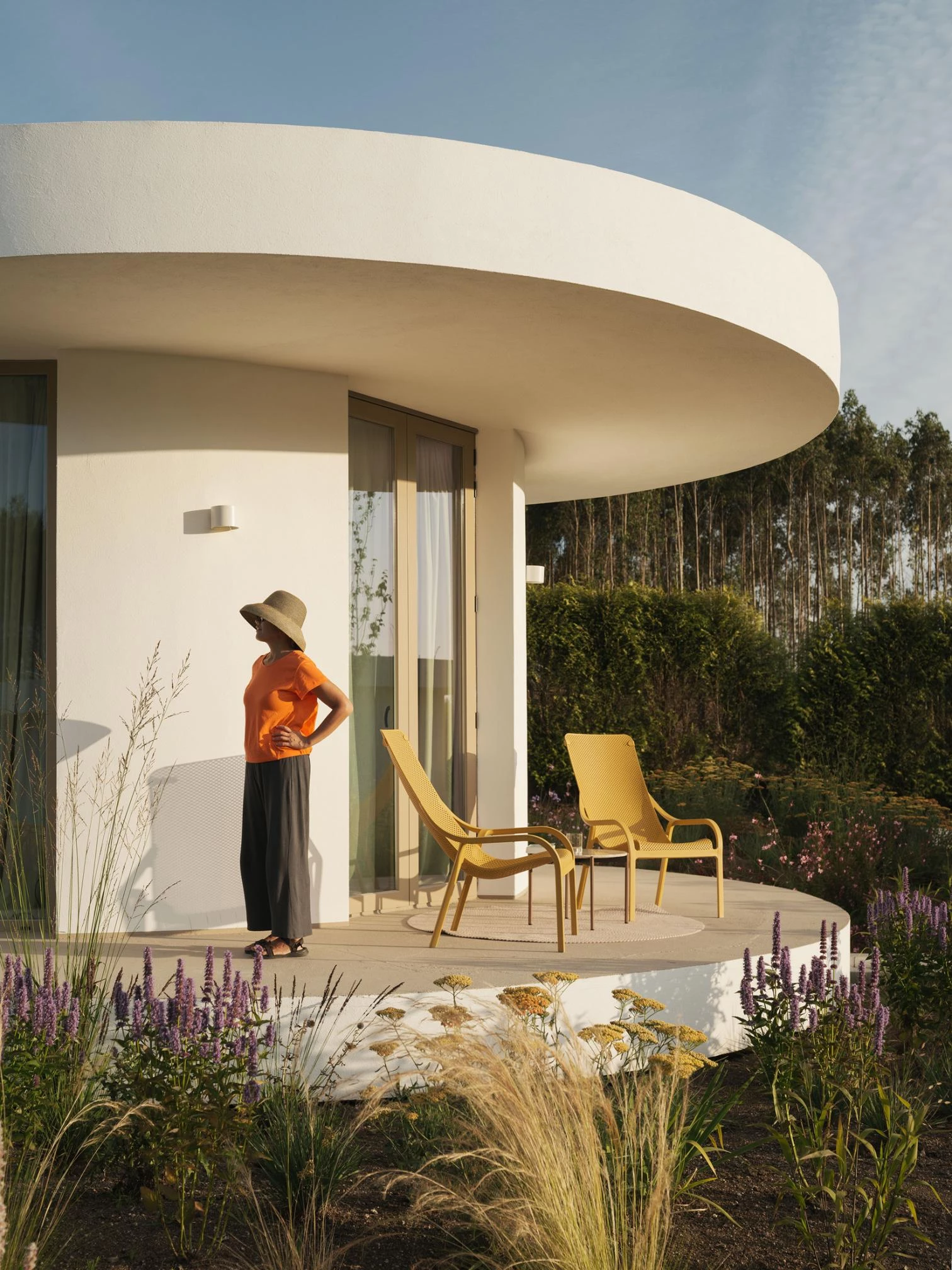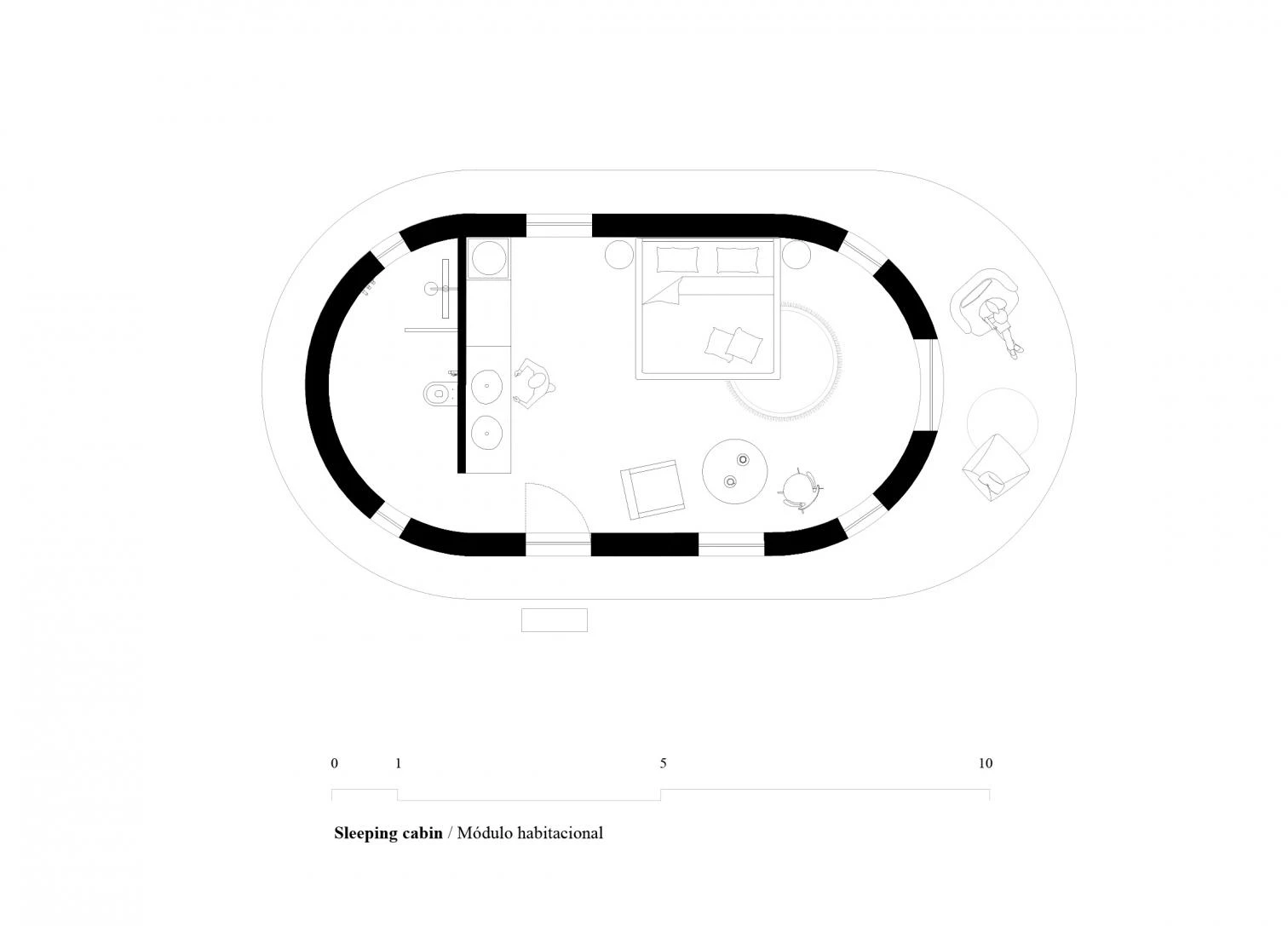 El estudio gallego liderado por María Teresa Sánchez Táboas, Gramática Arquitectónica, firma el proyecto Retiro da Costiña en el que una serie de alojamientos y un restaurante salpican una parcela del municipio de Santa Comba, comarca coruñesa del Jallas. Elevados sobre el nivel del suelo, los módulos curvos de diferentes tamaños se reducen a dos placas, losas o forjados, cuyas formas están inspiradas en las viviendas encontradas en los restos arqueológicos de los castros gallegos. Con una cubierta ajardinada, cada pieza alberga un dormitorio, un baño y un pequeño salón, extendiéndose al exterior con una terraza. Sus fachadas continuas presentan grandes aperturas verticales. El conjunto está delimitado por una muralla vegetal perimetral. Fuera de ella, los colores permanecen estables durante el año con los eucaliptos, árboles de hoja perenne. En el interior, los colores cambian según las estaciones con las flores, los huertos y los árboles autóctonos caducifolios.