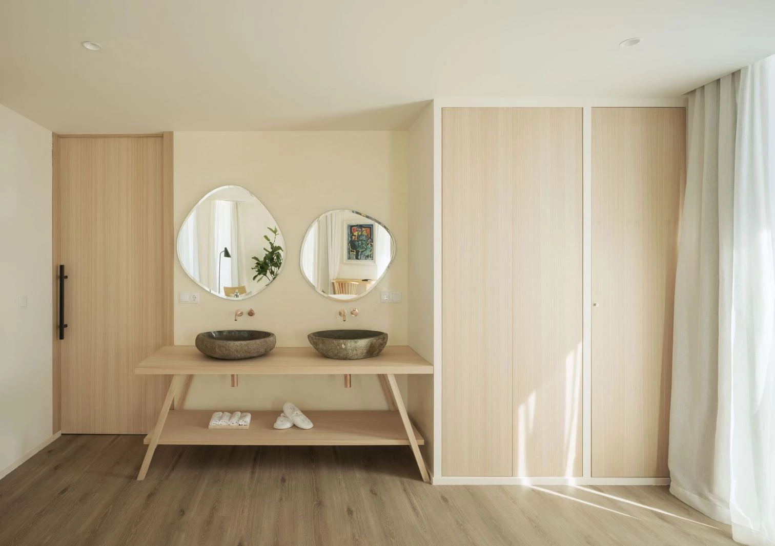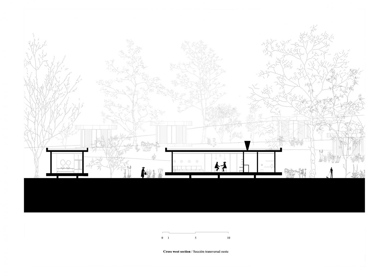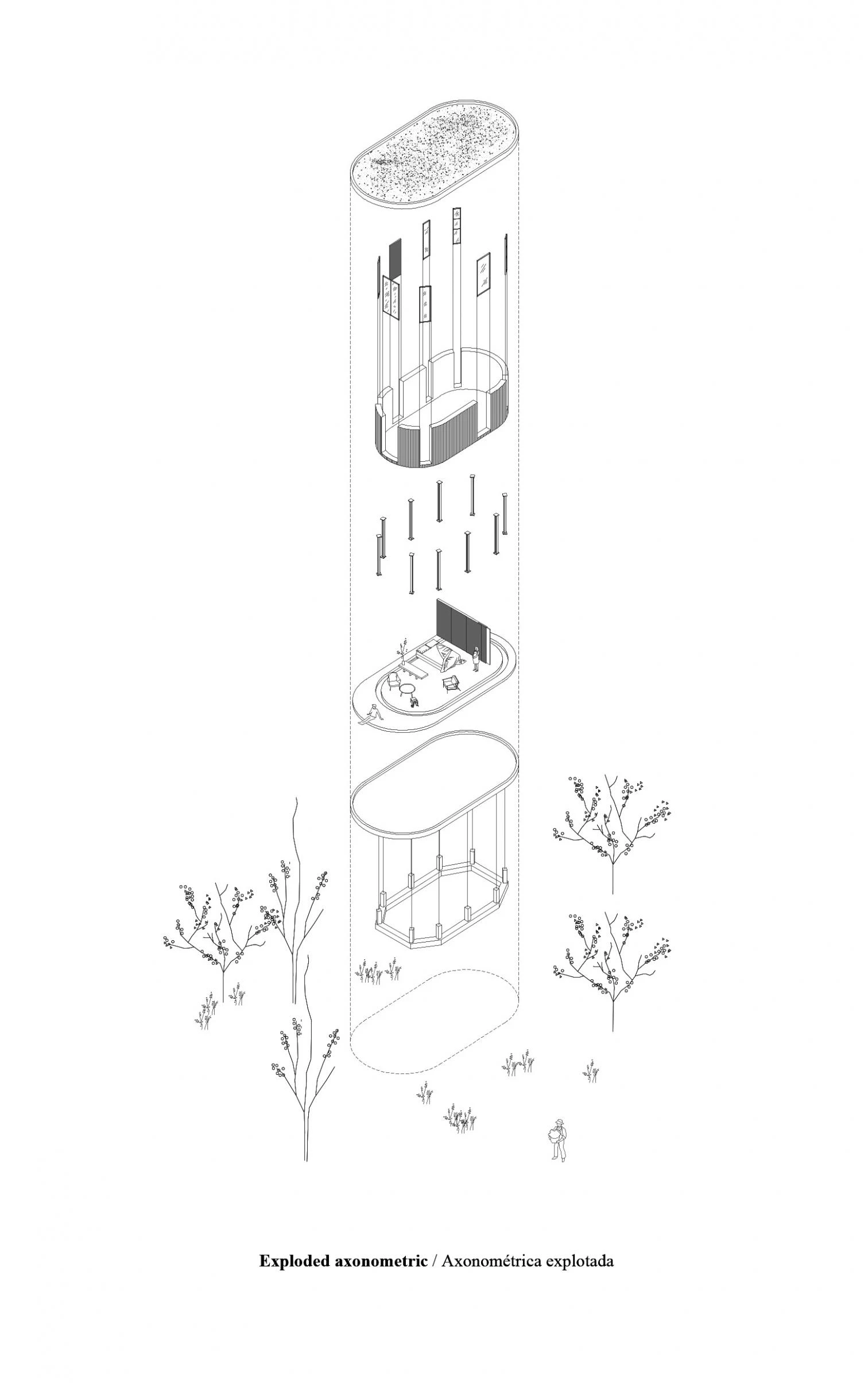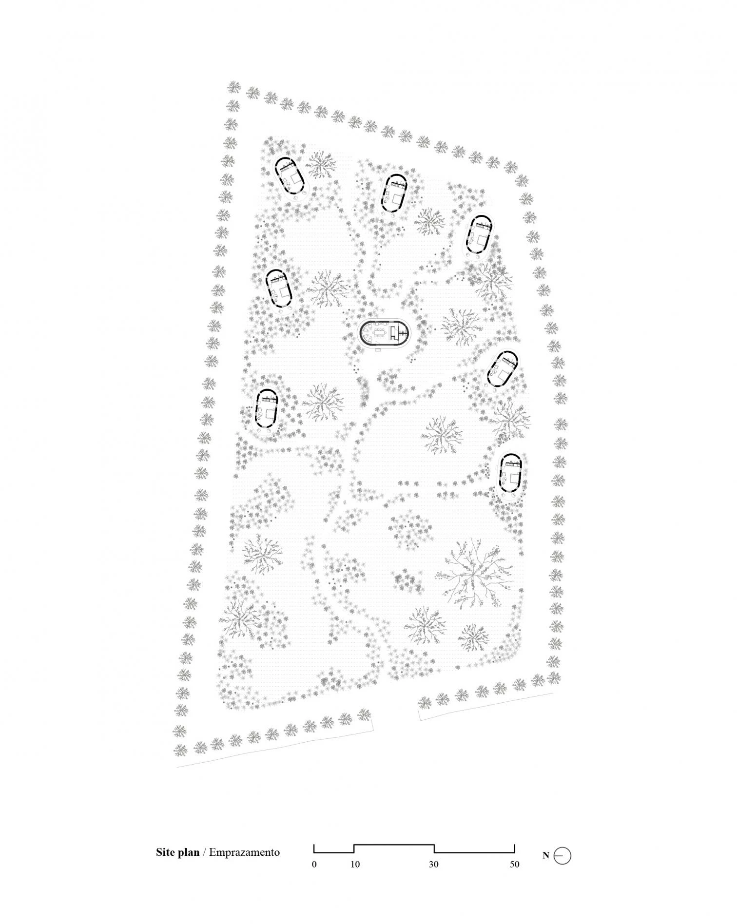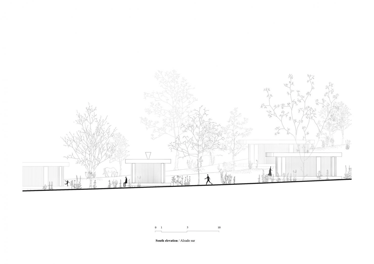 El estudio gallego liderado por María Teresa Sánchez Táboas, Gramática Arquitectónica, firma el proyecto Retiro da Costiña en el que una serie de alojamientos y un restaurante salpican una parcela del municipio de Santa Comba, comarca coruñesa del Jallas. Elevados sobre el nivel del suelo, los módulos curvos de diferentes tamaños se reducen a dos placas, losas o forjados, cuyas formas están inspiradas en las viviendas encontradas en los restos arqueológicos de los castros gallegos. Con una cubierta ajardinada, cada pieza alberga un dormitorio, un baño y un pequeño salón, extendiéndose al exterior con una terraza. Sus fachadas continuas presentan grandes aperturas verticales. El conjunto está delimitado por una muralla vegetal perimetral. Fuera de ella, los colores permanecen estables durante el año con los eucaliptos, árboles de hoja perenne. En el interior, los colores cambian según las estaciones con las flores, los huertos y los árboles autóctonos caducifolios.
