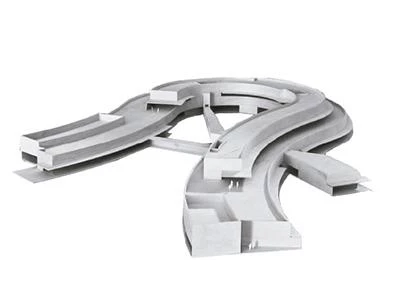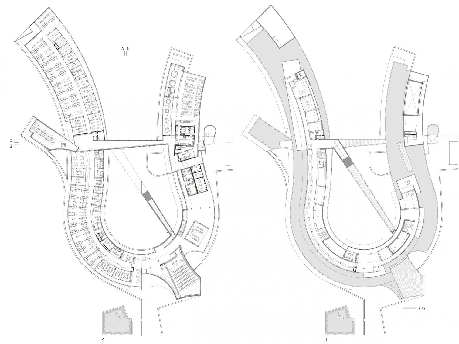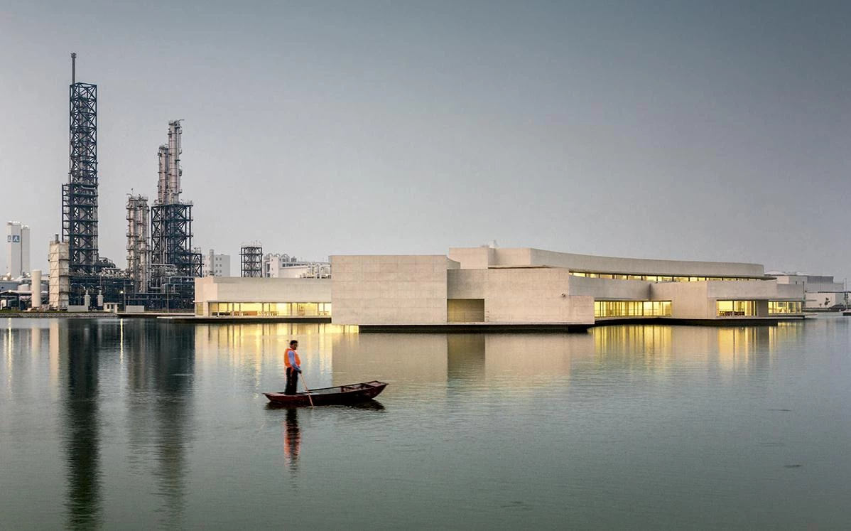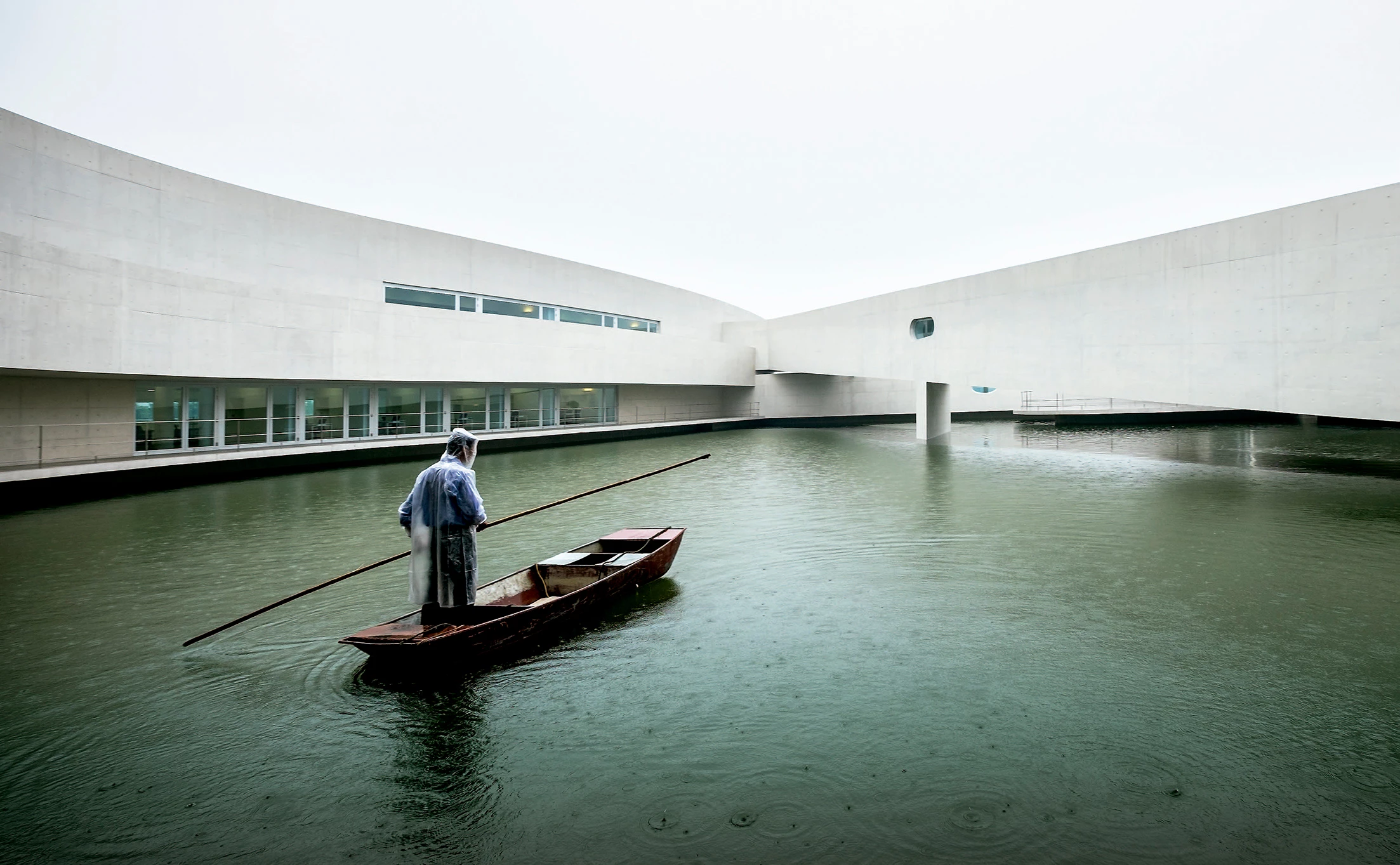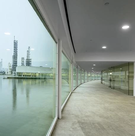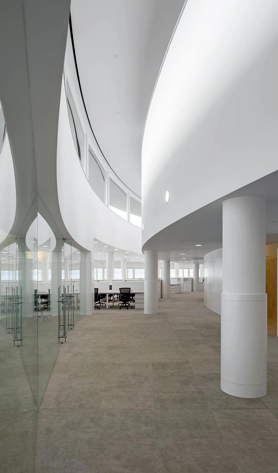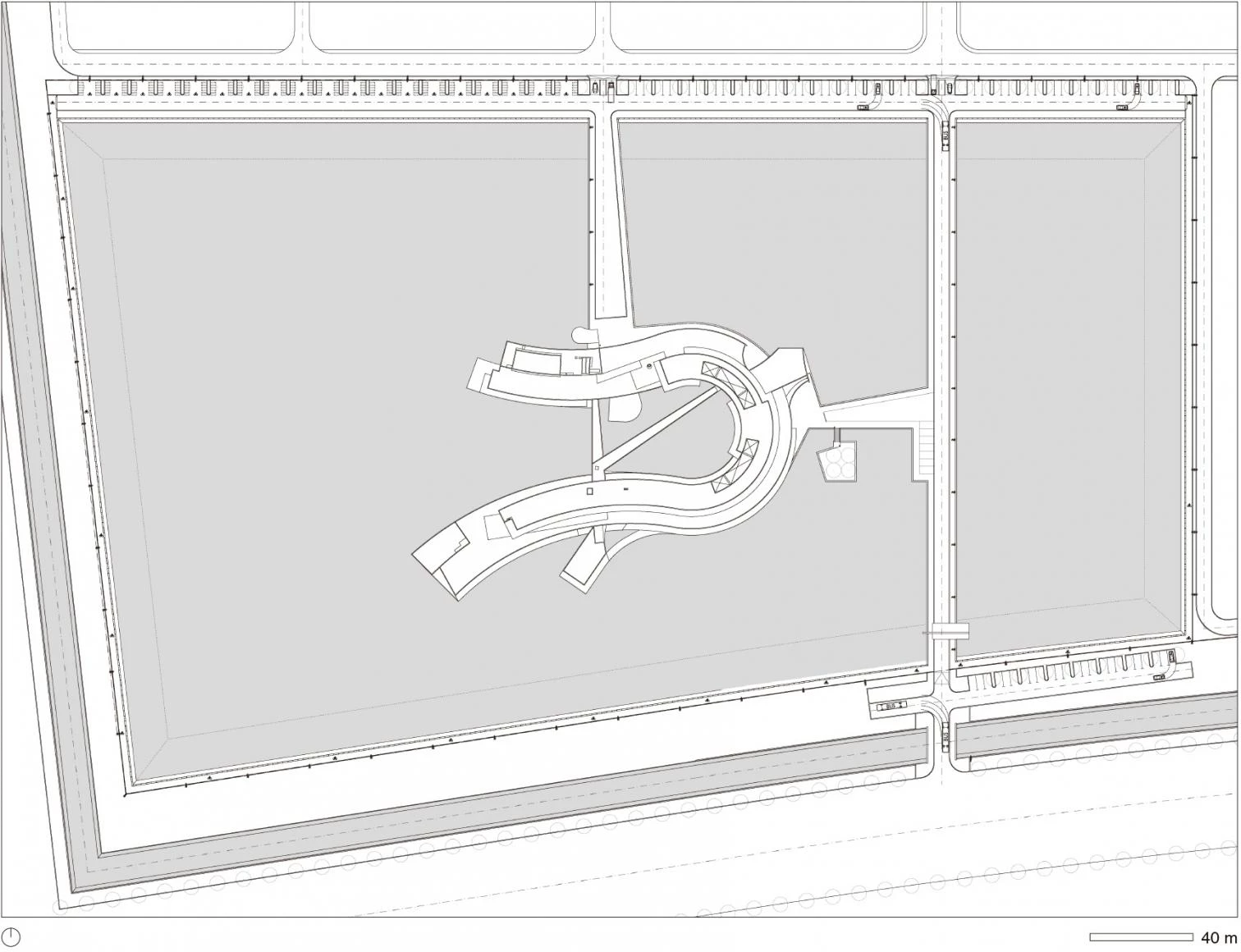 Como un dragón enroscado y dormido, el edificio de oficinas de la compañía de industrias químicas Shihlien Group emerge en el centro de un lago artificial en la ciudad de Huaiyin, en la provincia china de Jiangsu. La idea de situar la construcción sobre el agua estaba implícita en el plan director del complejo, ya que la fábrica necesita una gran reserva para asegurar su producción constante. El edificio, que alberga las oficinas distribuidas en dos plantas, está formado por una pastilla longitudinal que se dobla en forma de herradura y se conecta con el resto de los equipamientos a través de dos pasarelas perpendiculares que continúan la trama urbana del complejo fabril. Con un fuerte carácter escultórico, las líneas curvas que delimitan el volumen principal fugan en direcciones opuestas, generando espacios de circulación que fluyen a lo largo del perímetro y perspectivas abiertas hacia el paisaje industrial.