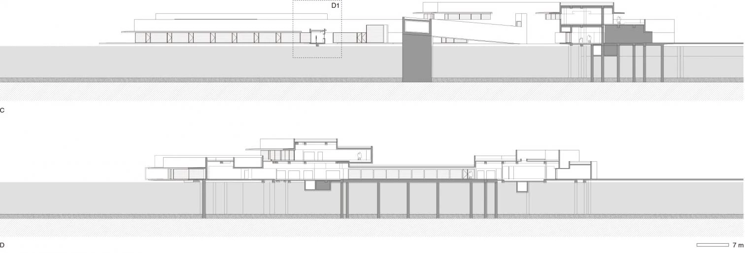 Conceptualmente el proyecto flota sobre el agua, pero constructivamente la estructura se apoya en el fondo del estanque a ocho metros de profundidad. La sensación de levedad que transmite el reflejo en el lago se intensifica gracias a que los soportes se ocultan en una posición retranqueada y la plataforma inferior avanza en voladizo, de manera que se percibe un vacío entre el agua y el edificio.