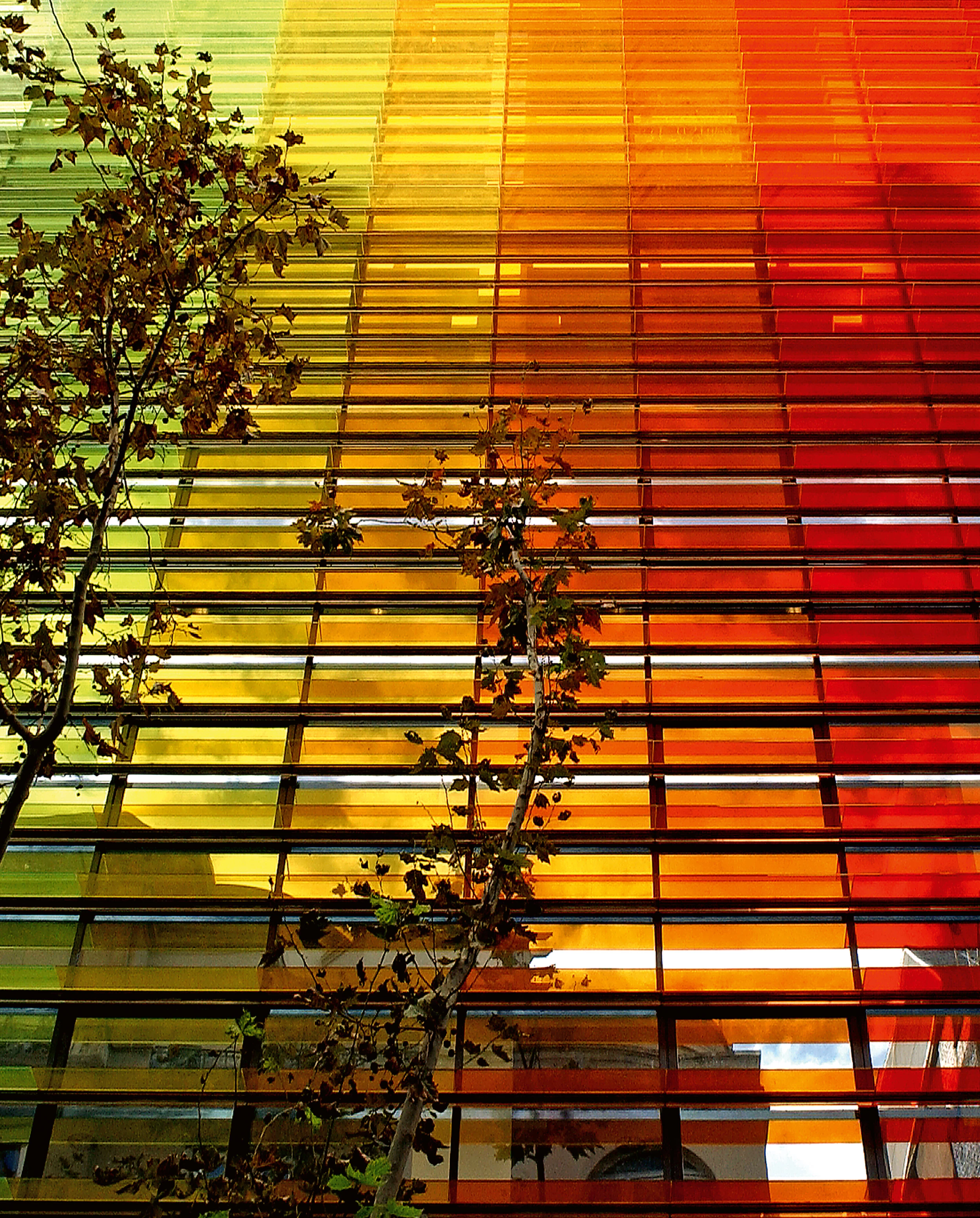 En la fachada el color se extiende en una progresión ascendente, desplegada en unos parasoles horizontales de vidrio transparente coloreado, formando un plano que flota sin límite preciso frente al cerramiento, a modo de gran persiana de escala urbana que toma prestados los colores de los omnipresentes toldos de los balcones del vecindario.