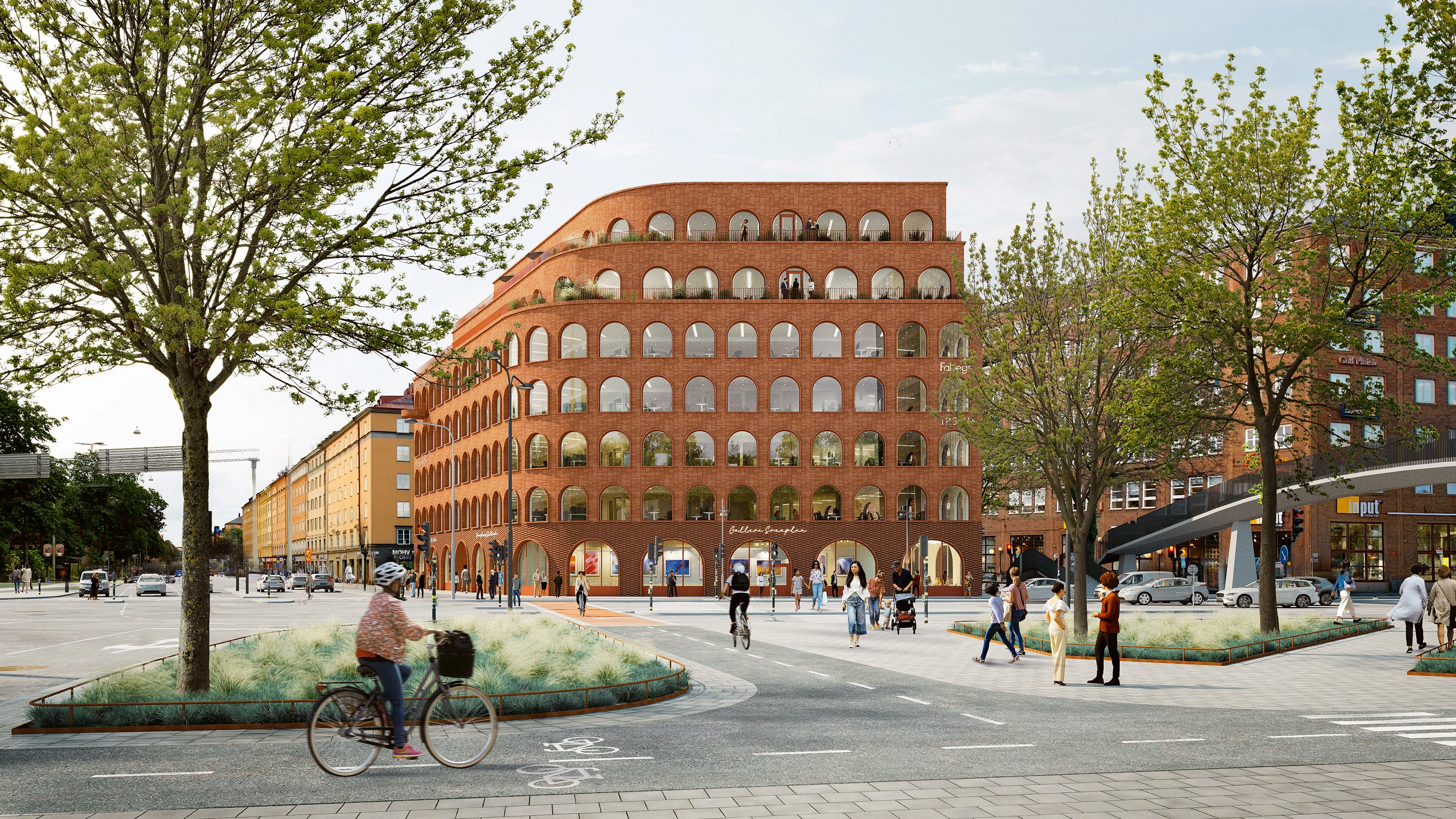 La geometría curvada de la planta persigue liberar superficie y generar espacios públicos adicionales en torno al cruce de Sveavägen y también alrededor del acceso de la pasarela peatonal que conecta el solar con el norte. En altura, las dos últimas plantas se retranquean siguiendo el esquema volumétrico de los edificios aledaños. Tanto los materiales empleados para el revestimiento (distintas piezas de ladrillo rojizo) como la disposición y ritmo de los huecos arqueados están inspirados en ejemplos del patrimonio arquitectónico de la capital sueca. A nivel de la calle, la escala de los arcos aumenta y permite una estructura flexible para los accesos, escaparates y entrada a un aparcamiento subterráneo para bicicletas...[+]