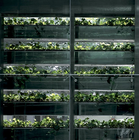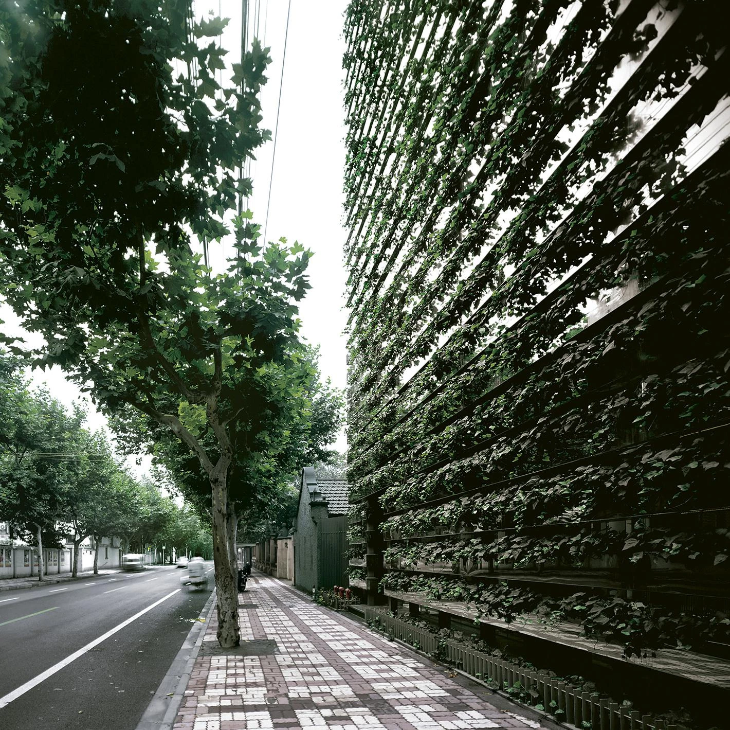 Un filtro verde, formado por lamas horizontales de hiedra y acero, protege la nueva sede de la empresa Zhongtai Lighting Group del intenso bullicio de Shanghái. El proyecto parte de la reforma de una antigua fábrica existente que se renueva, conservando su armazón estructural e introduciendo elementos naturales como la luz, el agua o la vegetación para amortiguar la contaminación exterior y generar un ambiente apacible de trabajo. Hacia la calle principal, la fachada está formada por una serie de maceteros apilados revestidos mediante chapa de acero inoxidable; mientras que, en el interior, los mismos soportes sirven de apoyo a un muro cortina de vidrio. Tras esta primera pantalla, un gran atrio actúa como lugar de recepción y establece la comunicación vertical entre los diferentes niveles.