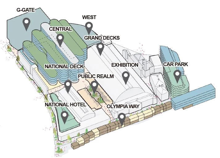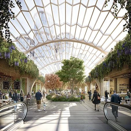 Una de las estrategias clave de esta transformación es la mejora de la conectividad en el enclave usando el espacio público como elemento capaz de ligar una gran variedad de viejos y nuevos edificios. De toda la superficie pública, al menos una hectárea se dedicará a zonas verdes, donde se incluirán asimismo plazas y pasos peatonales vinculados entre sí. Un jardín elevado contribuirá a mejorar la atmósfera de un enclave en el que se ha buscado, por otra parte, integrar los nuevos usos sin que esto suponga alterar las características del emblemático edificio victoriano original. El resultado será un programa capaz de combinar lo público y lo verde con dotaciones diversas, que irán desde un hotel, un teatro de 1.500 butacas, un centro de artes escénicas y un multicine, hasta 62.000 metros cuadrados destinados a espacios de coworking y restaurantes con propuestas gastronómicas innovadoras.