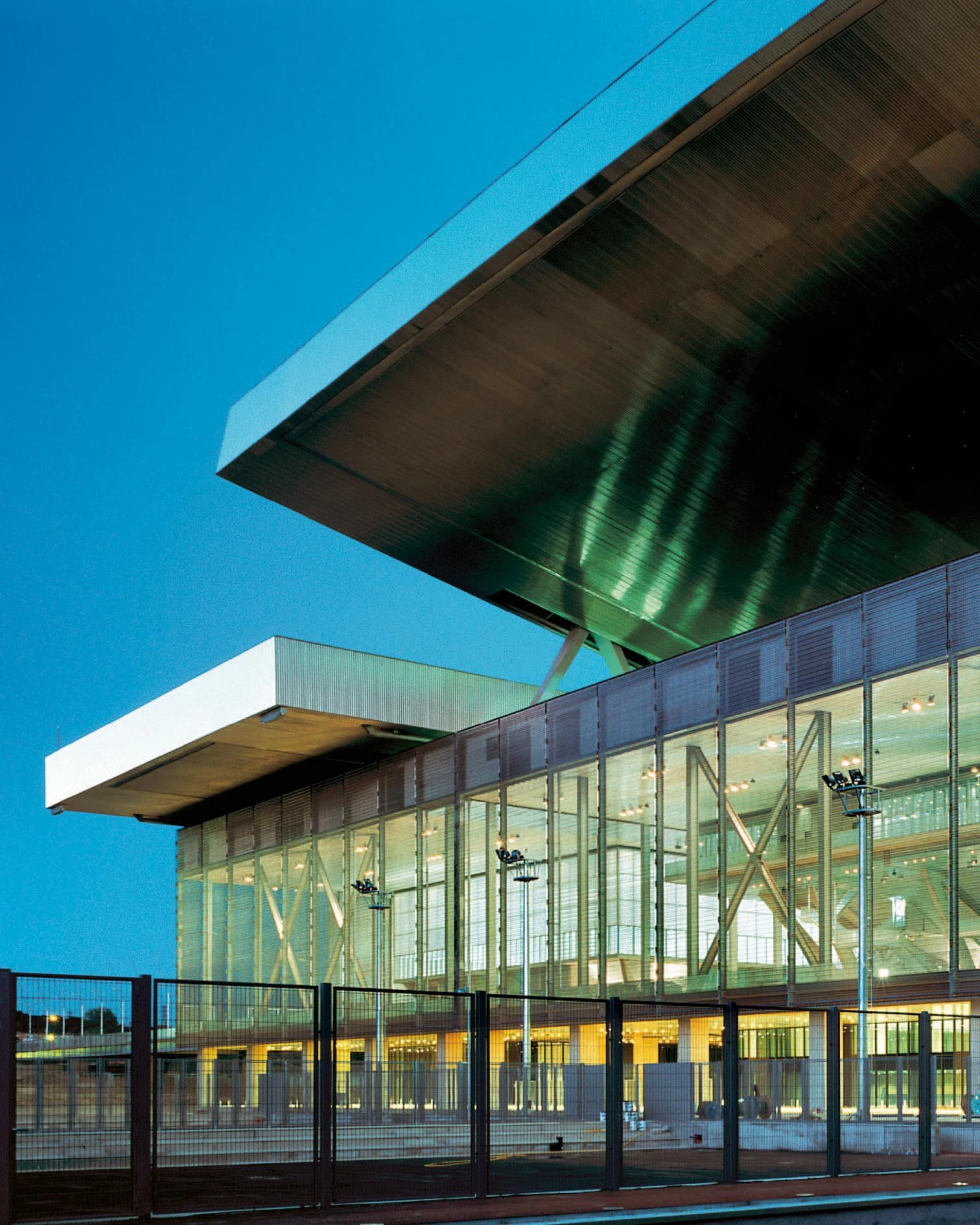 Las tres grandes pistas de tenis, situadas dentro de esta ‘caja mágica’, están adaptadas para acoger múltiples usos. Sus cubiertas están dotadas de un doble sistema de apertura hidráulica —de rotación y desplazamiento— que permite transformar el es-pacio interior cerrado en uno exterior abierto. Estos movimientos en la gran escala de la estructura pro-yectan una sombra viva sobre el paisaje, dando la impresión de que el edificio se gira para contem-plarlo. Al mismo tiempo, las cubiertas abiertas, de acabado metálico, actúan como un espejo que atrae la atmósfera del exterior al interior, y a la inversa.