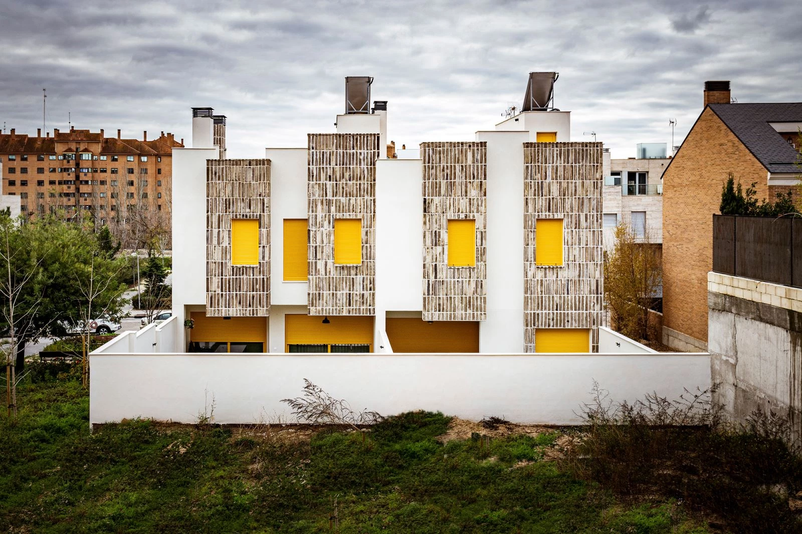 La firma de Madrid fundada por Joaquín Millán Villamuelas, OOIIO Arquitectura, ha sido la encargada de levantar estas dos casas en el barrio de Montecarmelo, en el distrito madrileño de Fuencarral-El Pardo. Adaptándose a las necesidades de dos familias diferentes, los diseños atienden a configuraciones personalizadas donde una vivienda contiene un patio interior y la otra no, sin mostrar las variaciones en el exterior. La composición presenta volúmenes verticales cuyo movimiento en la línea fachada genera sombras, en una configuración que presenta paños de ladrillo tosco para proteger del sol a estas viviendas adosadas.