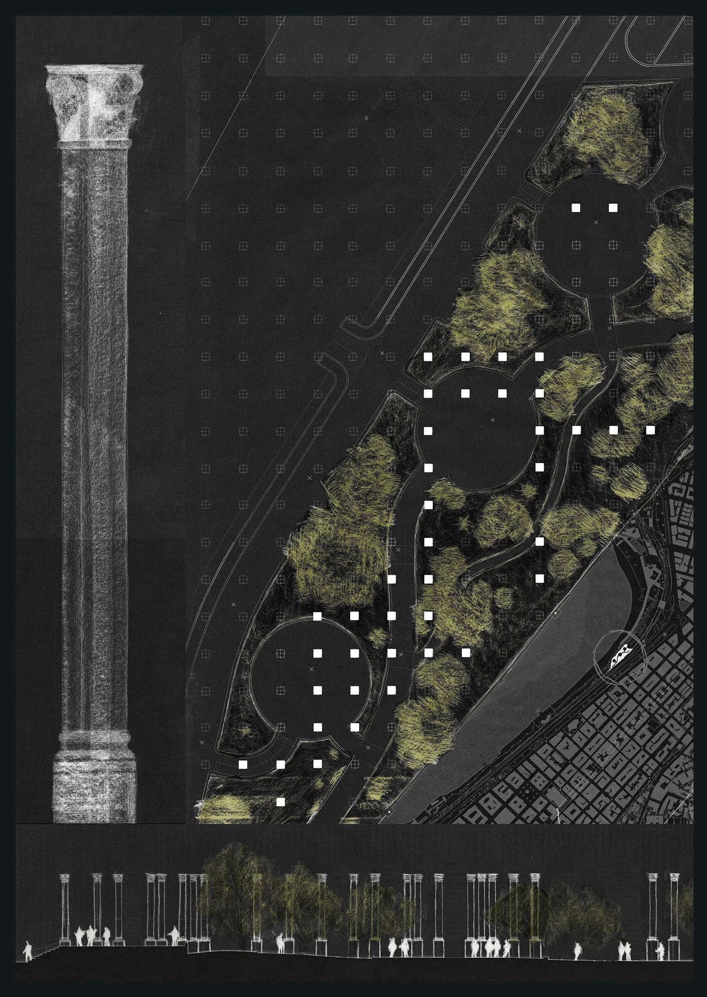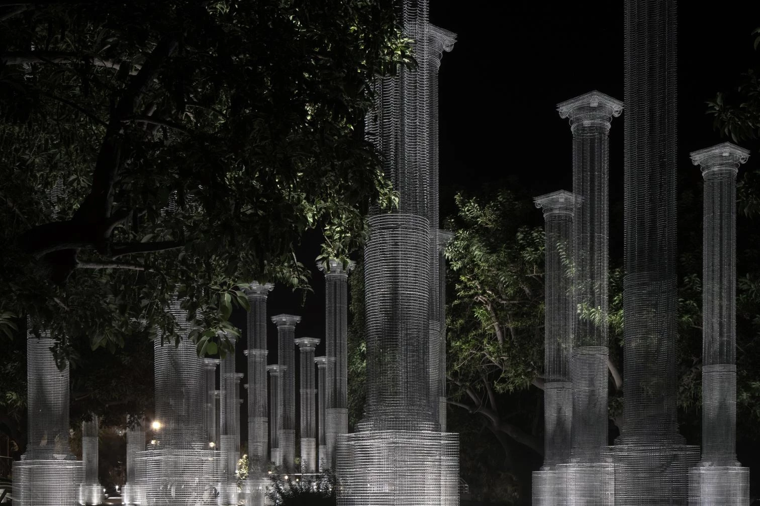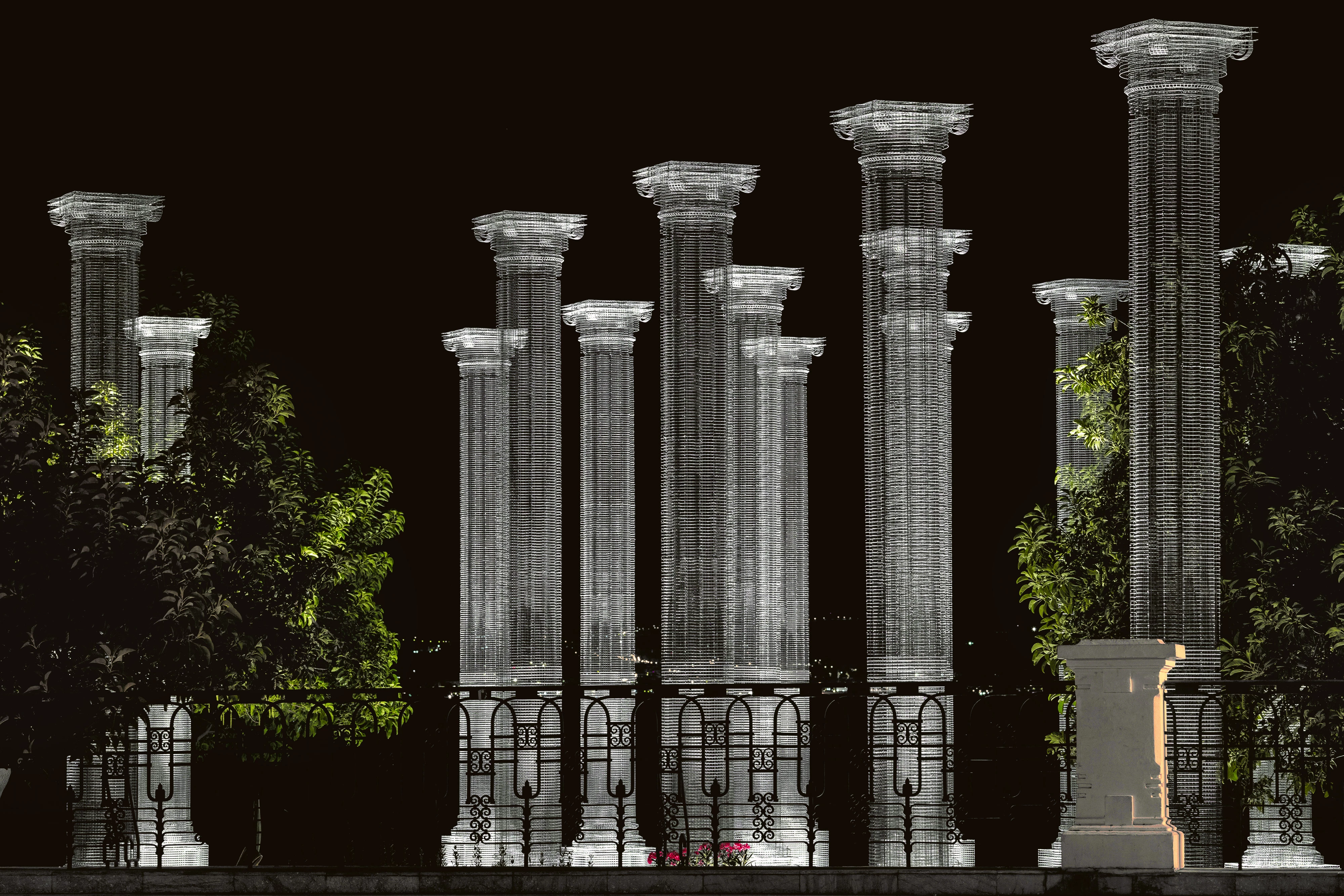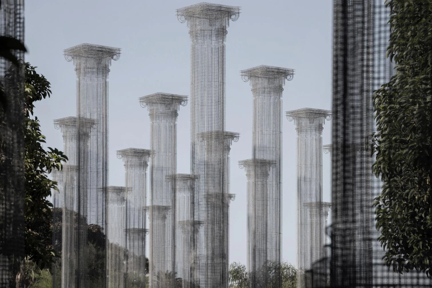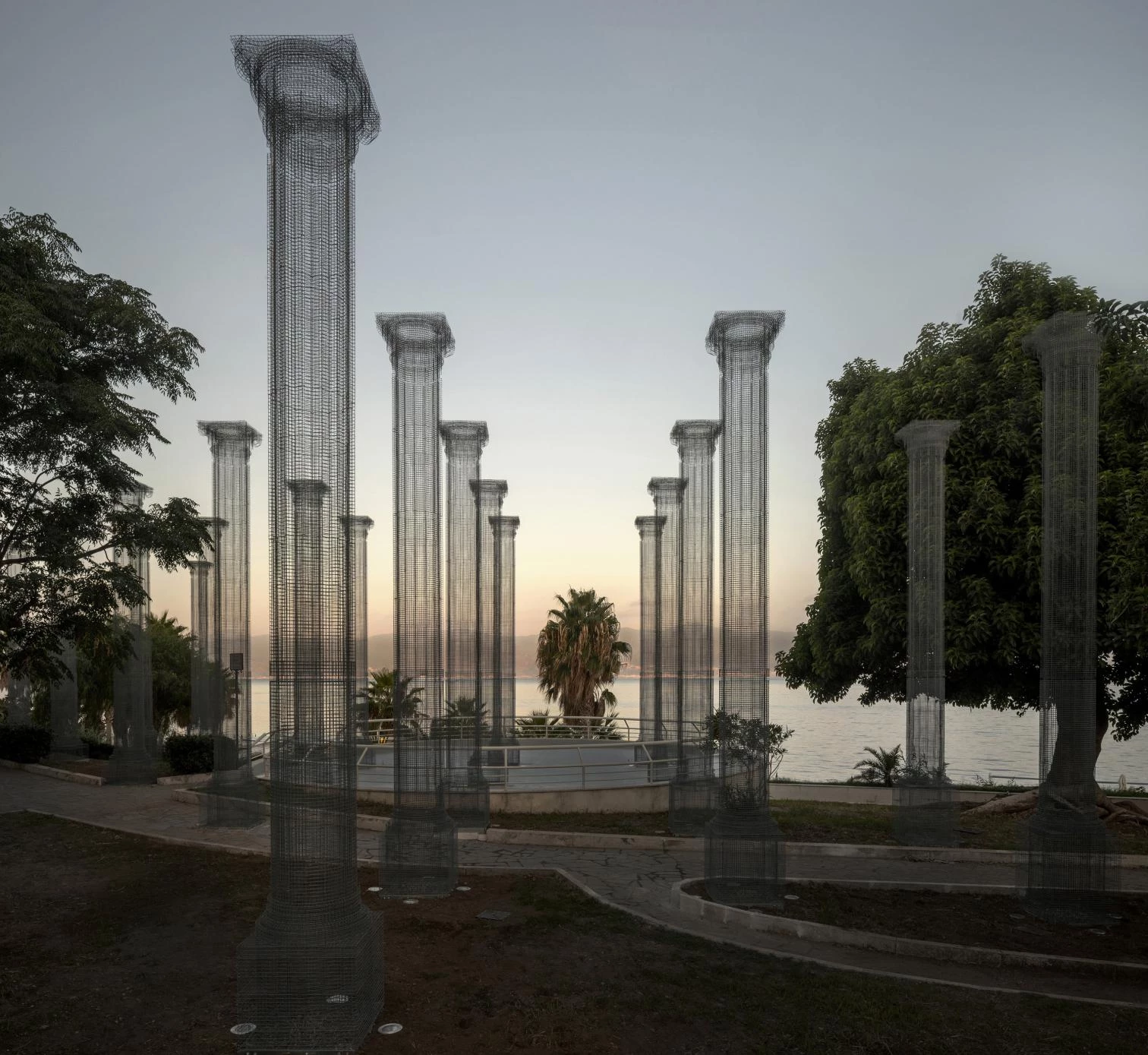 Frente a las costas sicilianas y con la imponente presencia del Etna en la lejanía, cuarenta y seis columnas exentas de ocho metros de alto se extienden a lo largo del paseo marítimo de Reggio Calabria para conformar una retícula ortogonal que se superpone al sinuoso trazado del parque a orillas del mar Mediterráneo. Su construcción con malla galvanizada electrosoldada les otorga una materialidad difusa y etérea que se suma a los juegos escénicos y los fenómenos ópticos que ocurren en el mítico estrecho de Mesina.