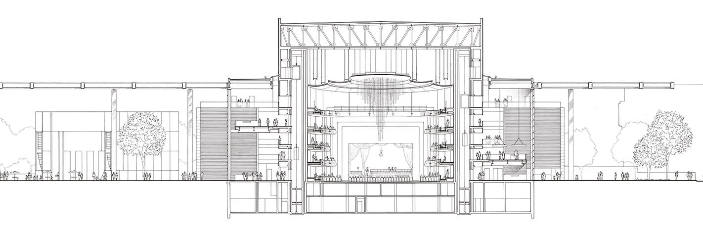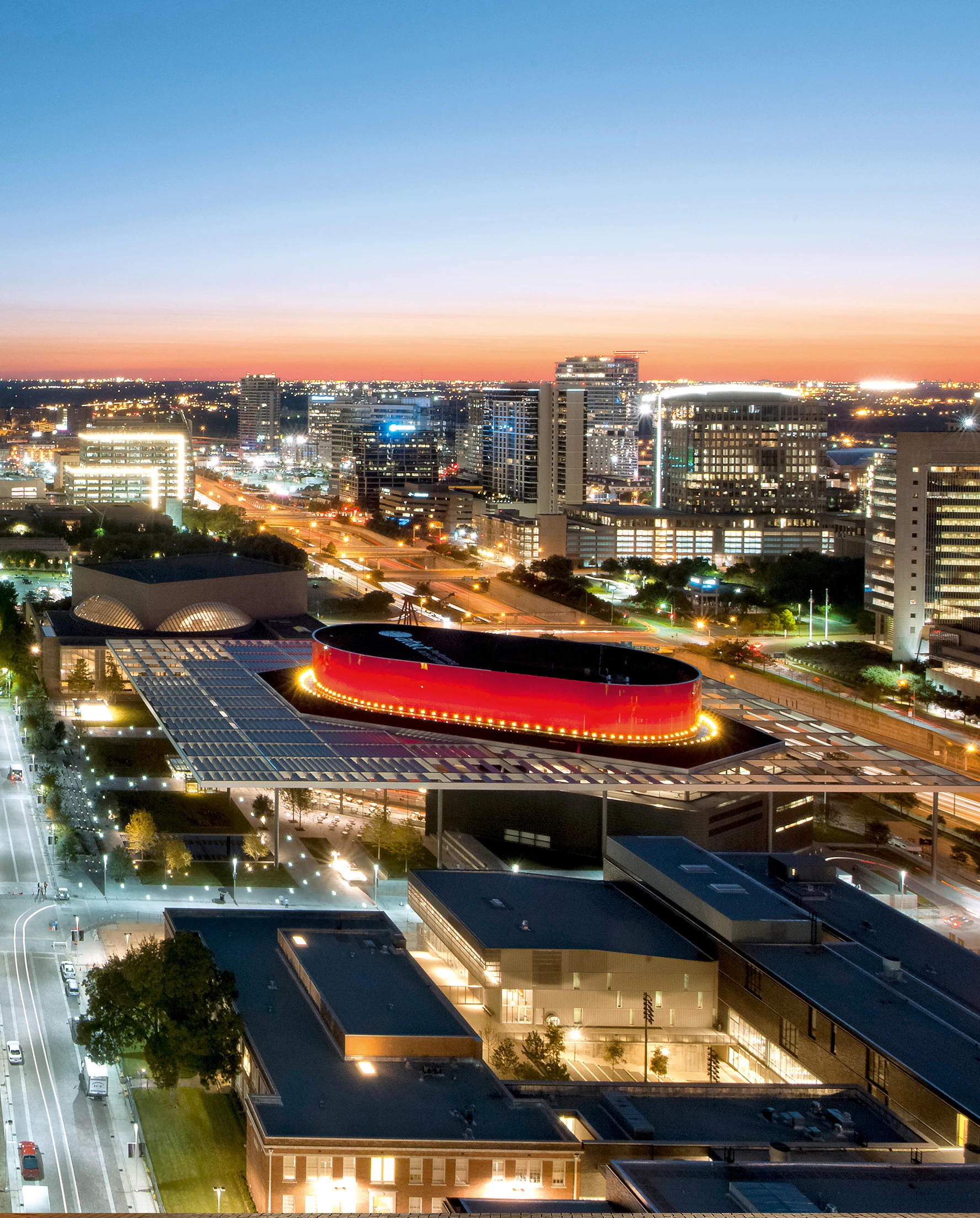 La nueva Ópera Winspear en Dallas redefine la esencia de lo que debe ser un edificio dedicado a la ópera en el siglo xxi, eliminando barreras históricas para atraer a un público mucho más amplio. En respuesta al cálido clima de Dallas, una generosa marquesina rodea el edificio, generando una plaza en sombra que se configura como un nuevo espacio público de la ciudad. Bajo la marquesina, un vestíbulo acristalado de dieciocho metros de altura establece una relación directa entre el exterior y el interior, que destaca por su intenso color rojo.