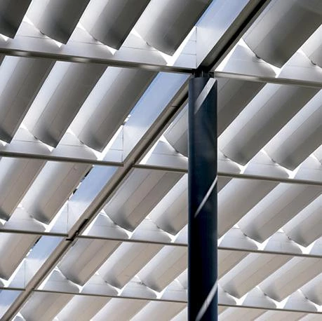 En el área pública bajo la marquesina, salpicada por árboles autóctonos, se crea un microclima fresco que forma parte de las estrategias de climatización pasivas del edificio. El pavimento de este espacio refleja la retícula del umbráculo situado sobre él con un patrón ortogonal, que hace referencia a la geometría de la trama urbana de Dallas.
