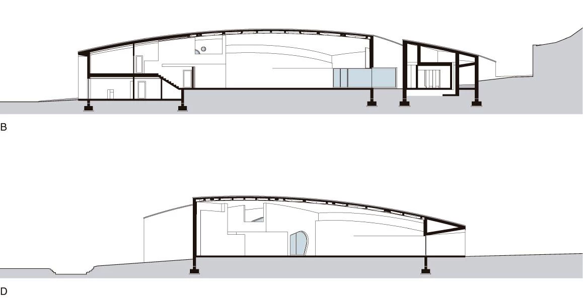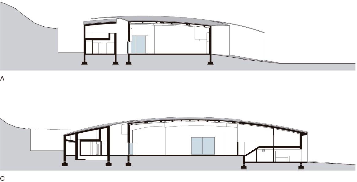 Un conjunto de muros curvos interseca con una cubierta también curva, encerrando un espacio dinámico que combina superficies cóncavas y convexas. El programa es escueto: una gran sala polivalente, una pequeña oficina para la policía y un conjunto de aseos para los visitantes del parque. Tanto los servicios como la oficina ocupan una posición anexa y ambos cuentan con entradas independientes desde el exterior. El espacio central queda por tanto libre de obstáculos y se percibe como un espacio continuo, caracterizado por los matices que genera la luz al resbalar por las distintas superficies curvas. Una escalera encajada en el volumen saliente da acceso a una sala de reuniones situada en una entreplanta superior que se asoma a través de un hueco rectangular al espacio principal. A excepción de las puertas acristaladas y dos pequeñas ventanas, los muros son prácticamente ciegos, aislando el edificio de su entorno y concentrando la atención en el interior del pabellón.