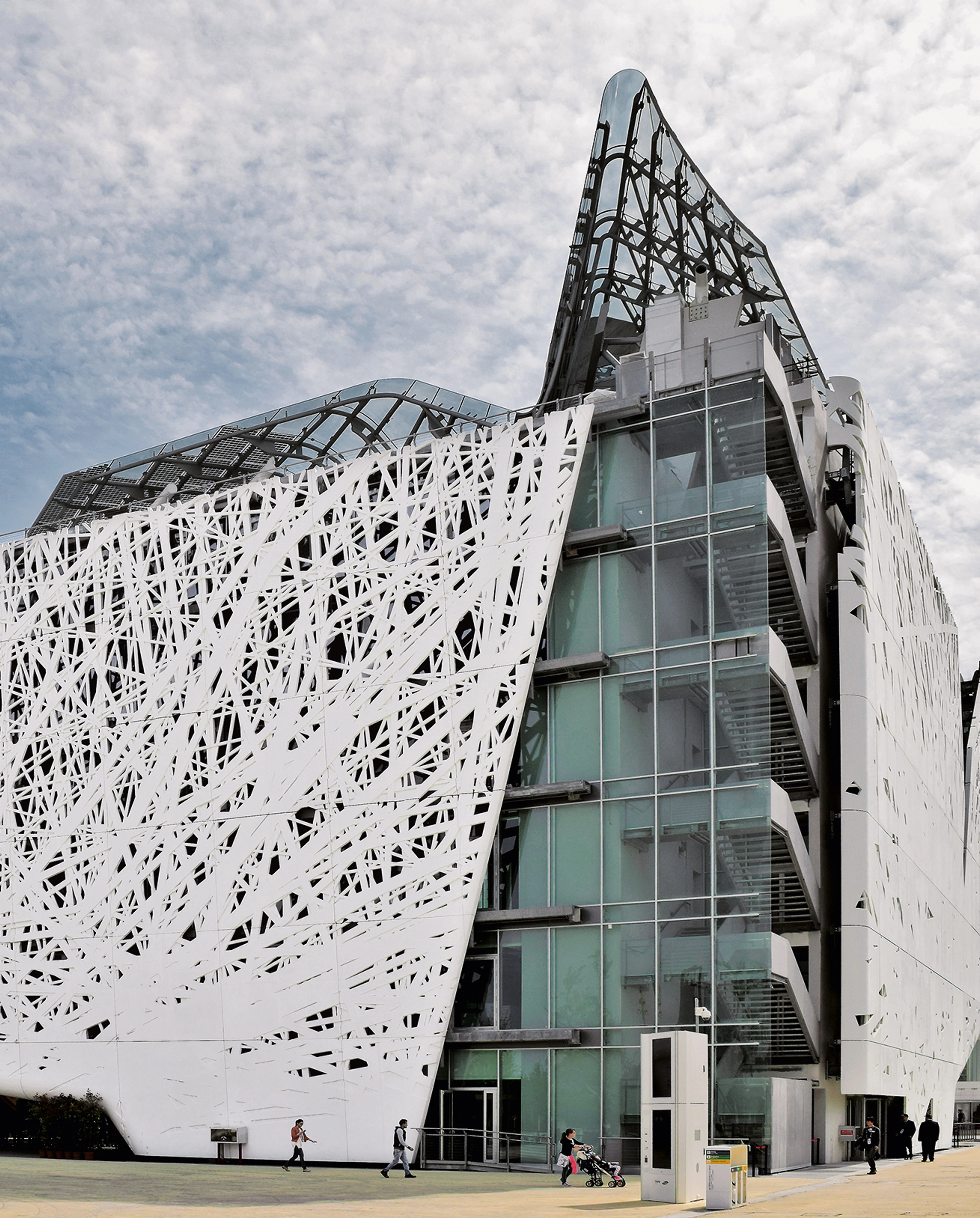 Rodeado por una plaza diáfana, el ‘Palazzo Italia’ se levanta como el fondo escénico en el que culmina el cardo en su extremo Norte. Asumiendo, por su masa y su arquitectura, el papel de hito en la explanada expositiva, el pabellón remite, tanto en su forma como en su actividad ecológica, a la metáfora de un bosque. Como si fuesen cuatro tocones, los pilares que sostienen al edificio se apoyan masivamente sobre el terreno, generando así una grieta de acceso en la planta baja que desemboca en el gran vacío que ocupa el corazón del conjunto. Según se va desarrollando verticalmente, la piel blanca que reviste estos elementos se ramifica paulatinamente, sugiriendo un tipo de figuración que es a la vez elemental y tecnológica.