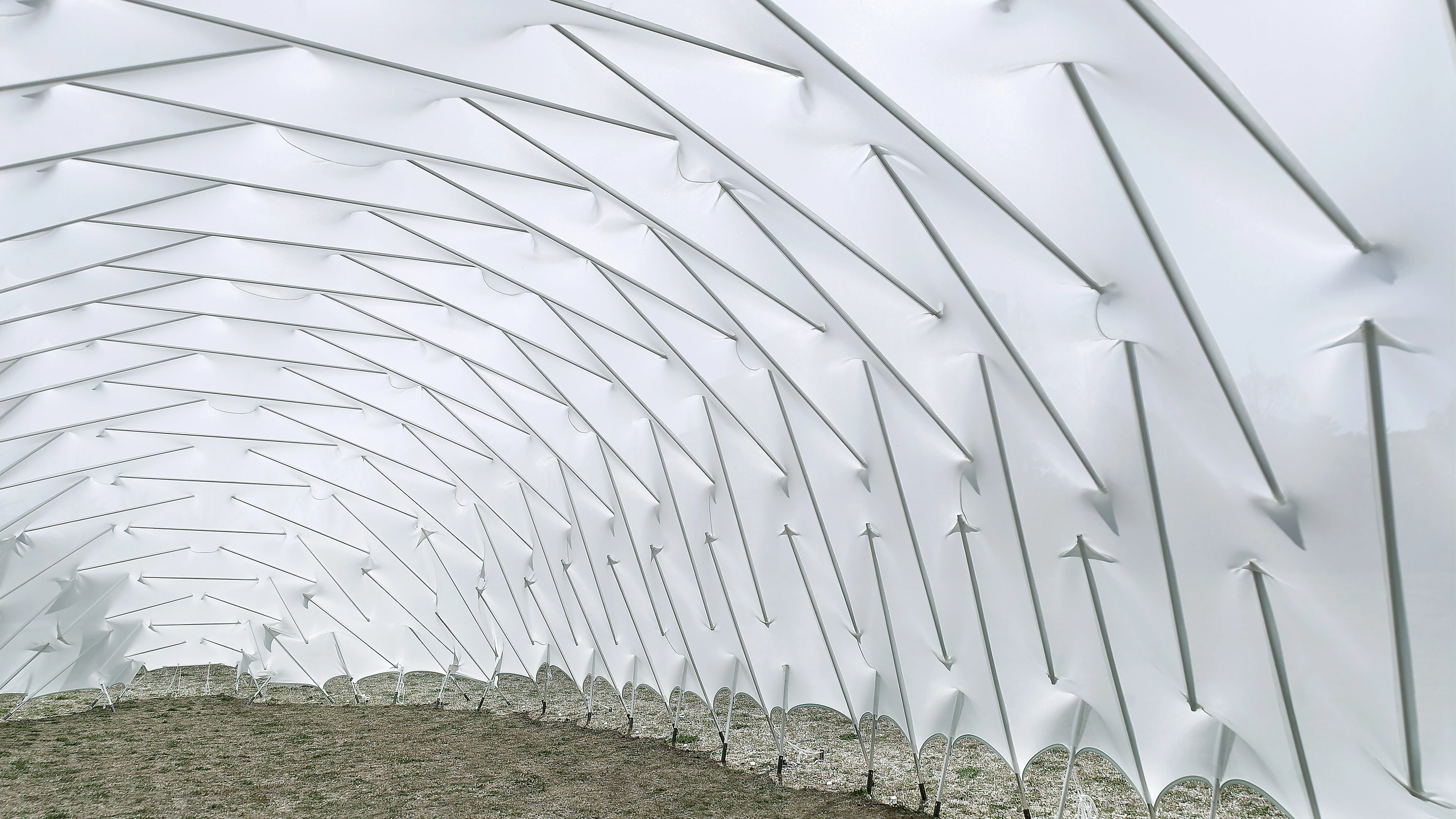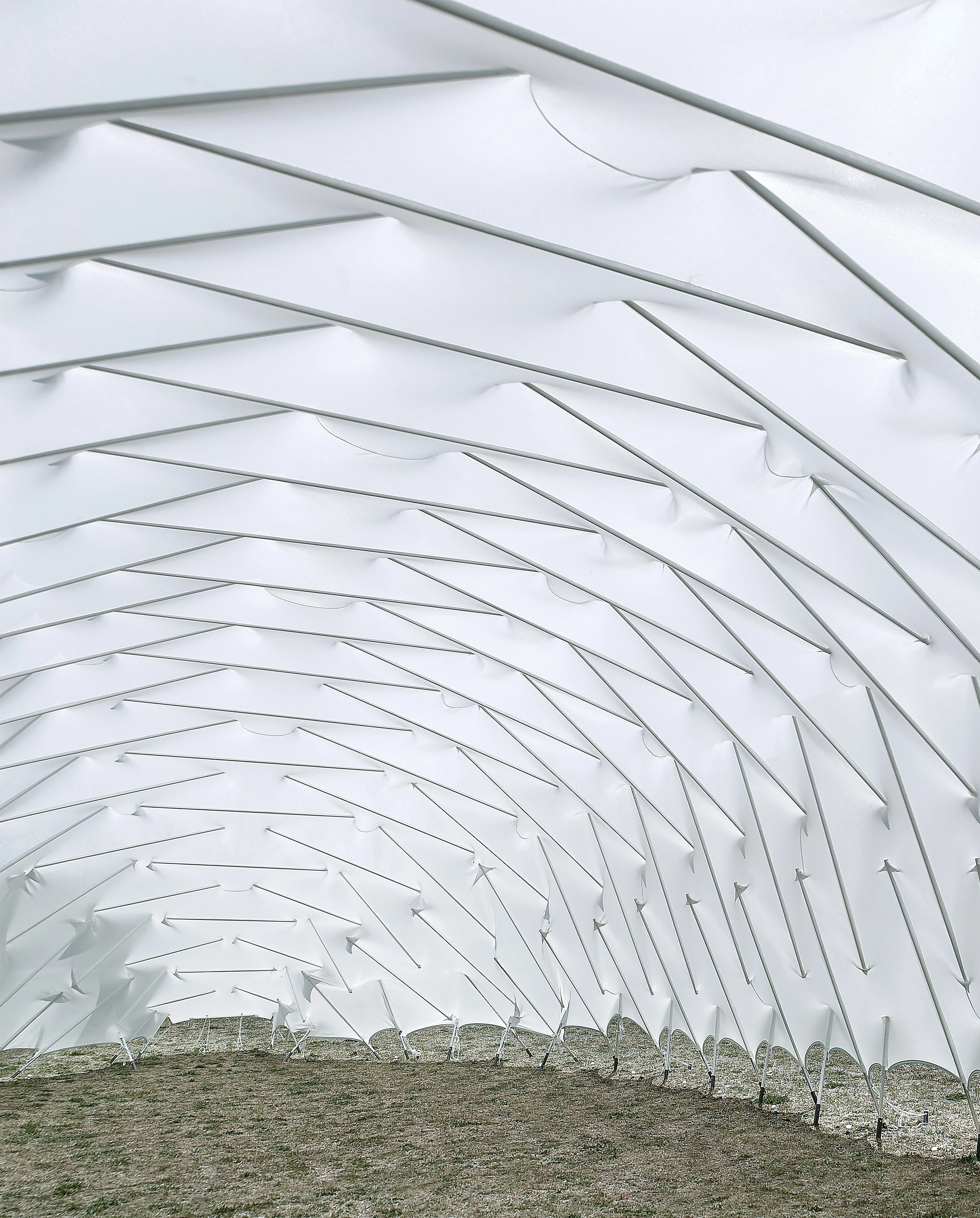 Desarrollada por un equipo multidisciplinario de arquitectos e ingenieros, e instalada por un grupo de estudiantes, la membrana de tensegridad con la que se cubre la superficie de 146 metros cuadrados del pabellón, se ha diseñado a partir de tres criterios fundamentales. En primer lugar, la búsqueda de la ligereza, que permitiese la optimización del empleo del material. En segundo lugar, la sencillez del método de izado, de tal modo que fuese posible montar el sistema contando con sólo tres elementos: el material plástico de la membrana (dotado de ‘bolsillos’ para la fijación de las barras), las propias barras metálicas y los cabos de acero para la sujeción de la membrana al suelo. Finalmente, el desmontaje fácil y limpio del sistema, de manera que no deje ninguna huella permanente en su entorno.