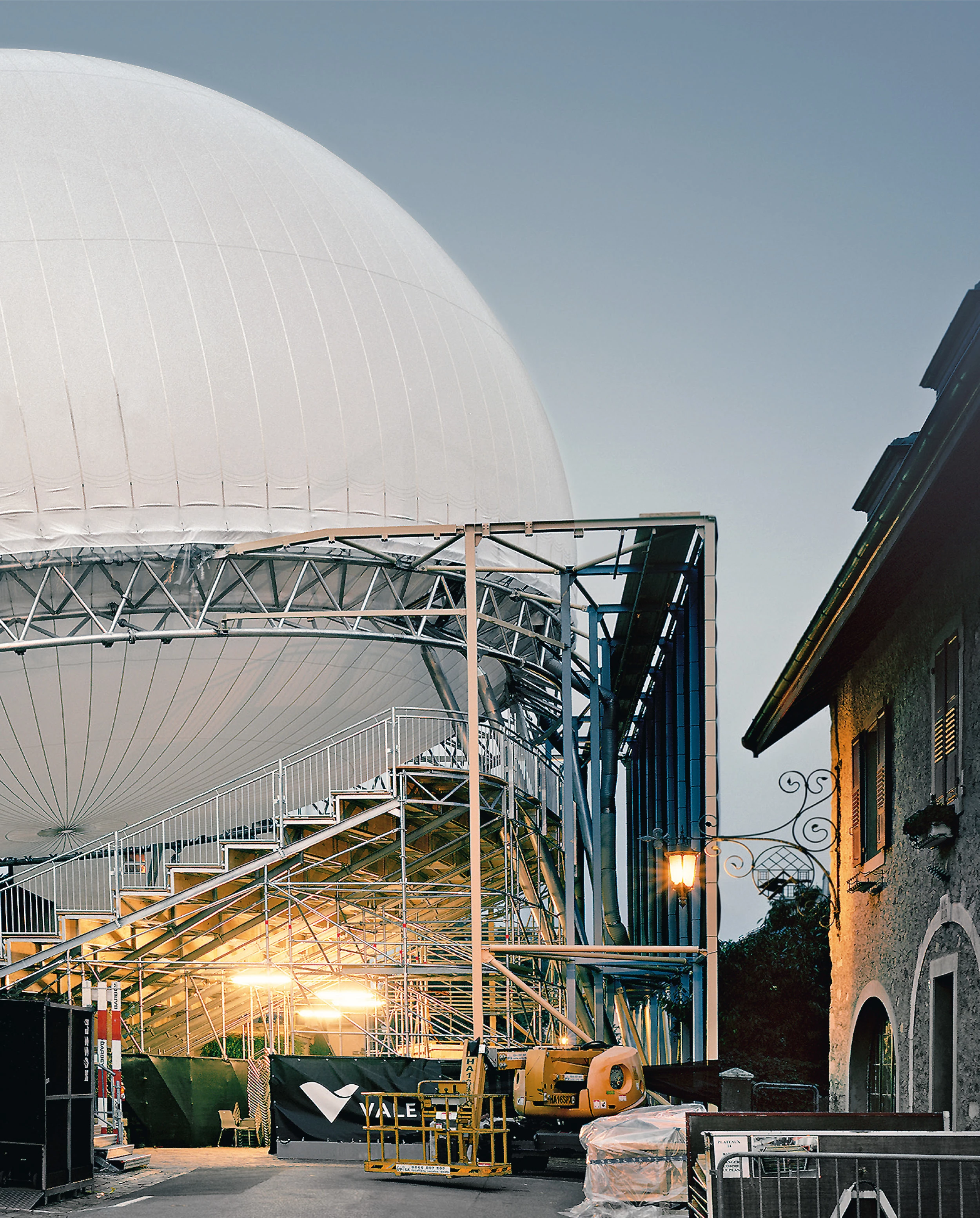 Los días de lluvia se hace descender el globo, que pasa a descansar directamente sobre una estructura perimetral, a modo de cúpula evanescente pero con buenas propiedades acústicas. Formada por una celosía y delgados soportes de aluminio, la estructura sirve también para sujetar una cortina envolvente e impermeable.