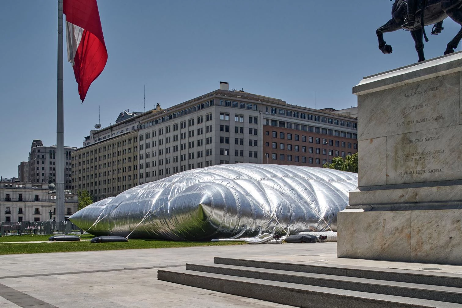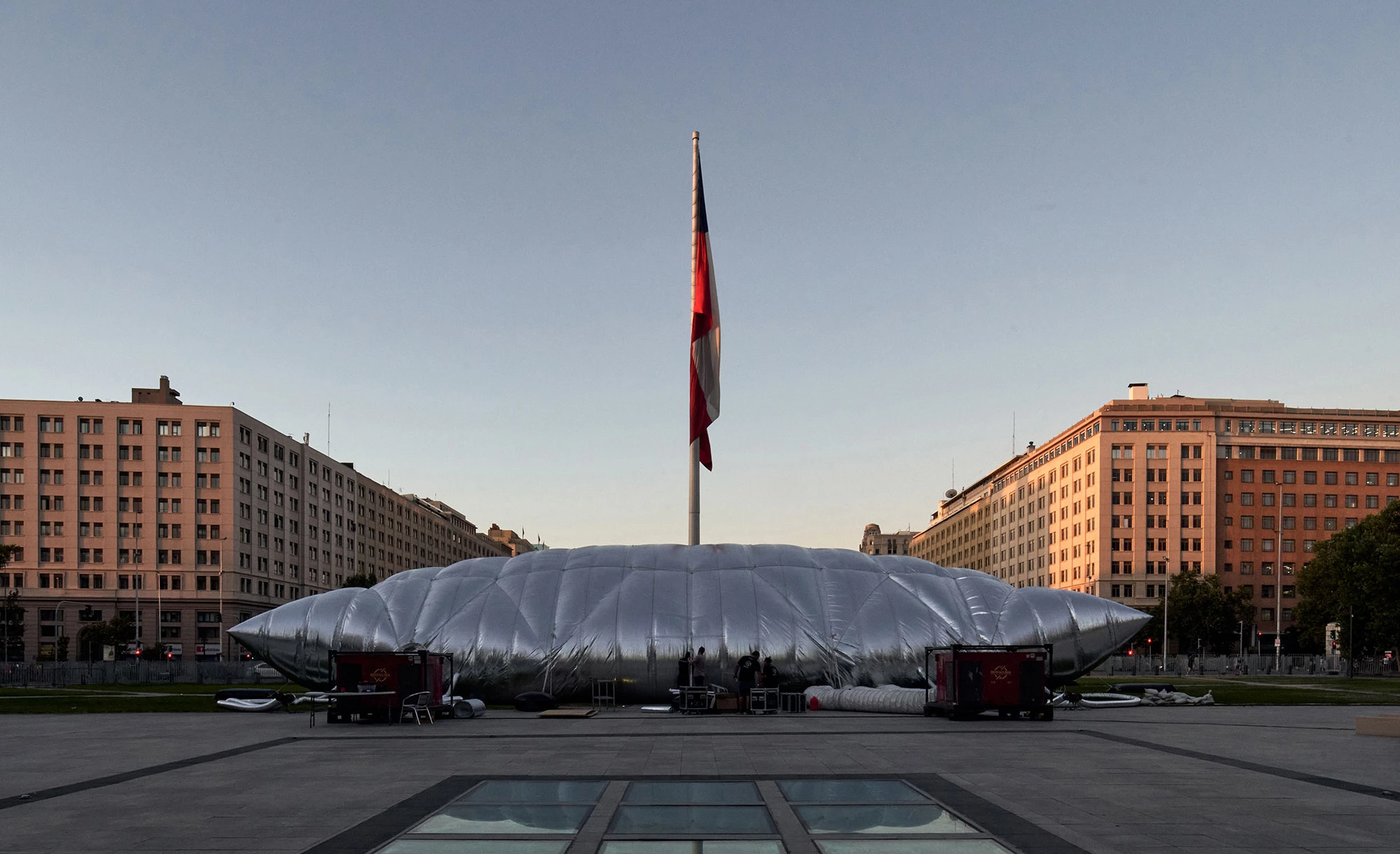 Ubicada cerca del Palacio de la Moneda de Santiago, en la plaza Bulnes, esta estructura inflable acogió el acto inaugural de la XXII Bienal de Arquitectura y Urbanismo de Chile, celebrada entre el 14 al 22 de enero de 2023, bajo el lema ‘Hábitats vulnerables’.