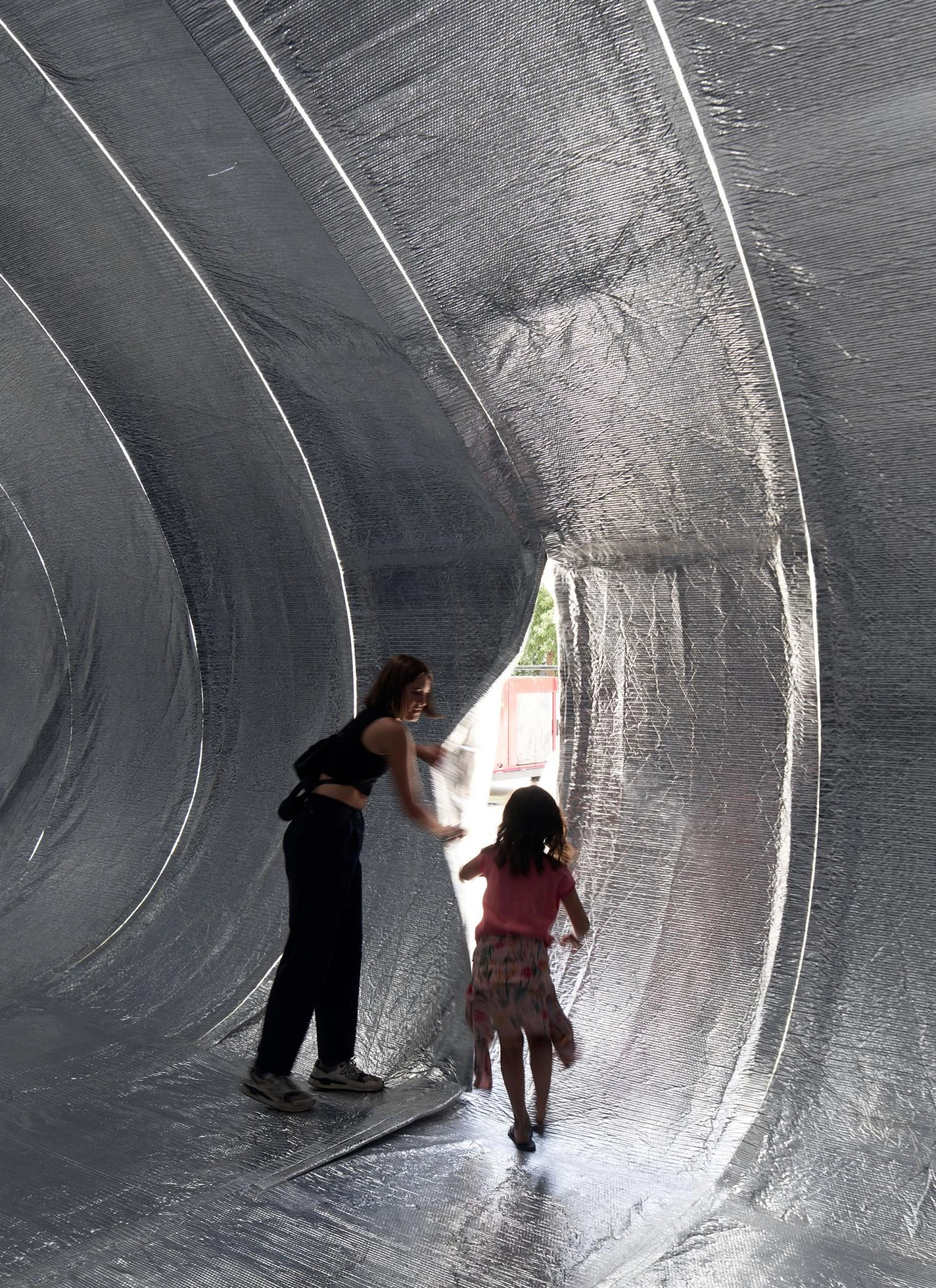 Con 30 metros de largo y más de 20 de ancho, la instalación hinchable y plateada estaba alimentada por ocho ventiladores para poder alcanzar 6 metros de alto y dar forma a un auditorio temporal con capacidad para 250 personas.